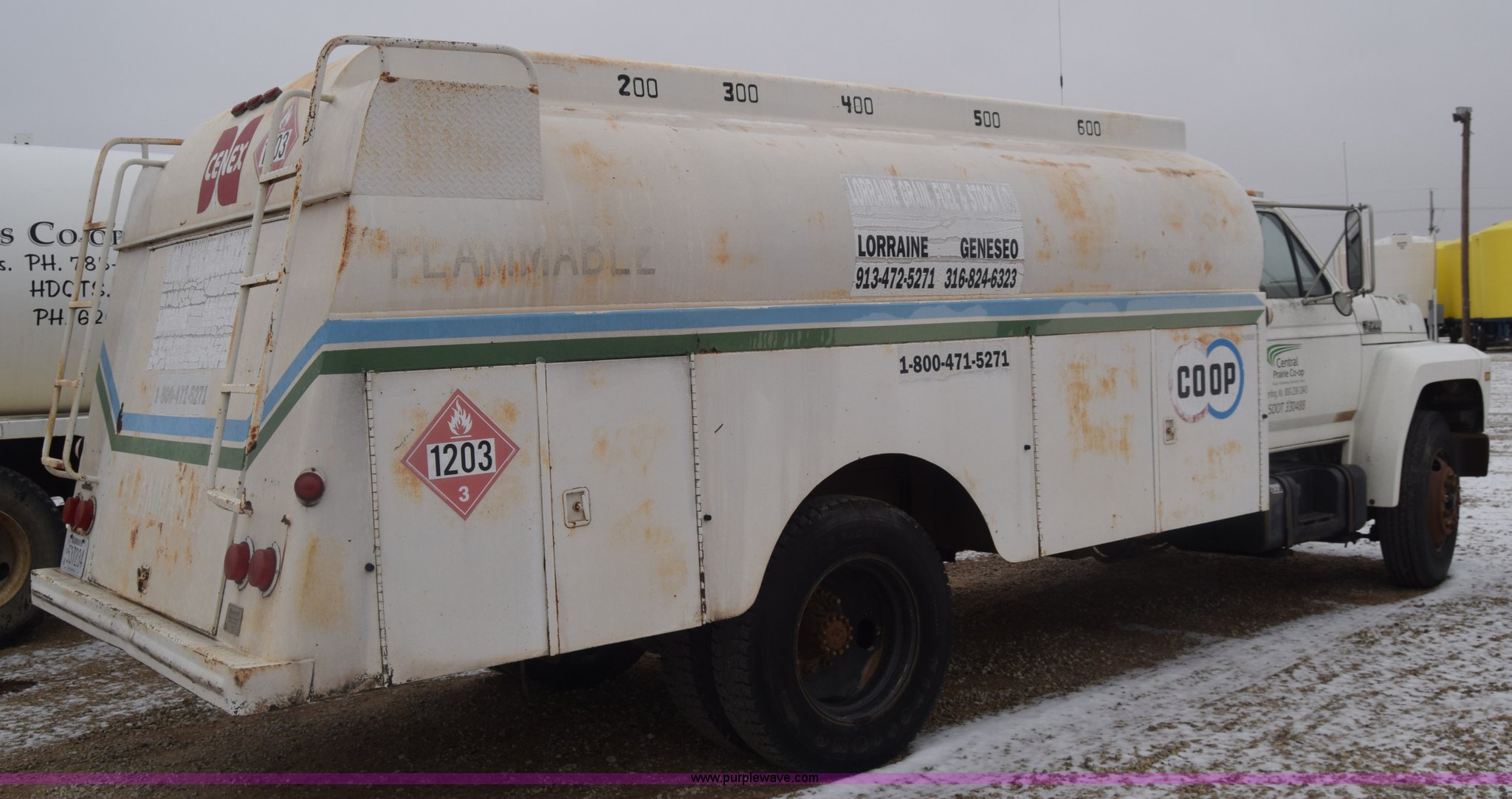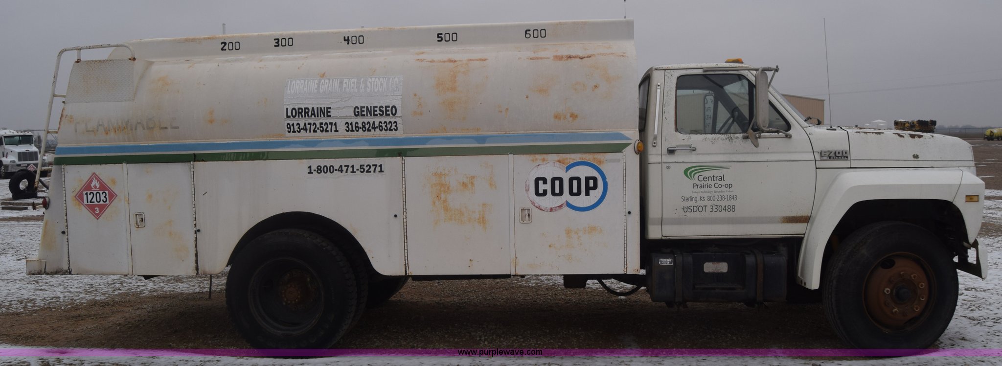 Purple Wave is selling a used Fuel Truck in Kansas. This item is a 1988 Ford F700 fuel truck with the following: 101,677 miles on odometer, 7.8L L6 diesel engine, Automatic transmission, Single axle, AC and heat, AM/FM, PTO, 15'L bed, Tri-State fuel tank, (5) compartments, 2,000 gallon capacity, (2) hose reels, (2) Neptune metered pumps, Nozzles, Dual fuel tanks, Spring suspension, Hydraulic brakes, 189" wheelbase, 10R22.5 tires, GVWR 26,500 lbs, CB radio not included, will be removed prior to auction