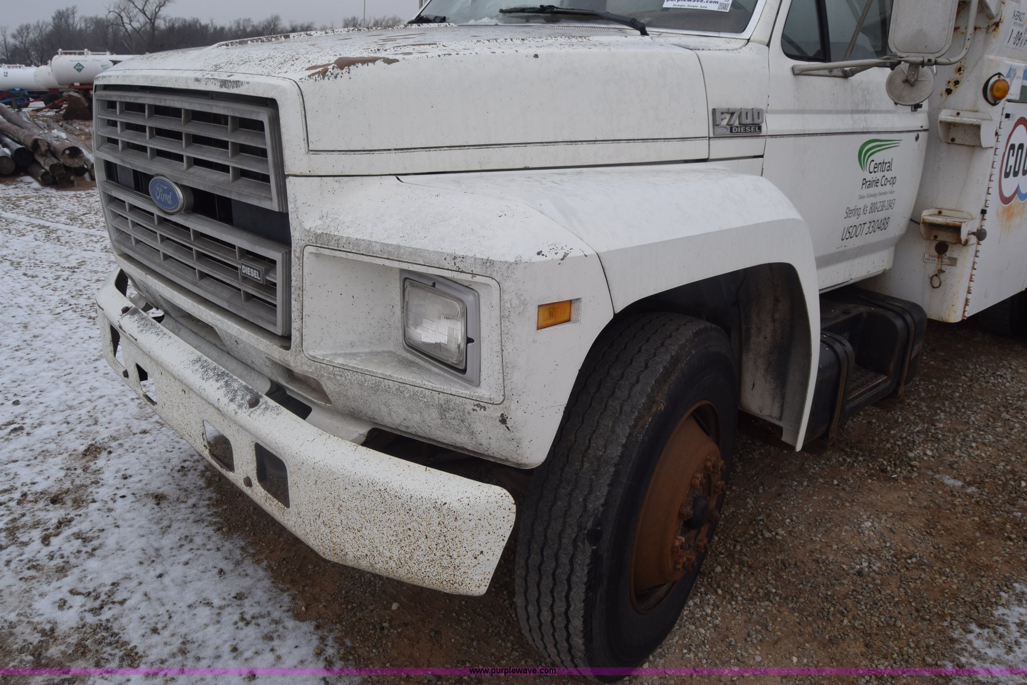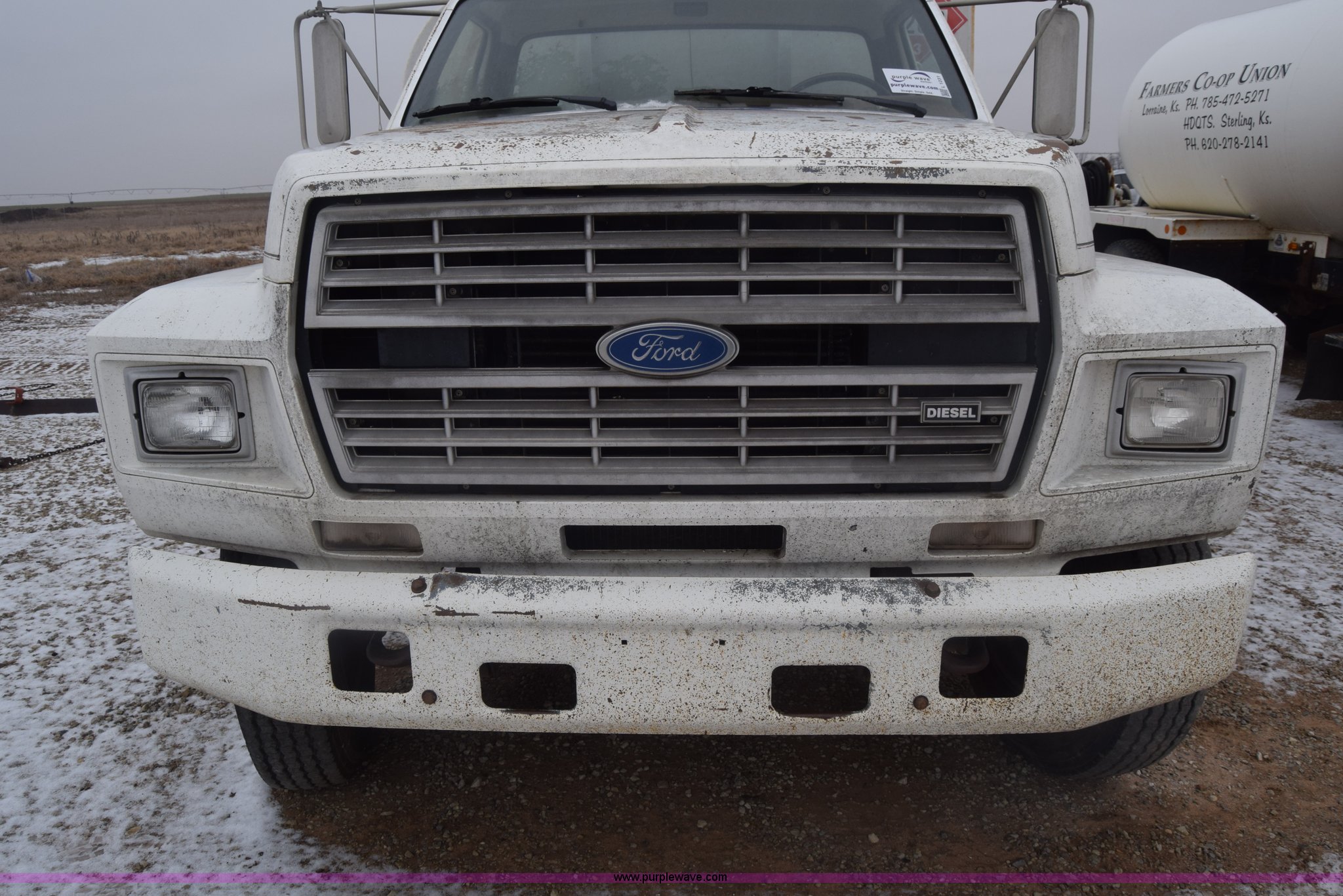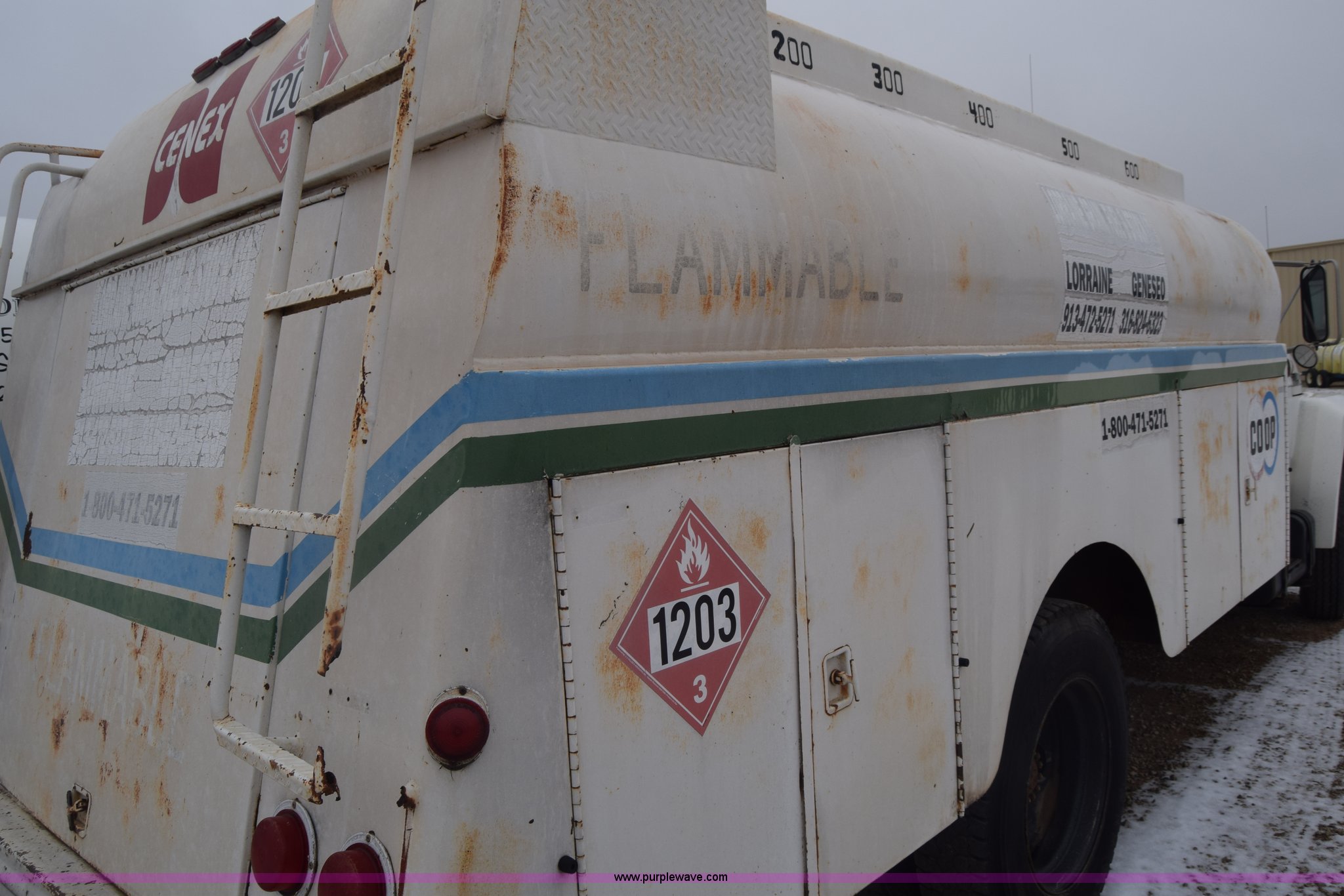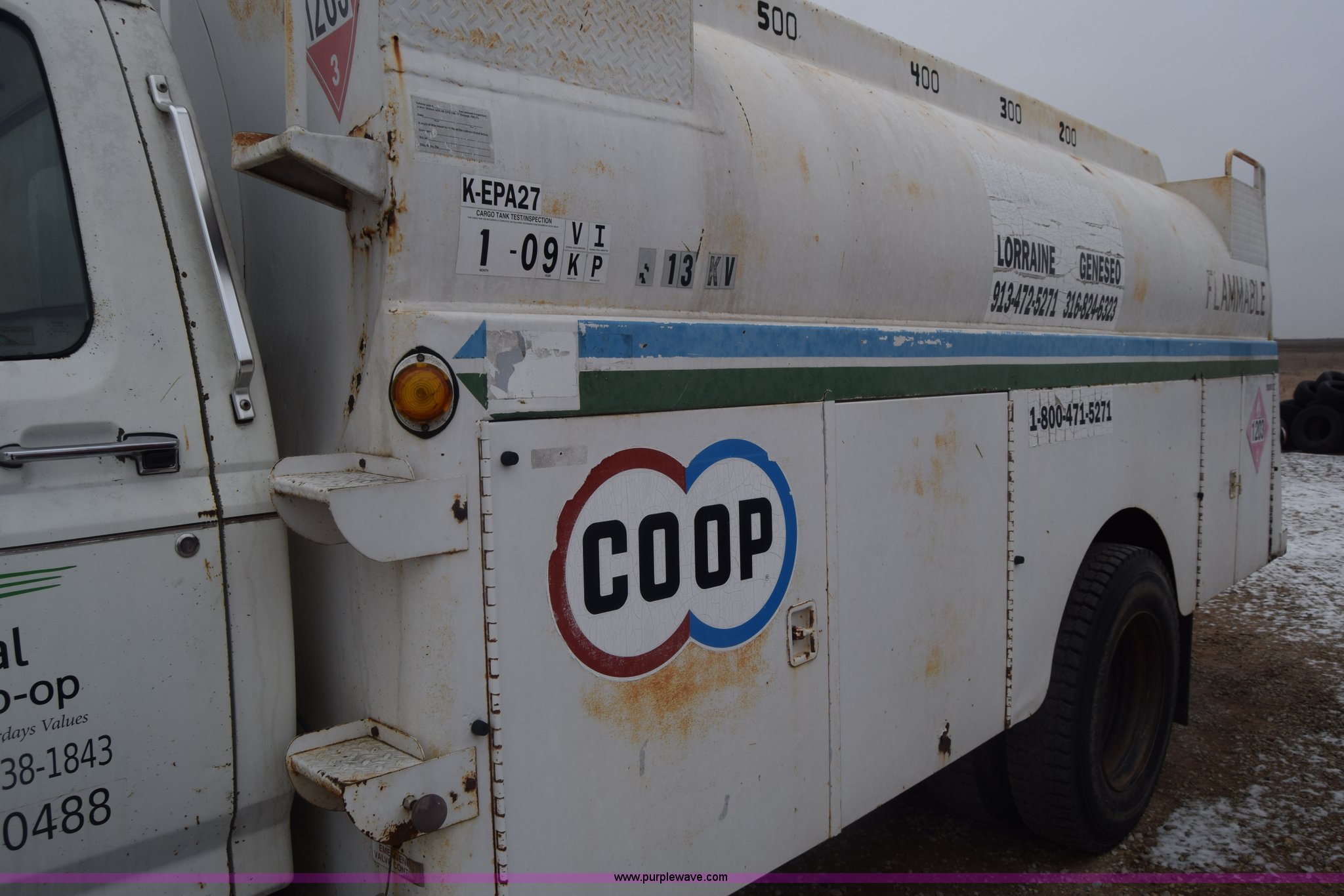 1988 Ford F700 fuel truck. 101,677 miles on odometer, 7.8L L6 diesel engine, Automatic transmission, Single axle, AC and heat, AM/FM, PTO, 15'L bed, Tri-State fuel tank (5) compartments, 2,000 gallon capacity, (2) hose reels, (2) Neptune metered pumps, Nozzles, Dual fuel tanks, Spring suspension, Hydraulic brakes, 189" wheelbase, 10R22.5 tires, GVWR 26,500 lbs, CB radio not included, will be removed prior to auction. 1FDPK74A3JVA54882. Central Prairie Coop. 1775 State Route 14. Sterling, KS 67579