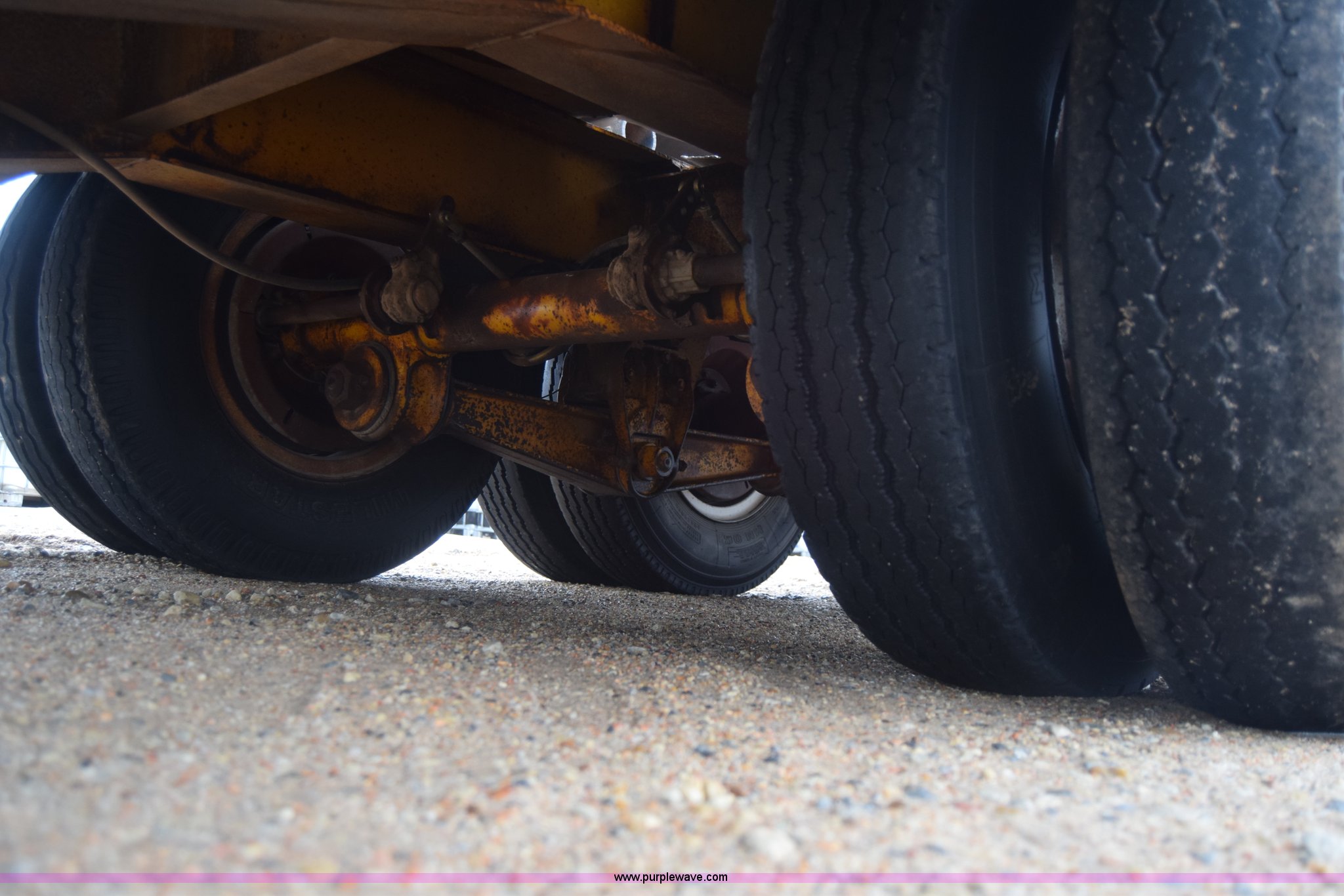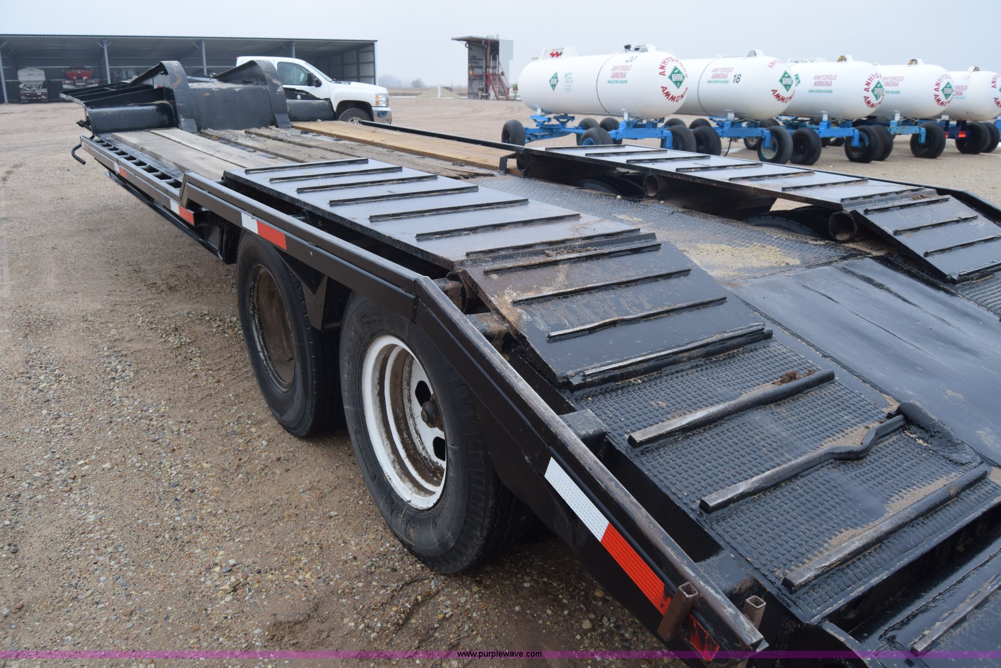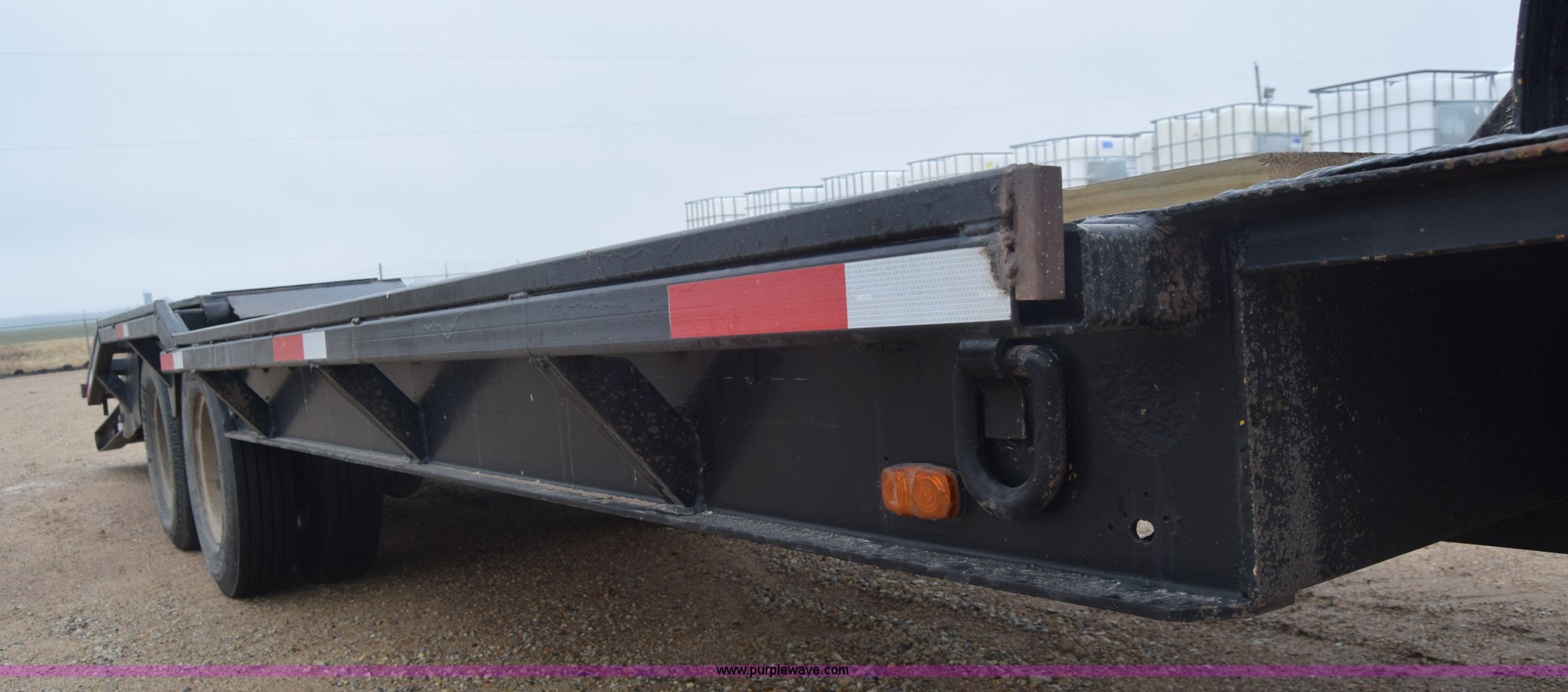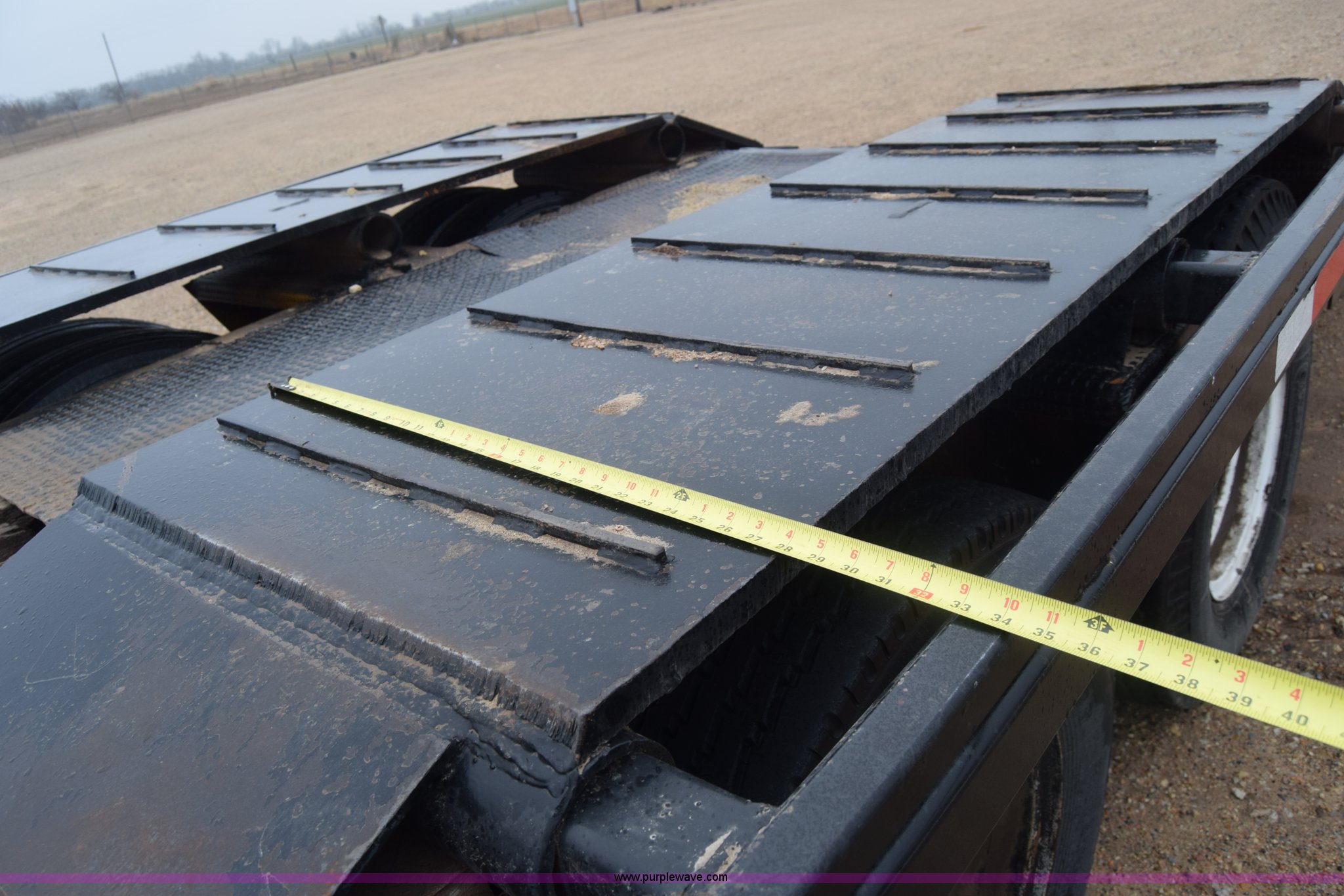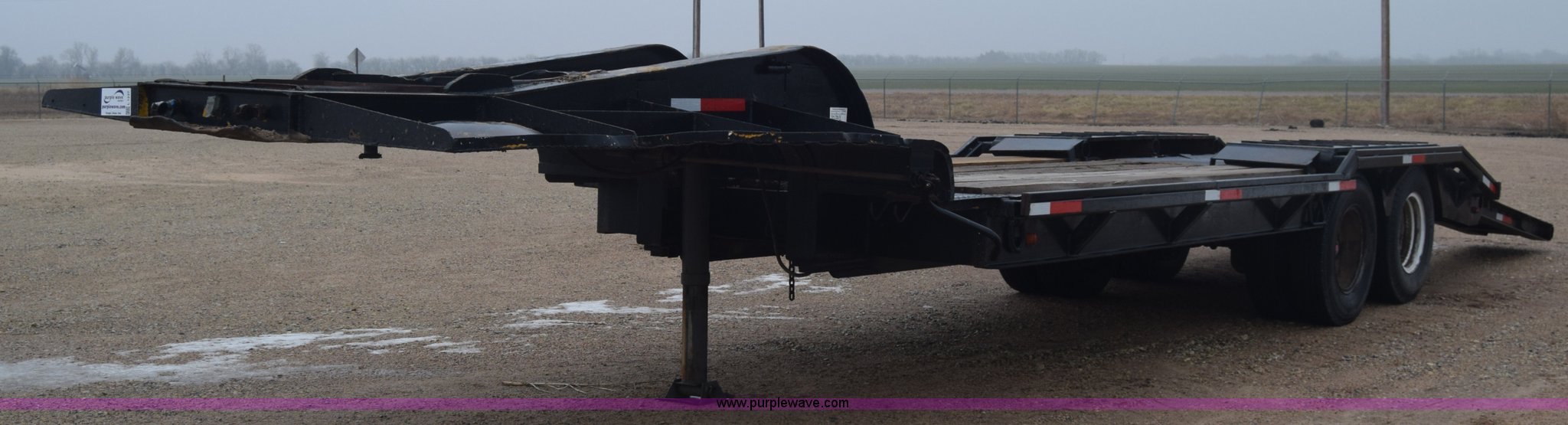 Purple Wave is selling a used Equip. Trailer in Kansas. This item is a 1955 Mart equipment trailer with the following: 35'L x 9'W overall, 25'L deck, D-ring tie downs, 8'L x 28" steel fold down ramps, Wood floor, Fifth wheel hitch, Air brakes, Tandem axle, 9.00-20 tires