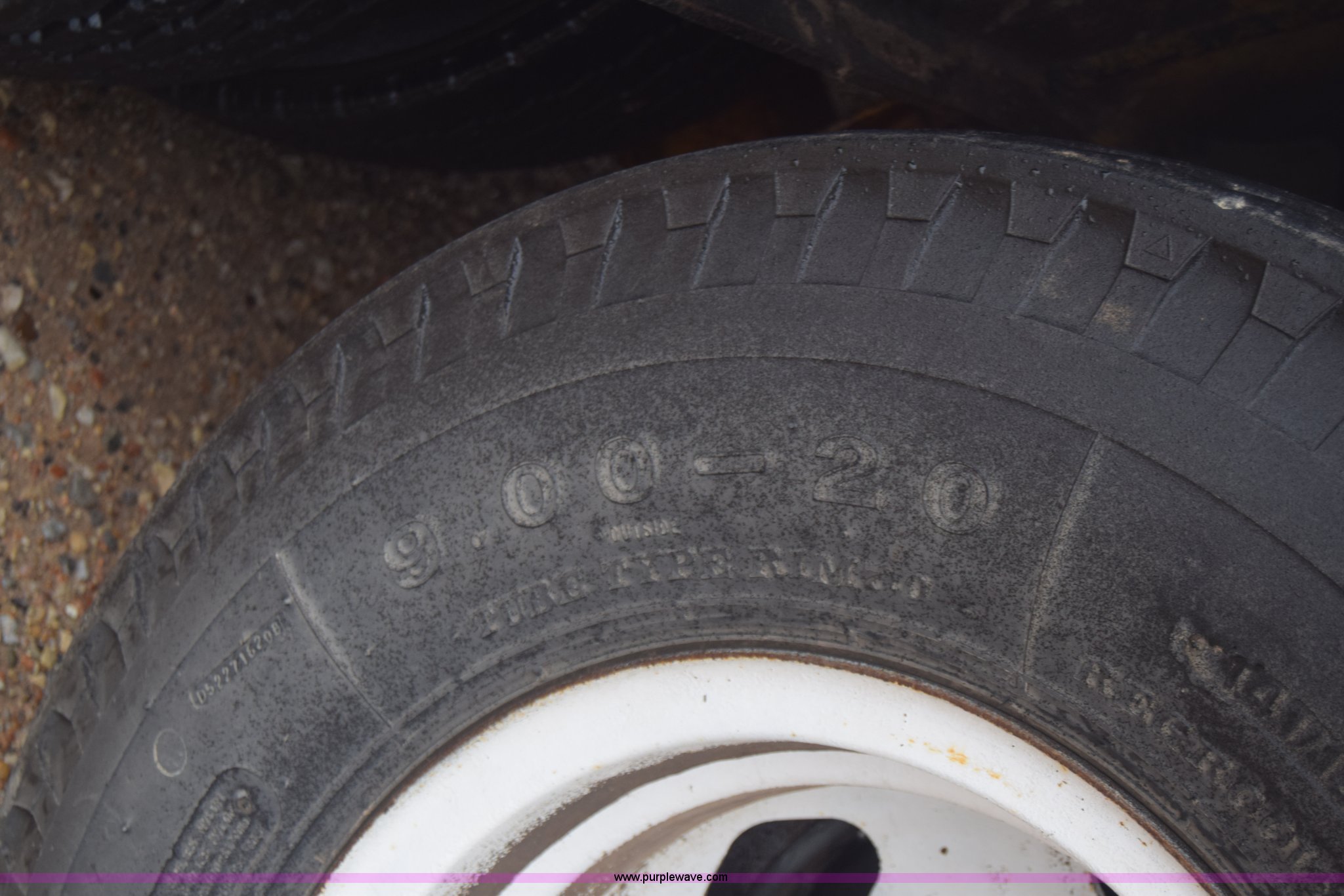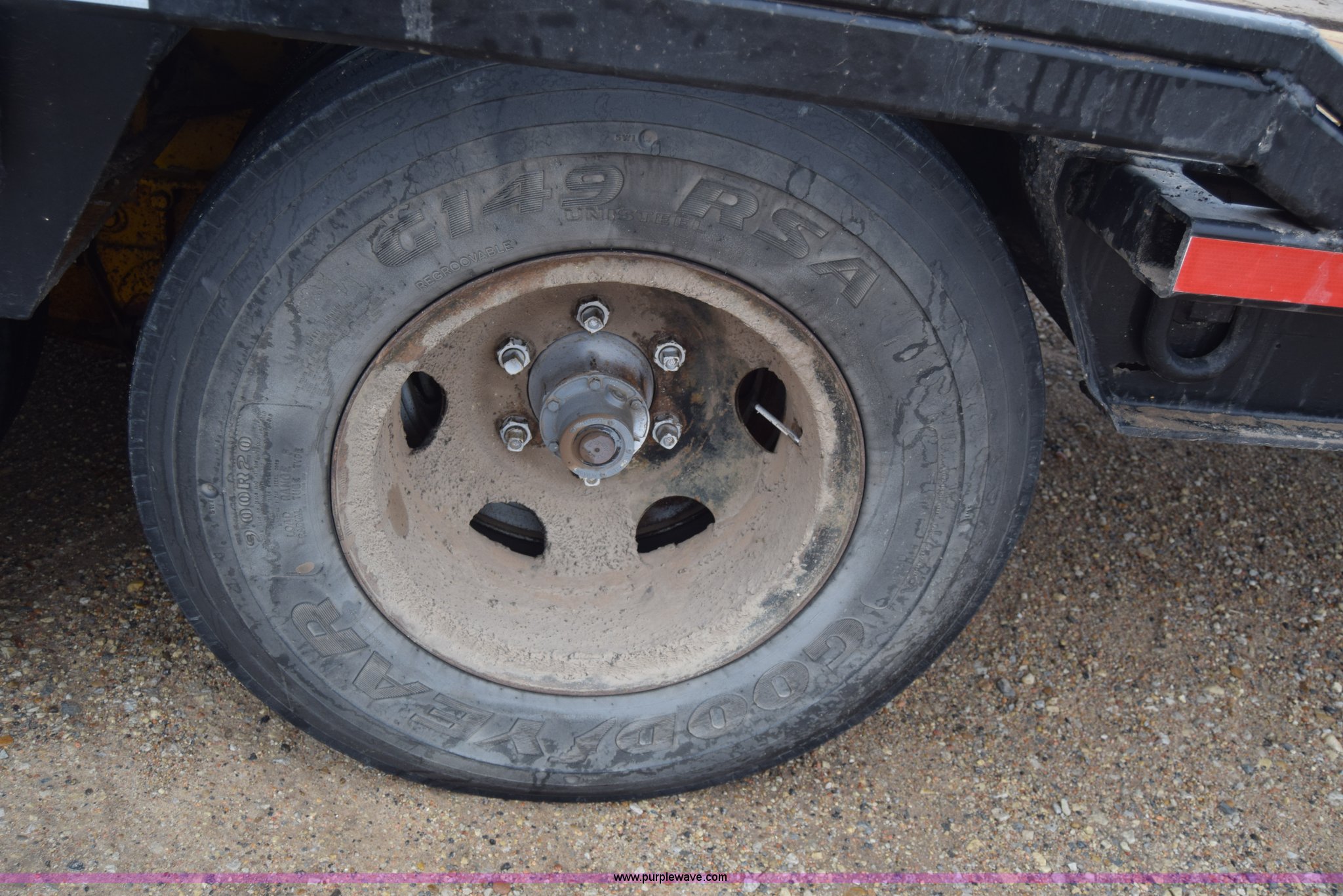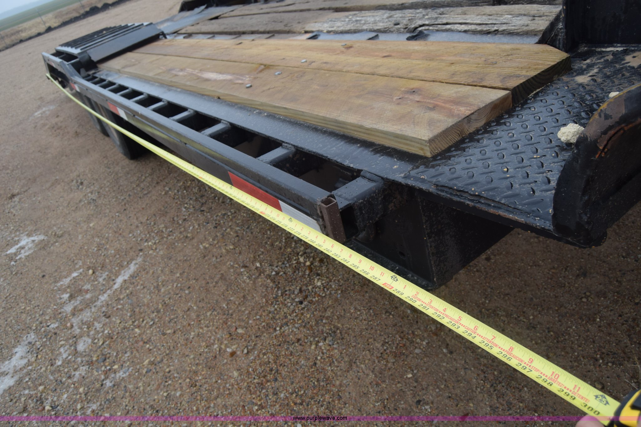 1955 Mart equipment trailer. 35'L x 9'W overall, 25'L deck, D-ring tie downs, 8'L x 28" steel fold down ramps, Wood floor, Fifth wheel hitch, Air brakes, Tandem axle, 9.00-20 tires. 6433. Central Prairie Coop. 1775 State Route 14. Sterling, KS 67579