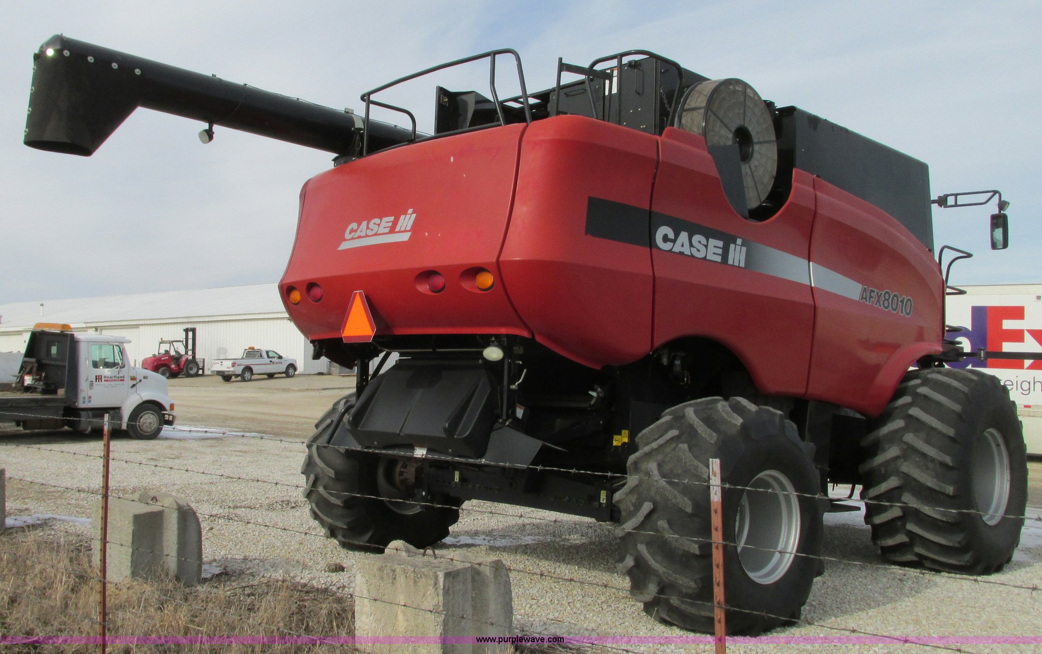 Purple Wave is selling a used Combine in Missouri. This item is a 2004 Case IH AFX 8010 RWA combine with the following: 2,701 engine hours on meter, Case IH 10.3L diesel engine, Hydrostatic transmission, Feeder house, Reverser, Single point header coupler, AC and heat, AM/FM, Spring suspension seat, Instructor's seat, Shades and visors, Bin extension, Straw chopper, Straw spreader, Auger extension, Yield monitor, 300 bushel bin capacity, 900/60R32 front tires, 28L-26 rear tires, Serial HAJ105525