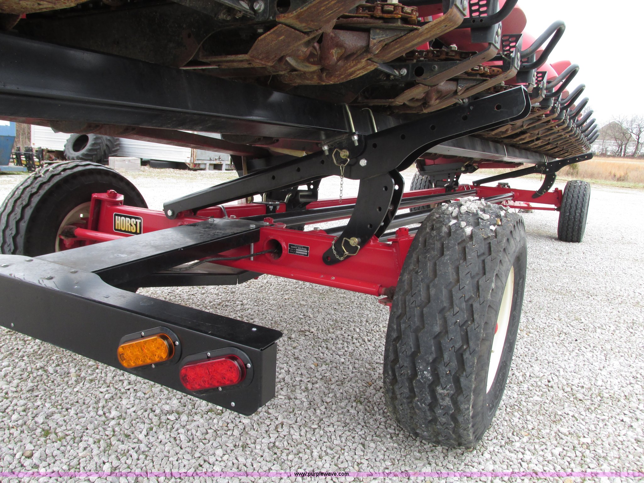 Horst CHCF header trailer. 30' to 45' head capacity, Adjustable height, Adjustable width plates, Tie down straps, Spring assisted tongue, Pin hitch, 11L15 tires, Head not included, Serial 130549. Wheatland, MO 65779