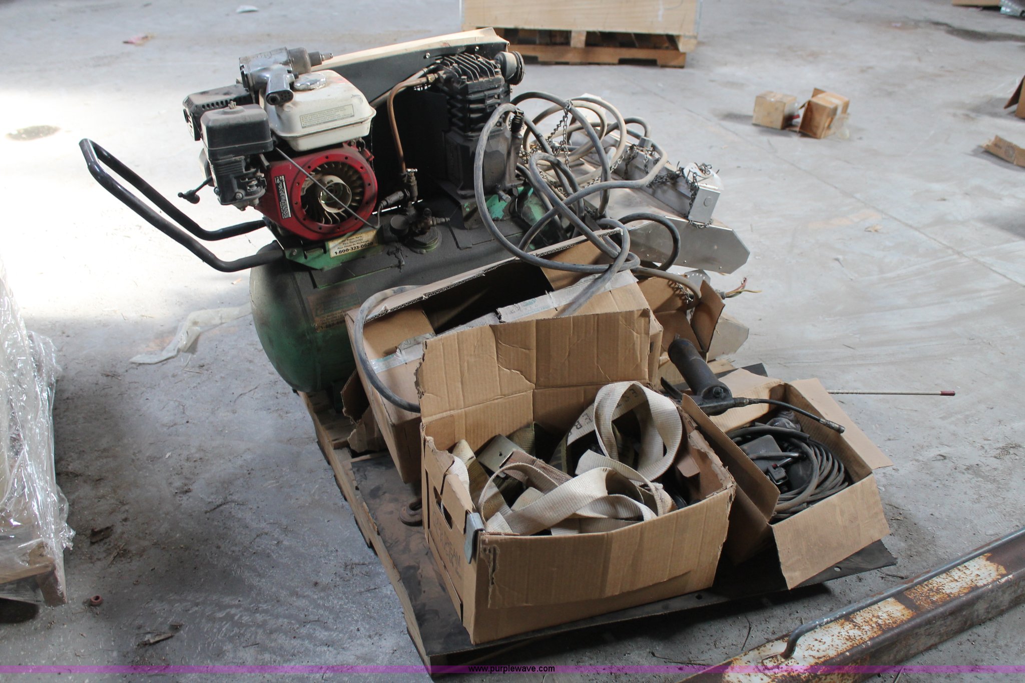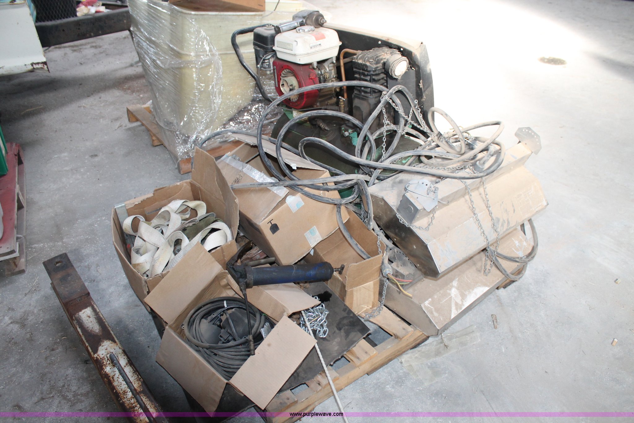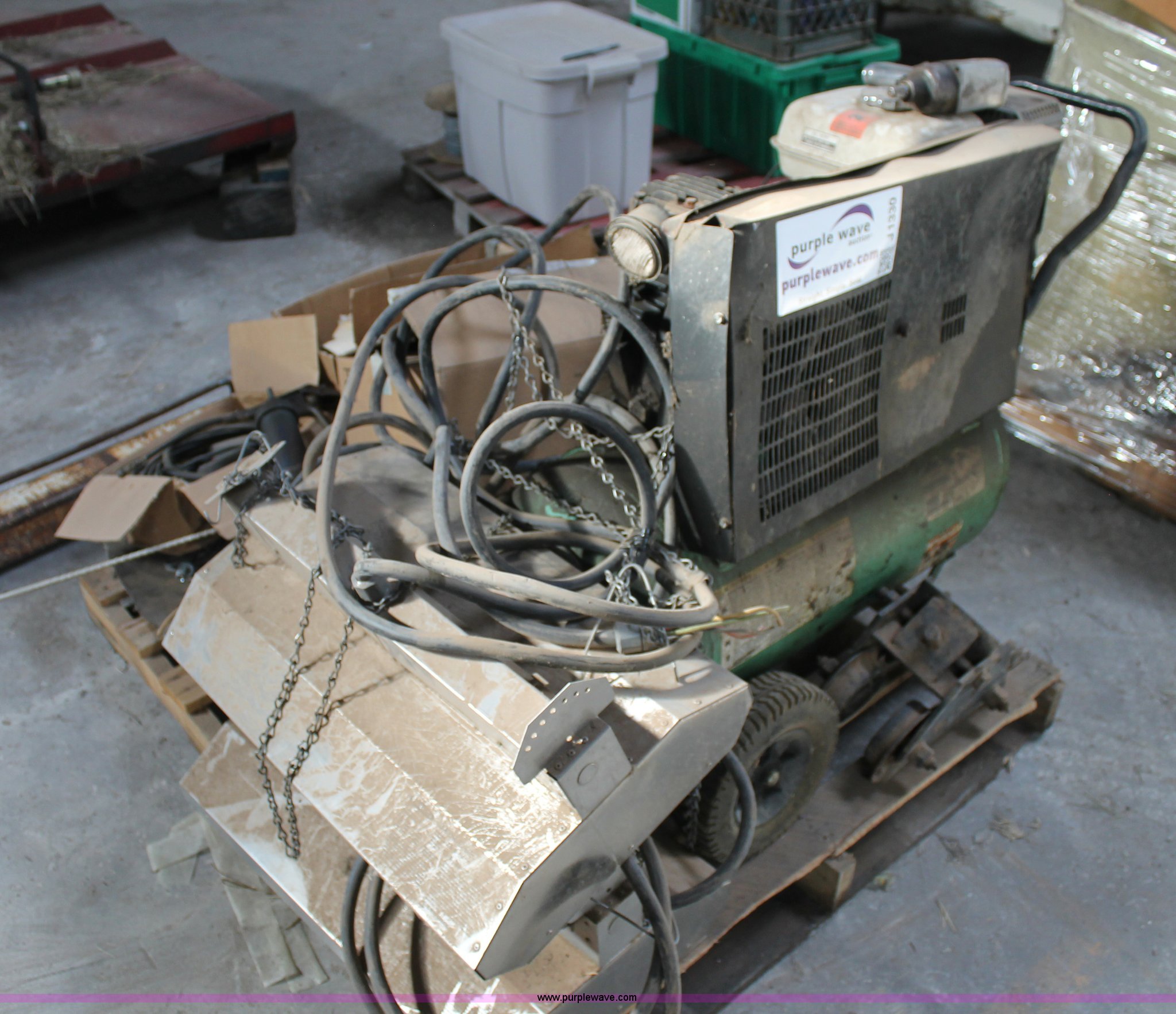 Purple Wave is selling a used Tools in Texas. This item is a Assorted tools with the following: Air compressor, Gas engine, Unknown operating condition, (2) heaters, Tractor lights, Straps, Push bar