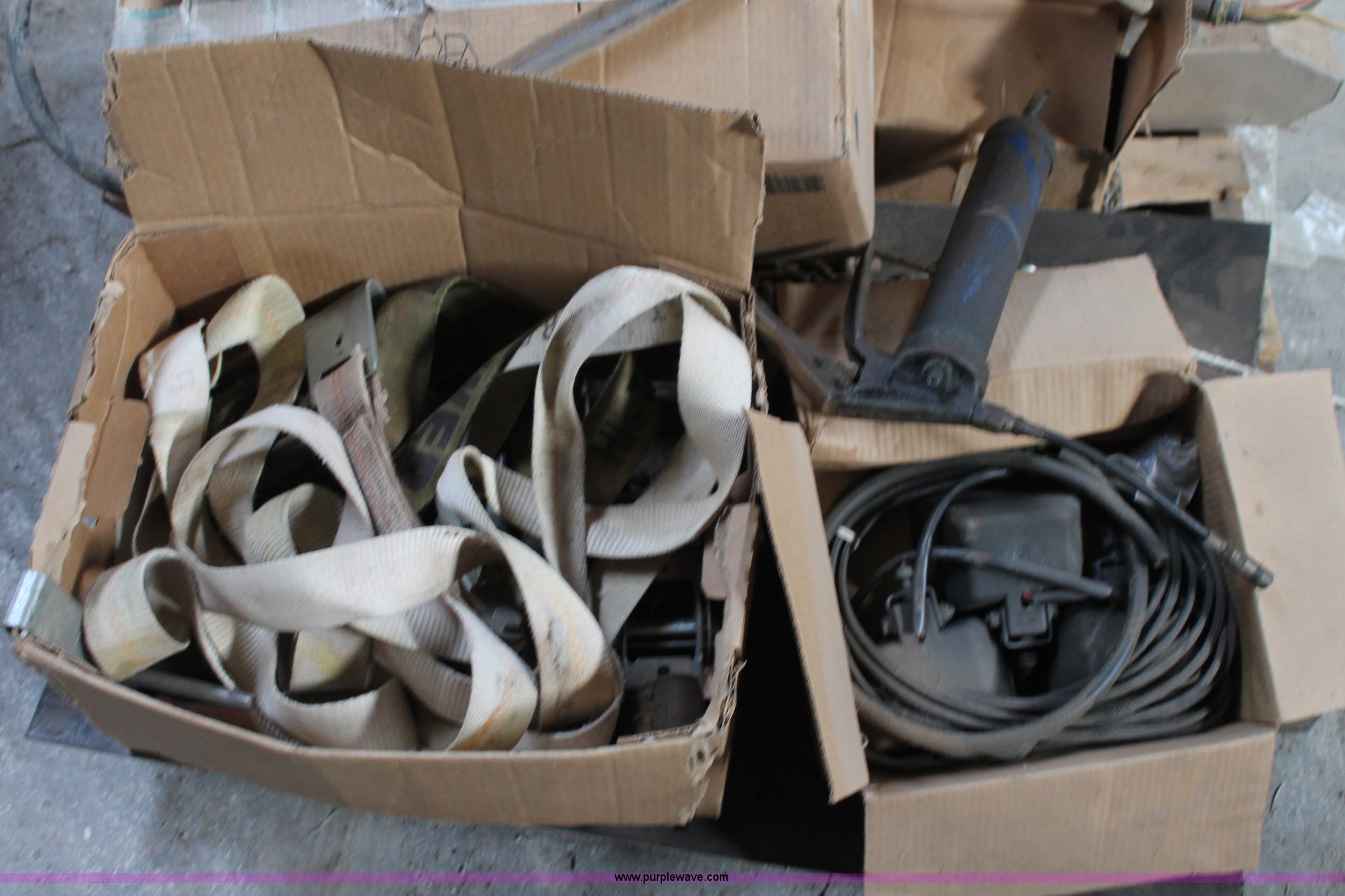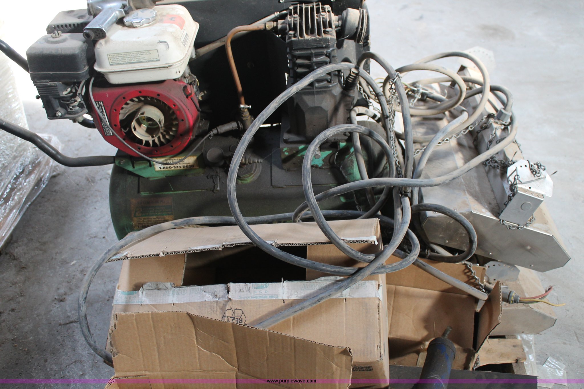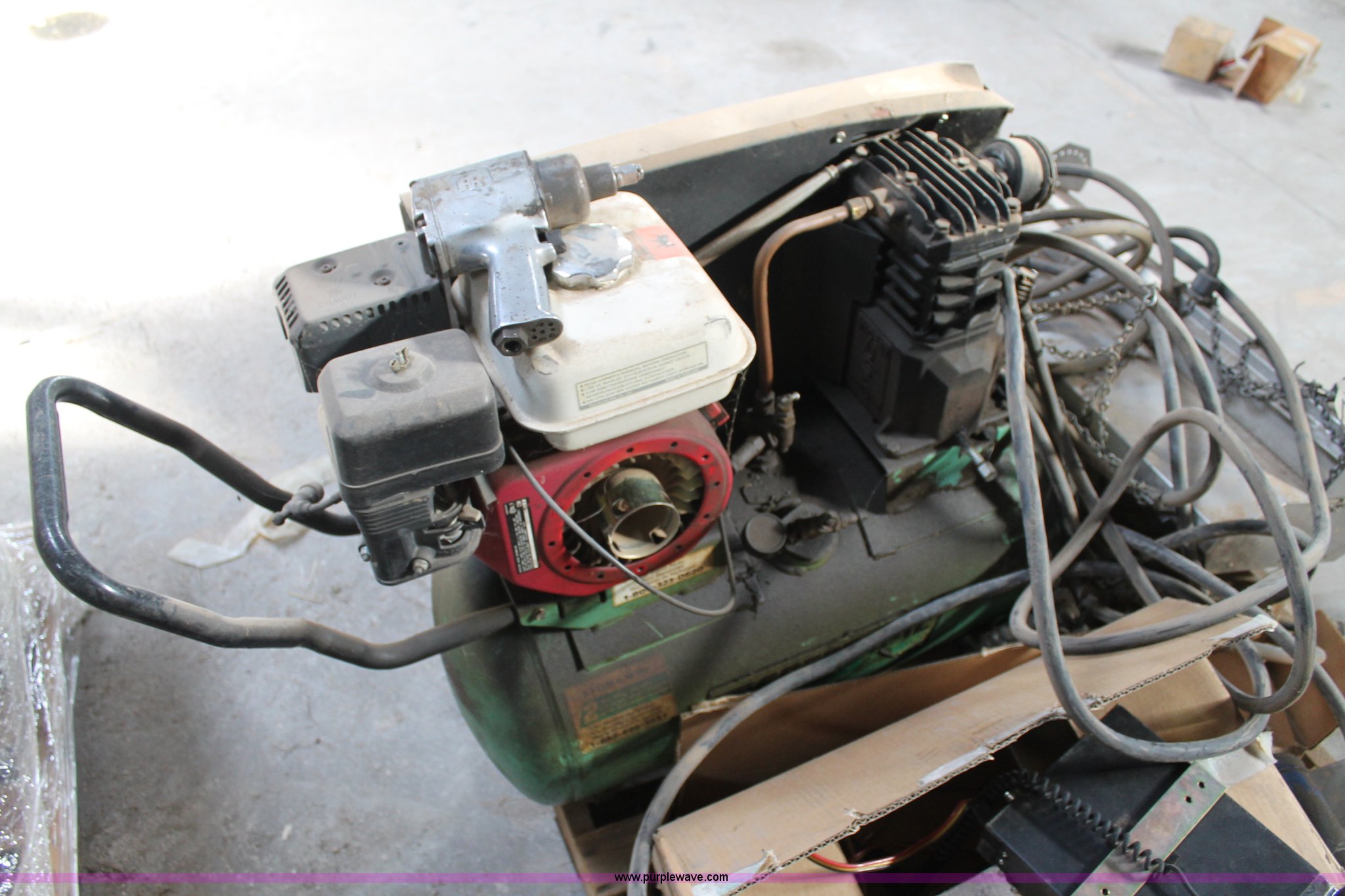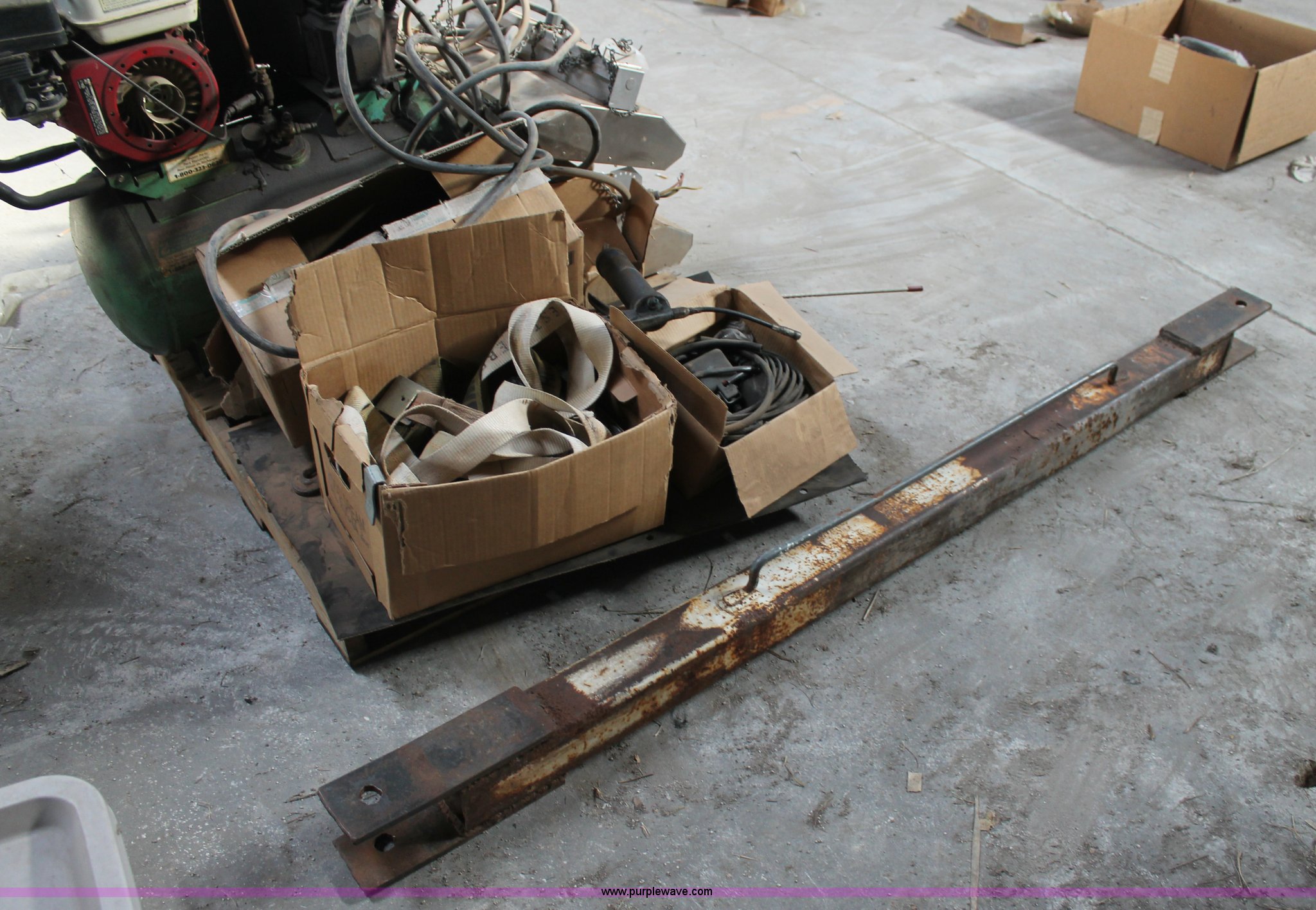 Purple Wave is selling a used Tools in Texas. This item is a Assorted tools with the following: Air compressor, Gas engine, Unknown operating condition, (2) heaters, Tractor lights, Straps, Push bar