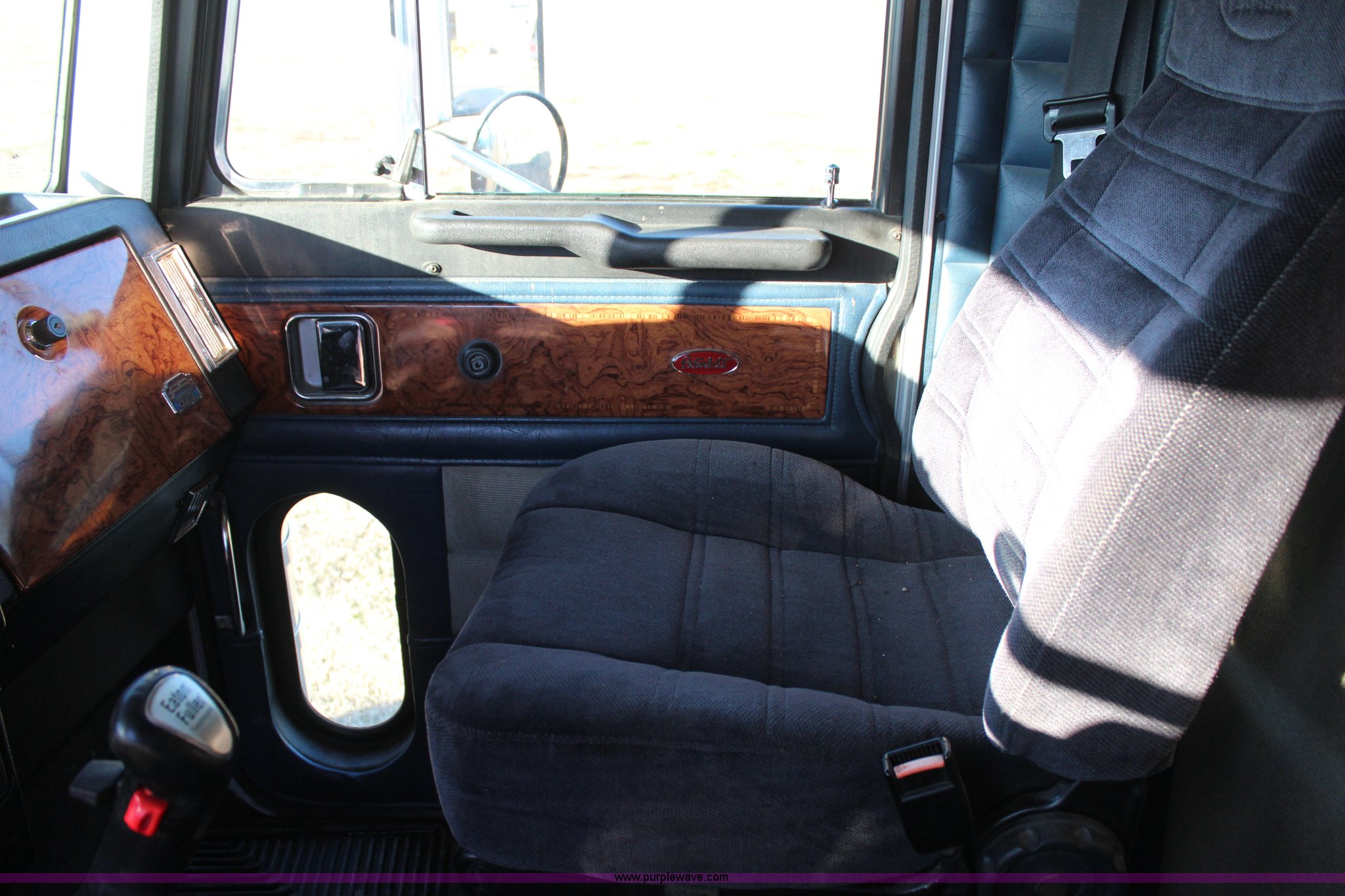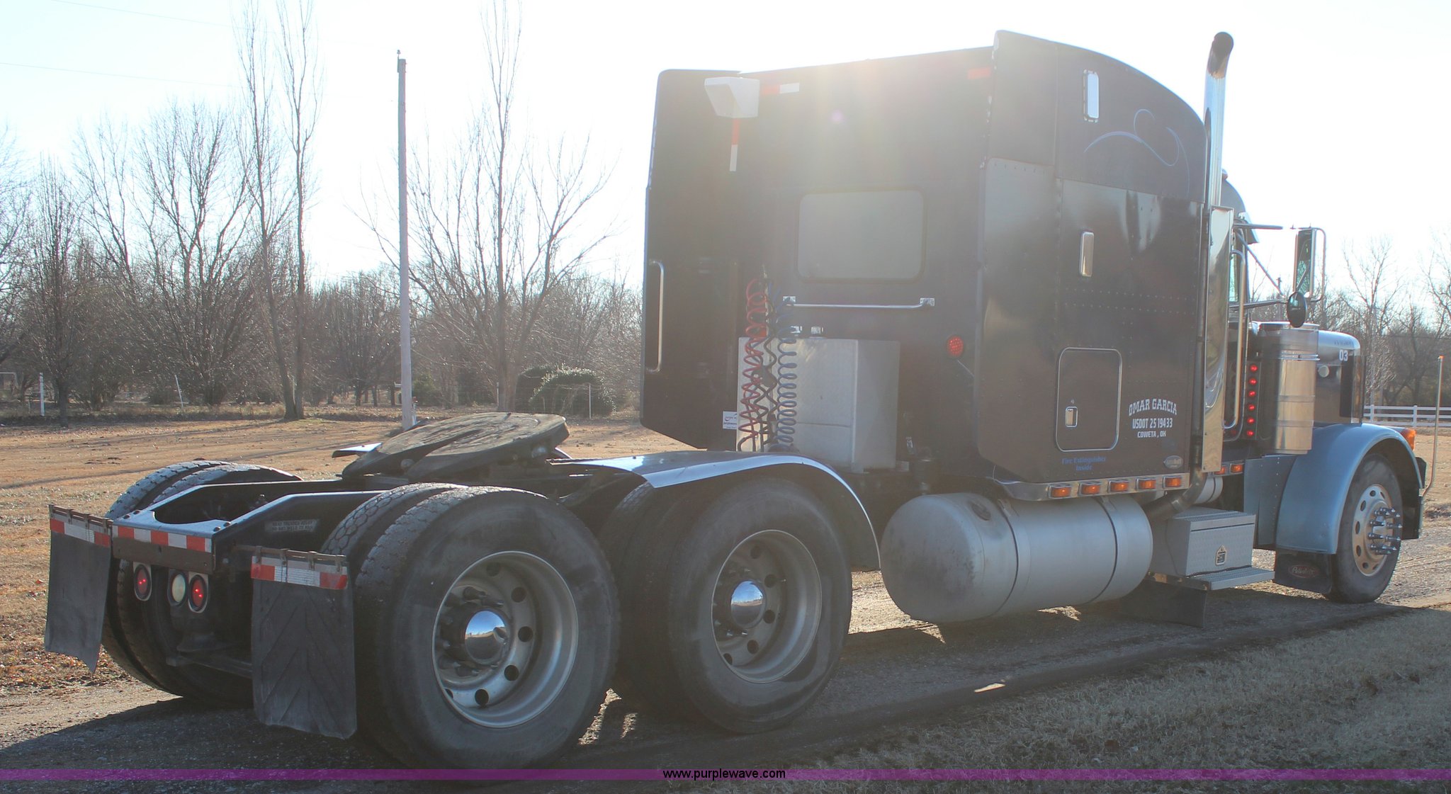 Purple Wave is selling a used Truck Tractor in Oklahoma. This item is a 1997 Peterbilt 379 semi truck with the following: 1,528,366 miles on odometer, Caterpillar 3406 14.6L L6 diesel engine, Eaton Fuller 15 speed manual transmission, Inter-axle differential lock, AC and heat, Tilt, Cruise, AM/FM/CD, Power and heated mirrors, Air suspension seat, Air ride cab, Spotlight, Sleeper, Single bed, Storage cabinets, Rear climate control, Hanging closet, Exterior visor, PTO, Wet kit, Dump valves, Air operated sliding fifth wheel plate, Dual front exhaust stacks, Stainless steel half fenders, Mud flaps, Air suspension, Air brakes, 11R24.5 tires, GVWR 46,000 lbs, FAWR 12,000 lbs, IAWR 17,000 lbs, RAWR 17,000 lbs