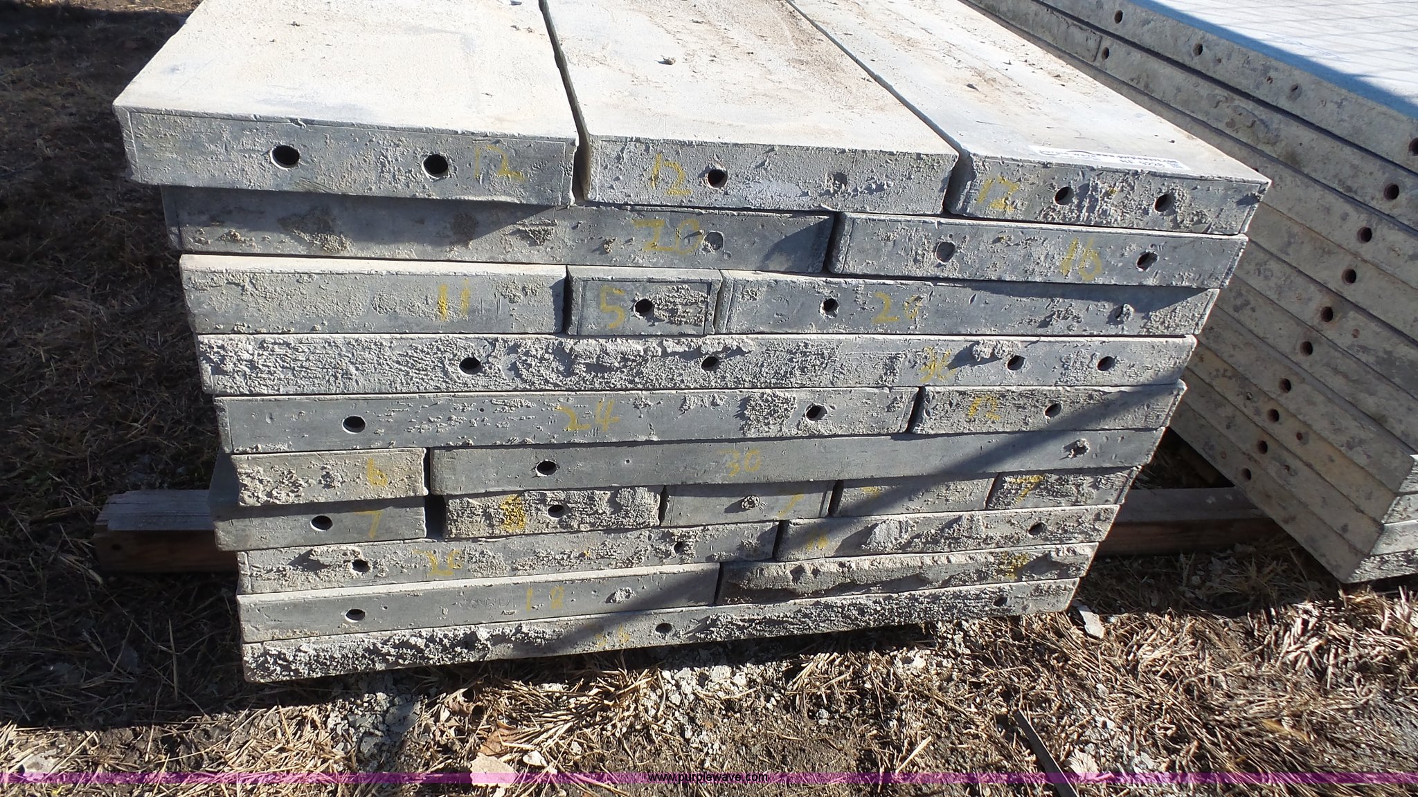 Purple Wave is selling a used Concrete Equip. or Acces. in Kansas. This item is a Wall-Ties and Forms aluminum concrete form filler panels with the following: (2) 8' x 36" panels, (2) 8' x 18" filler panels, (3) 8' x 20" filler panels, (2) 8' x 16" filler panels, (4) 8' x 7" filler panels, 8' x 8" filler panels, 8' x 24" filler panels, 8' x 6" filler panels, (3) 8' x 12" filler panels, 8' x 30" filler panels, 8' x 11" filler panels, 8' x 5" filler panels, 8" hole pattern