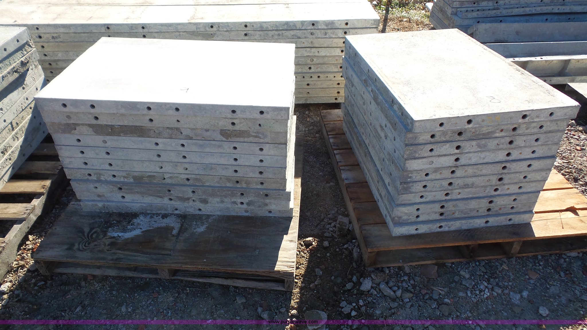 Purple Wave is selling a used Concrete Equip. or Acces. in Kansas. This item is a Wall-Ties and Forms aluminum concrete form panels with the following: (20) 3'L x 24"W panels, 8" hole pattern