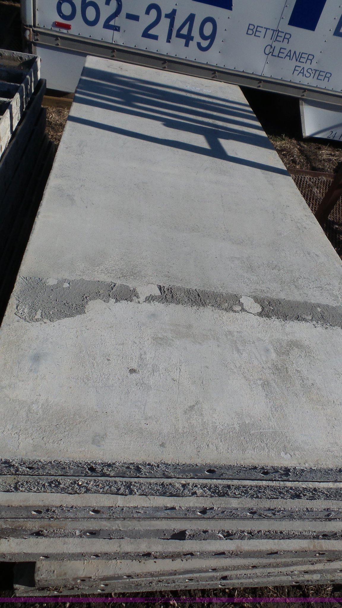 Purple Wave is selling a used Concrete Equip. or Acces. in Kansas. This item is a Wall-Ties and Forms aluminum concrete form panels with the following: (20) 8'L x 36"W panels, 8" hole pattern