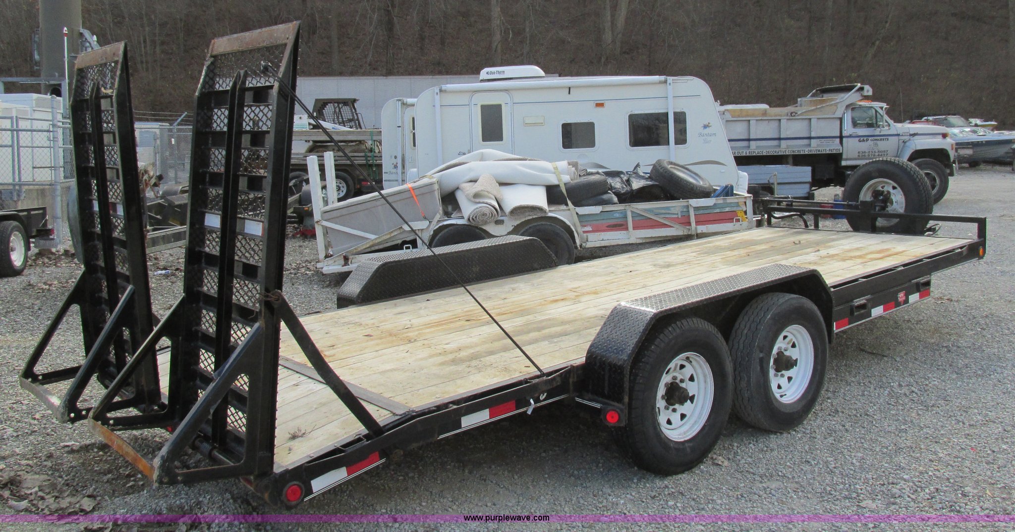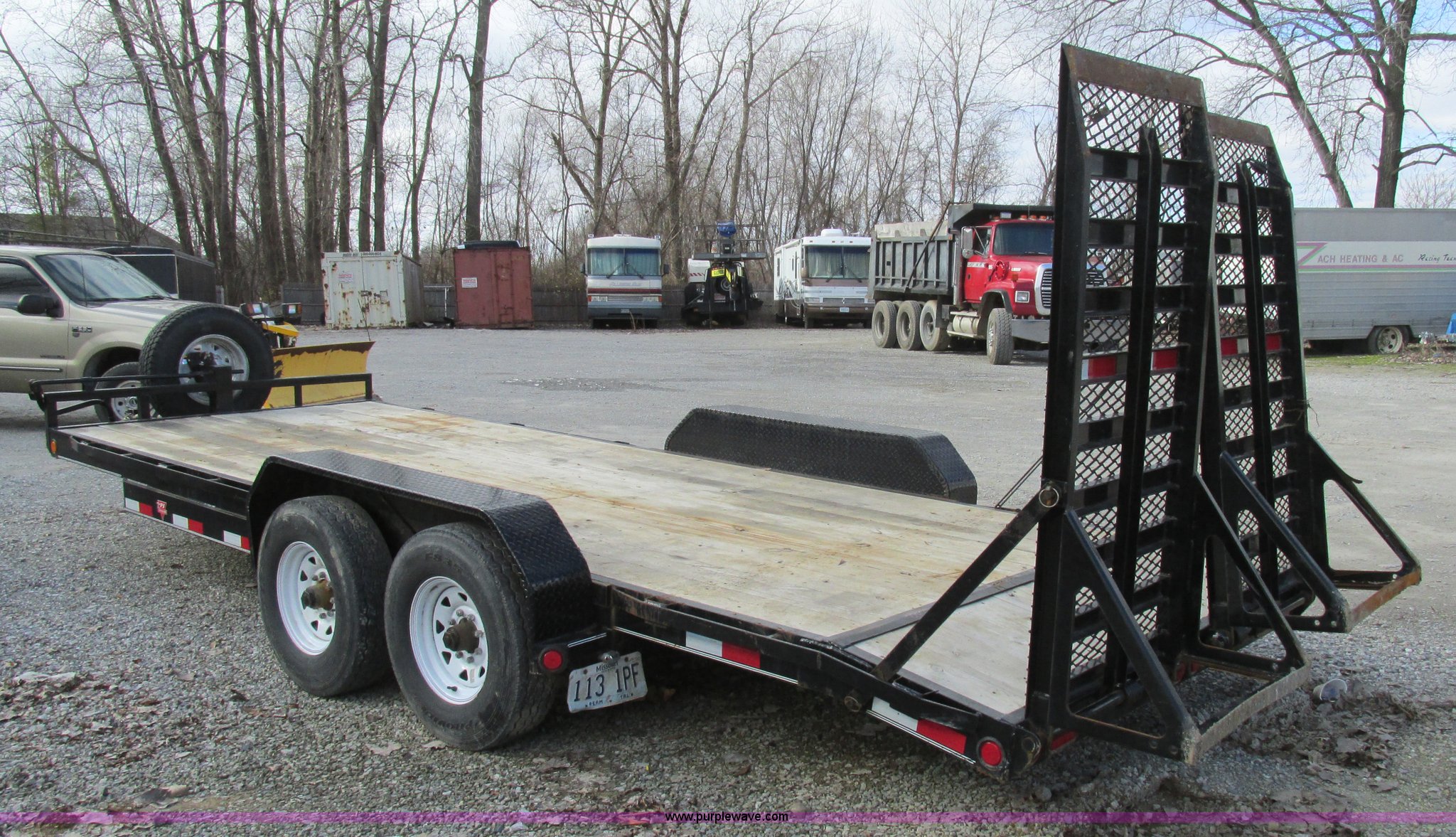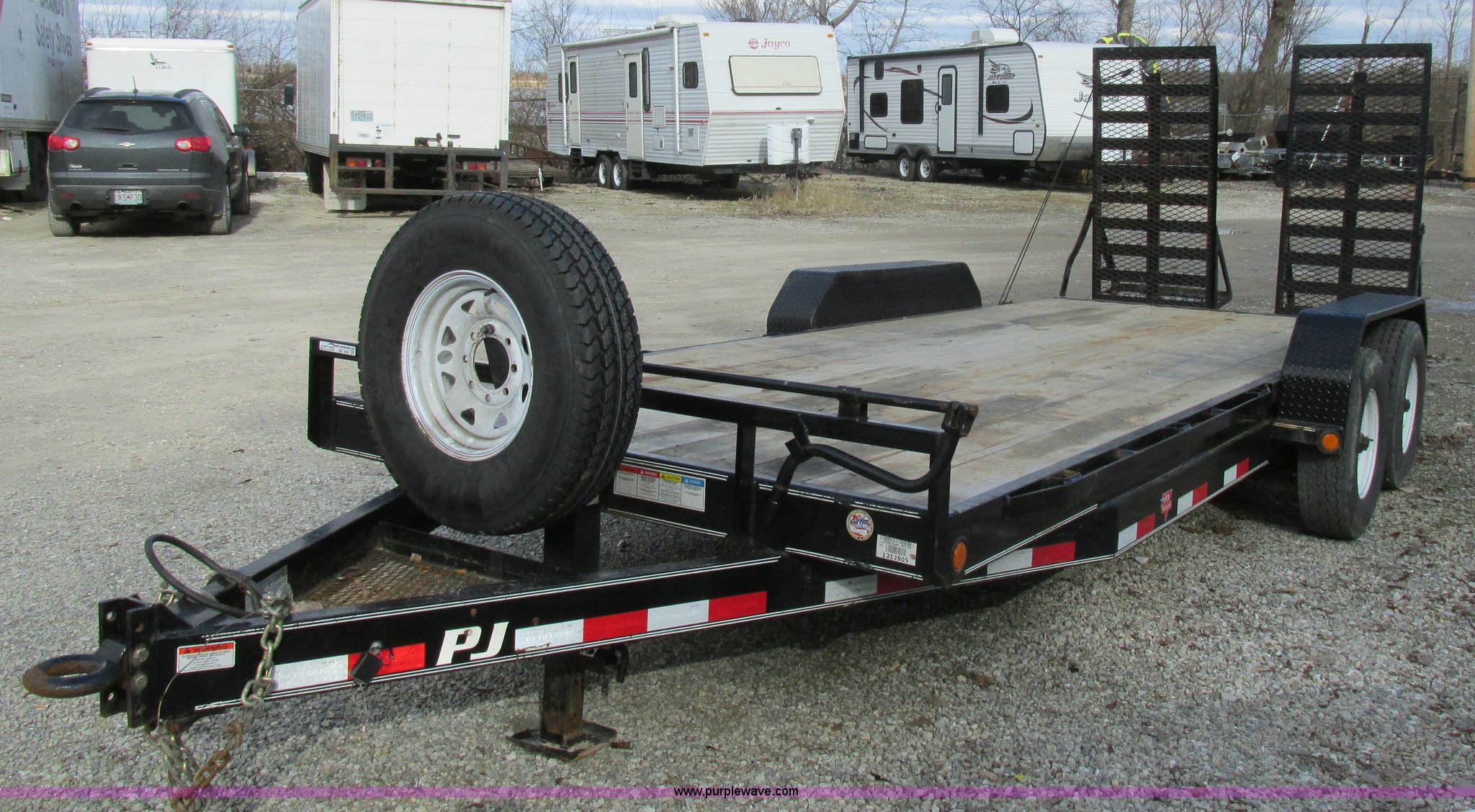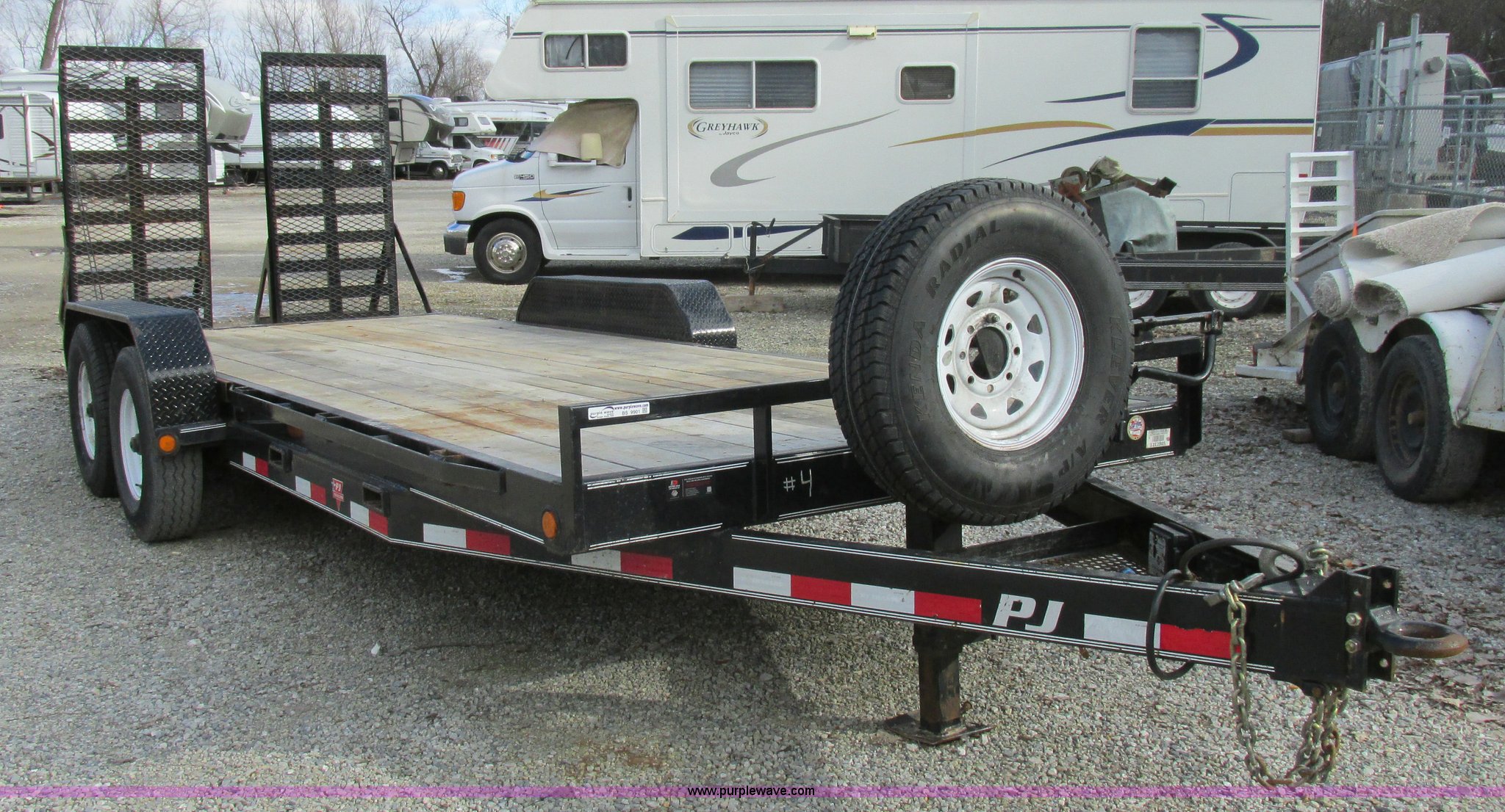 Purple Wave is selling a used Equip. Trailer in Missouri. This item is a 2014 PJ equipment trailer with the following: 18'3"L x 85"W deck, 2'L dovetail, 65"L x 31"W ramps, Stake side pockets, Rub rails, Jack stand, Adjustable pintle hitch, Safety chains, Trailer break-away system, ST235/85R16 tires, Load Range G