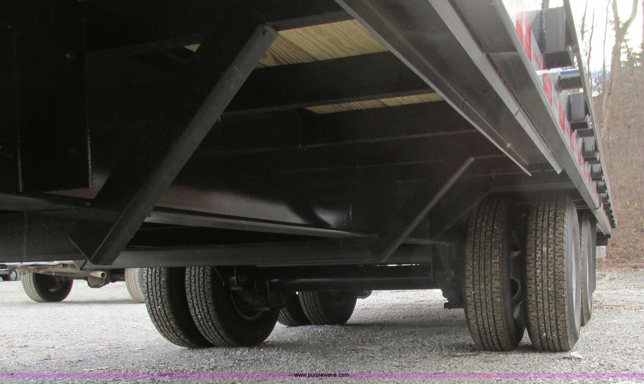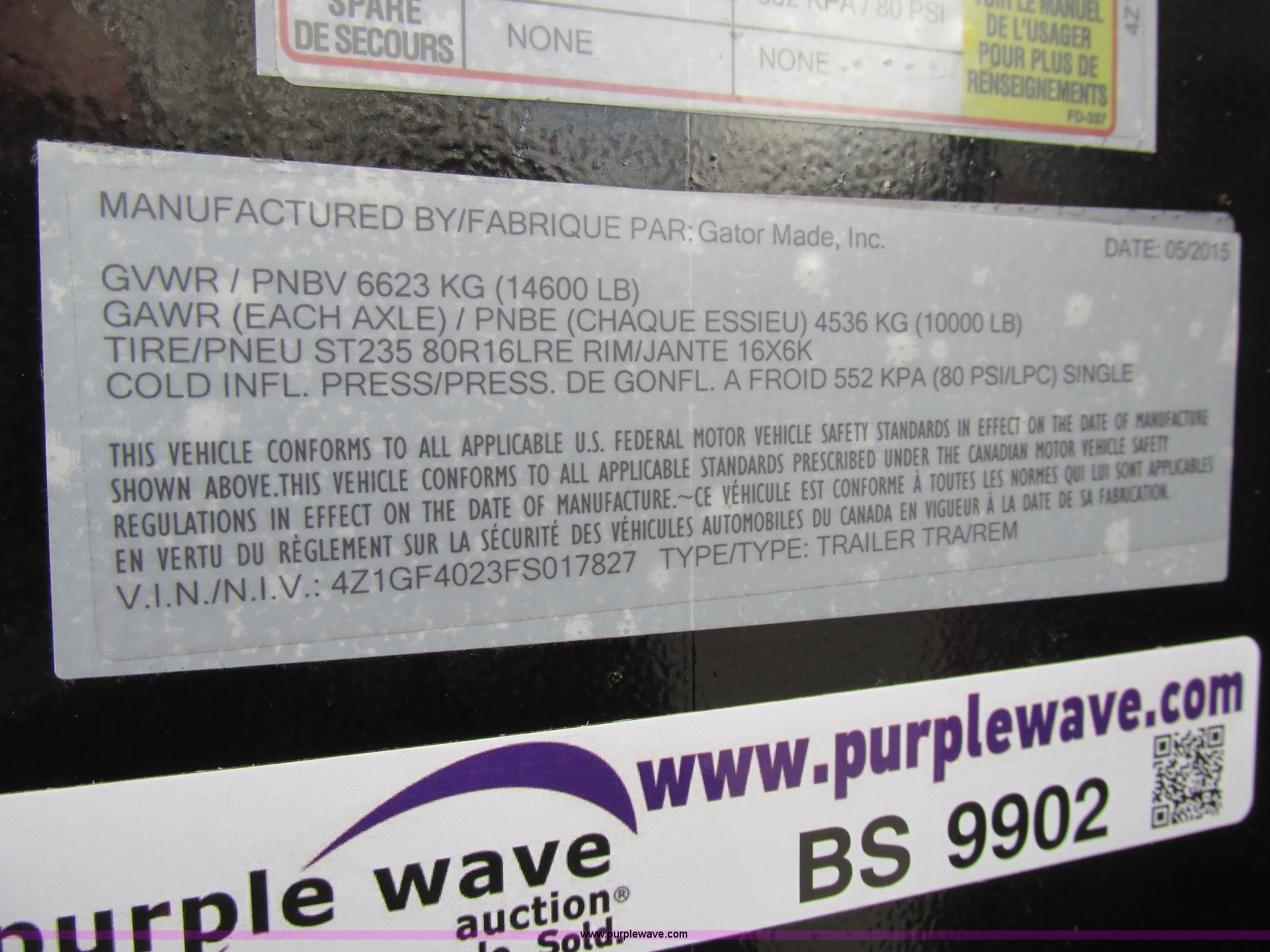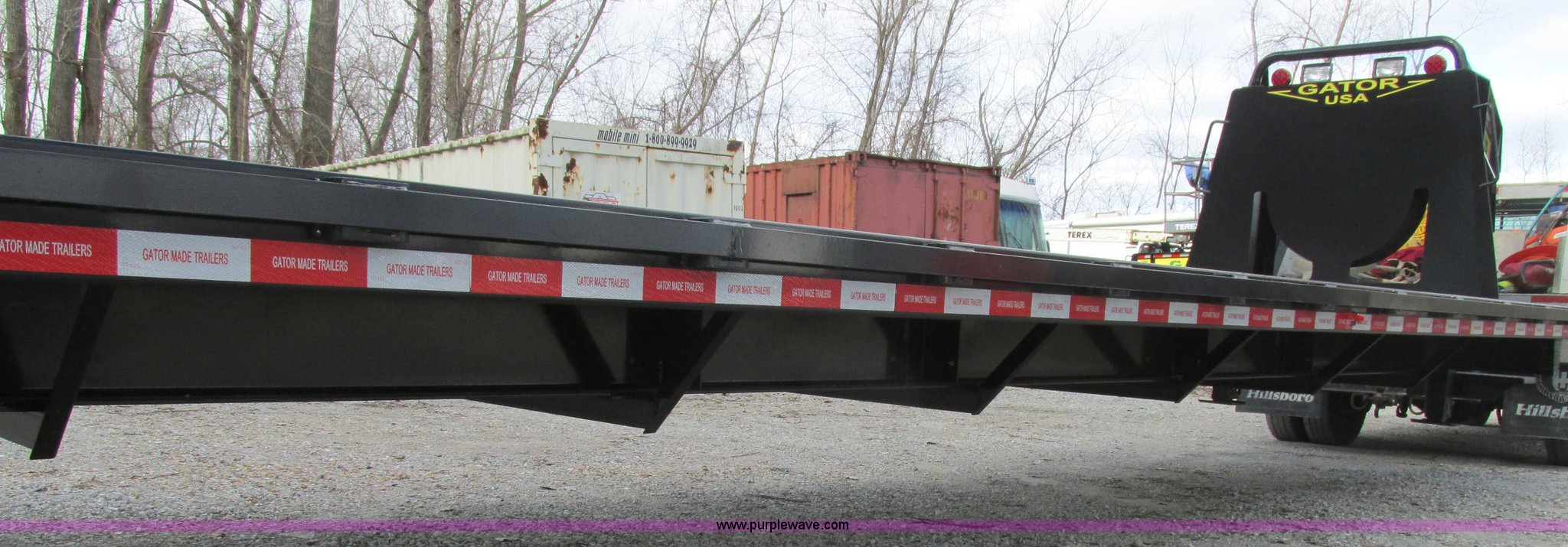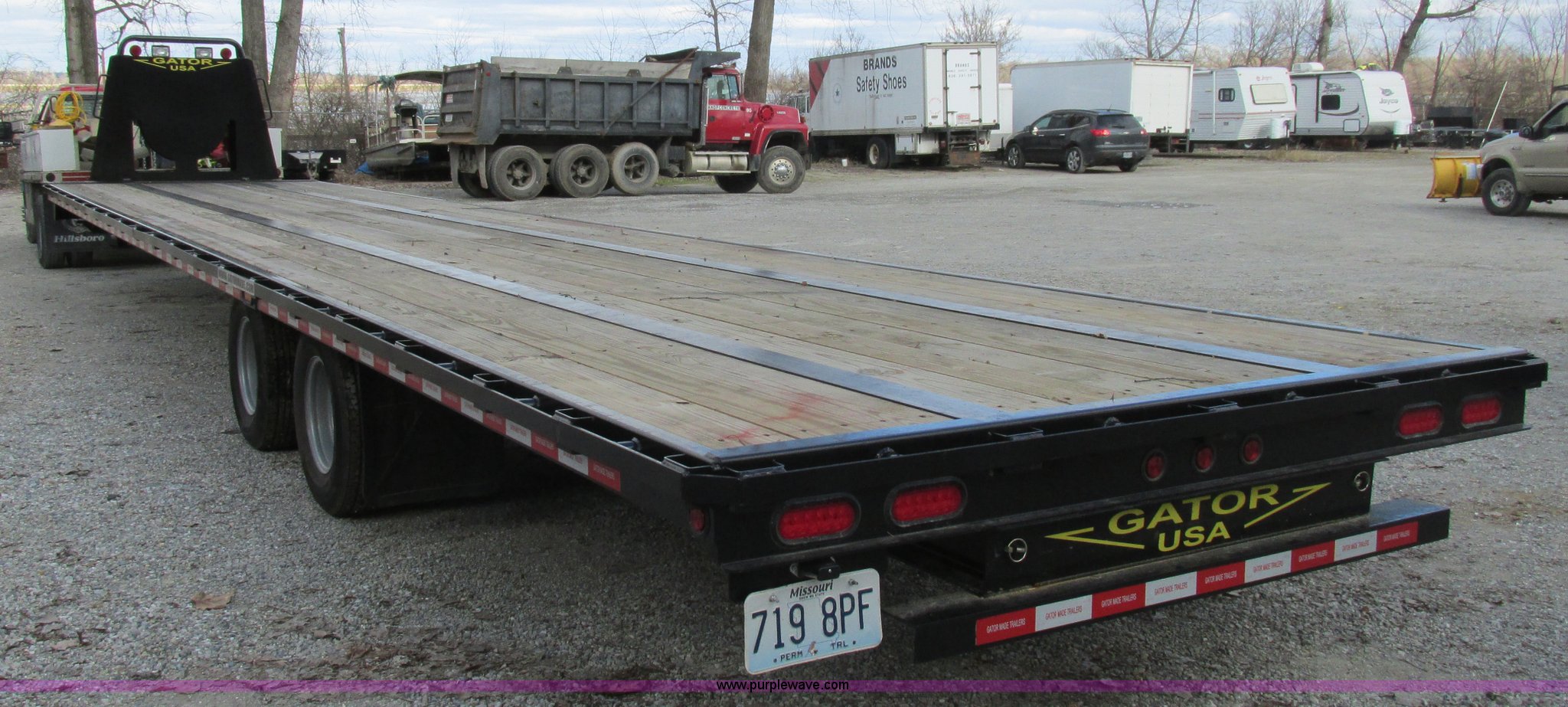 Purple Wave is selling a used Equip. Trailer in Missouri. This item is a 2015 Gatormade equipment trailer with the following: 40'L, 8'L x 20"W ramps, Wood deck, Stake side pockets, Rub rails, Toolbox, Dual leg landing gear, Trailer brake-away system, ST235/80R16 tires, GVWR 14,600 lbs, One owner