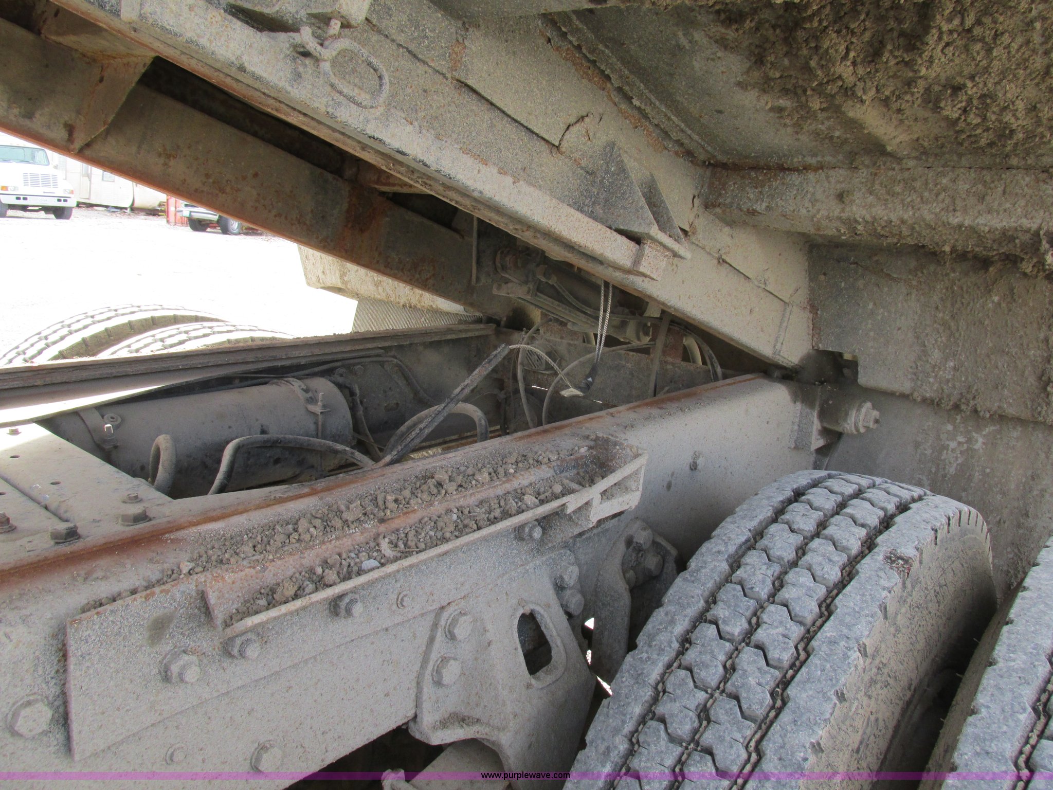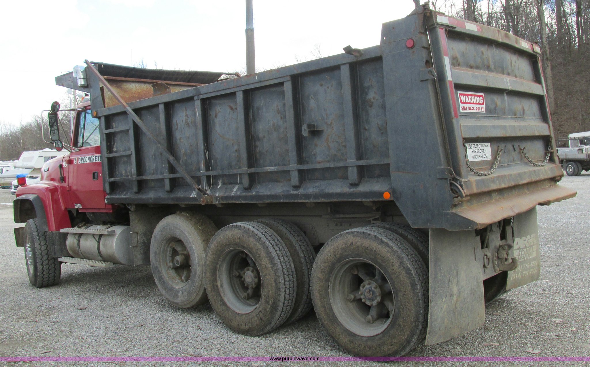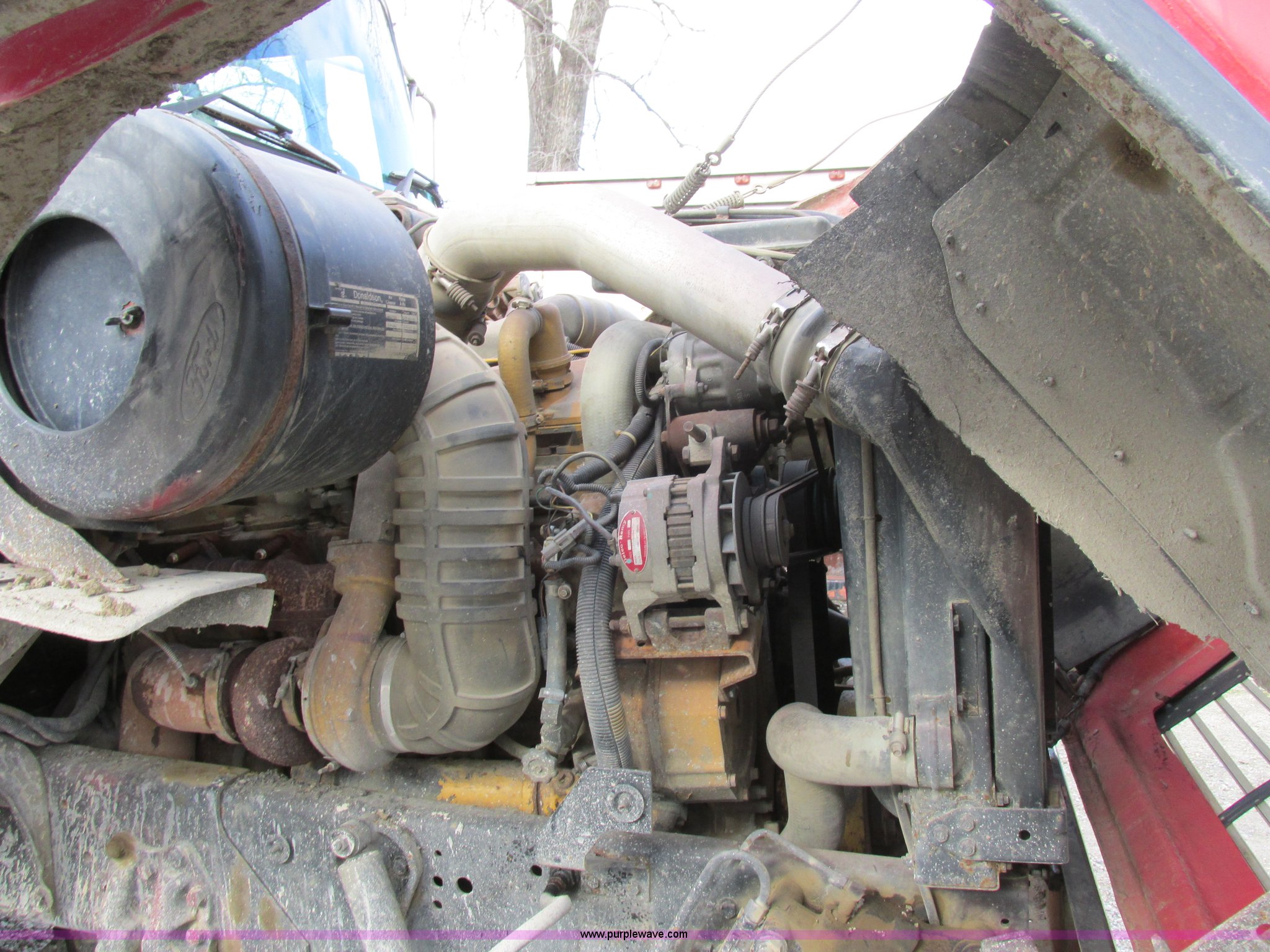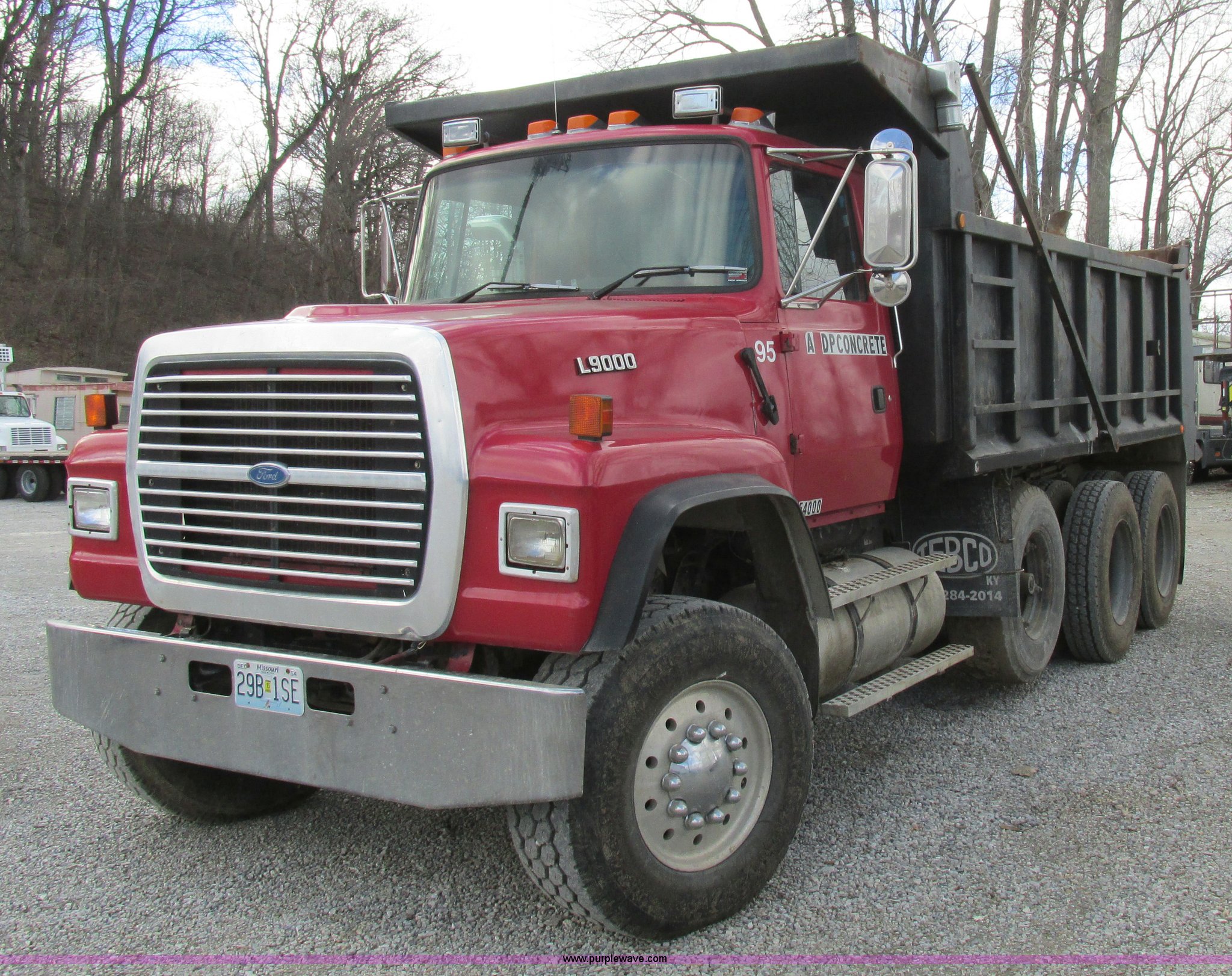 1995 Ford LT9000 dump truck. 291,604 miles on odometer, Miles may vary, vehicle is still in use, Caterpillar 3406 14.6L L6 turbo diesel engine 358 HP, Serial 8PN04439, Eight speed manual transmission, Triple axle, AC and heat, PTO, 15.5'L steel dump bed 46" side height, Single ram three stage hoist, Air operated end gate, Roll-over tarp, Single fuel tank, Double frame, Spring over walking beam suspension, Air brakes, Pusher lift axle, 385/65R22.5 tires. 1FDZU90X6SVA76594. View equipment video. G&P Concrete. 4125 Elm Point Road. St. Charles, MO 63301