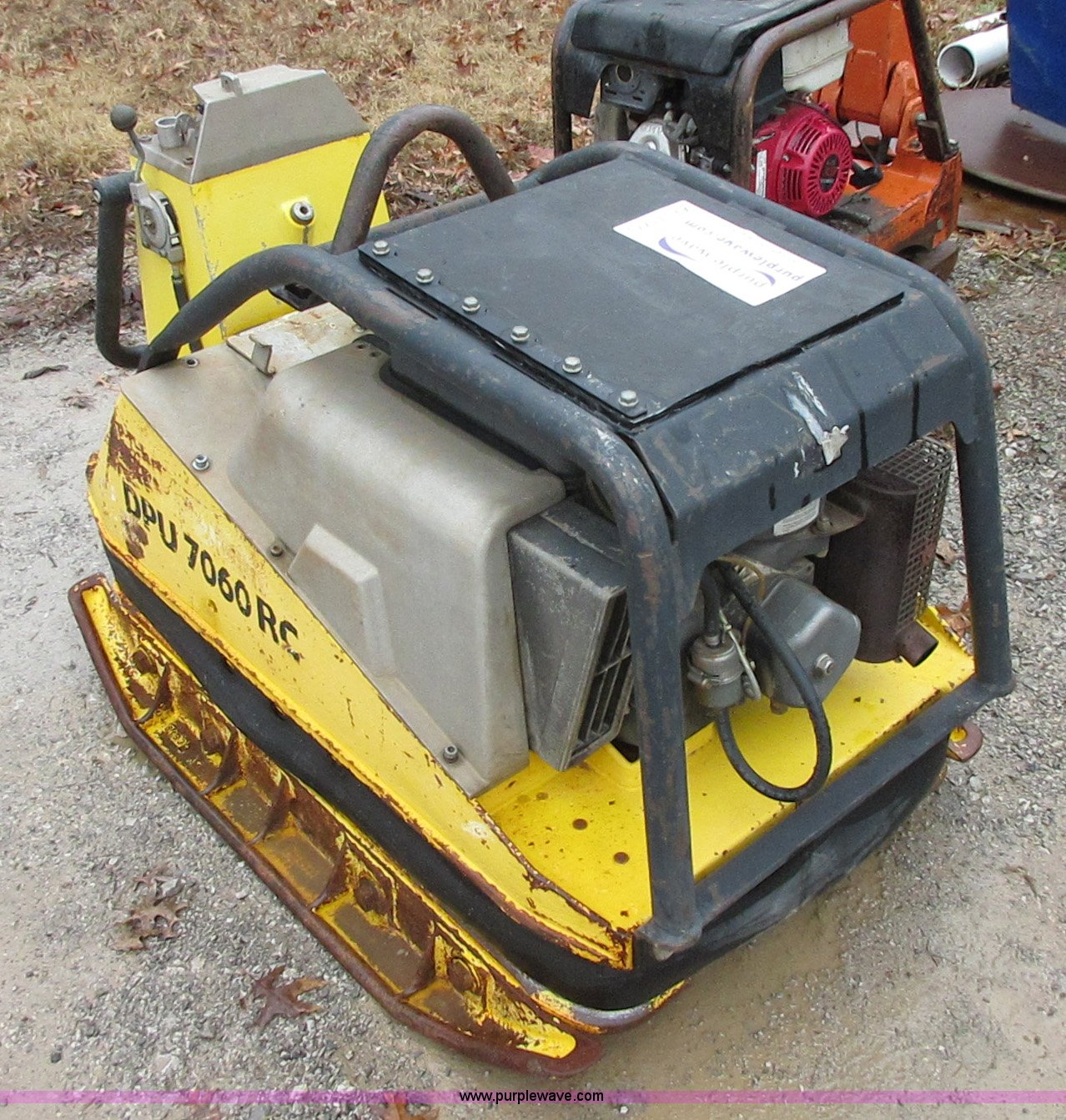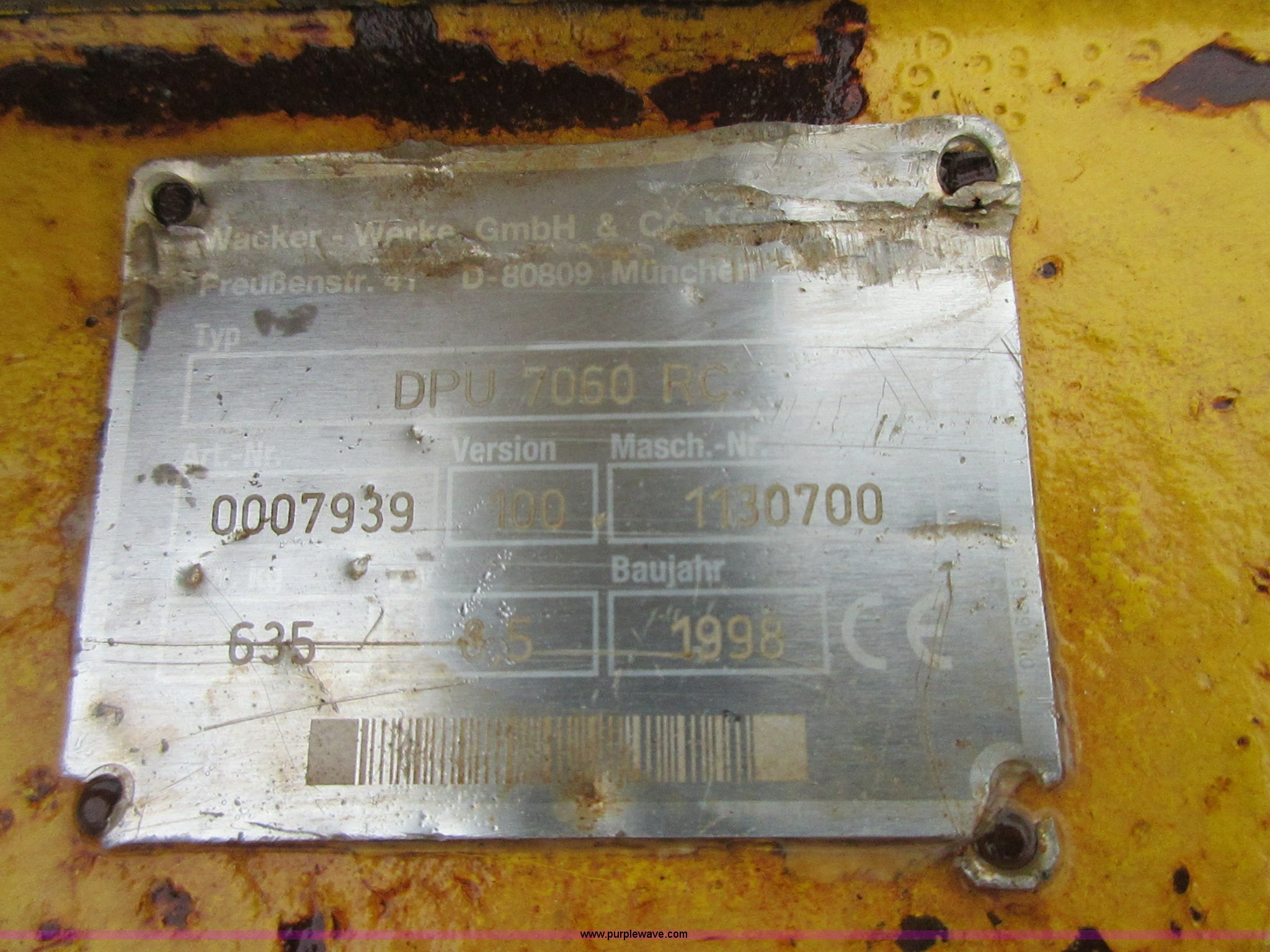 Purple Wave is selling a used Walk Behind Compactor in Oklahoma. This item is a 1998 Wacker DPU7060RC compactor with the following: Farymann diesel engine, 14.8 HP, Electric start, 32" x 44" plate, 15,377 LBF force, 82 ft/min, 12,900 sq.ft./hour, 1,350 lbs. base operating weight, Recently replaced battery