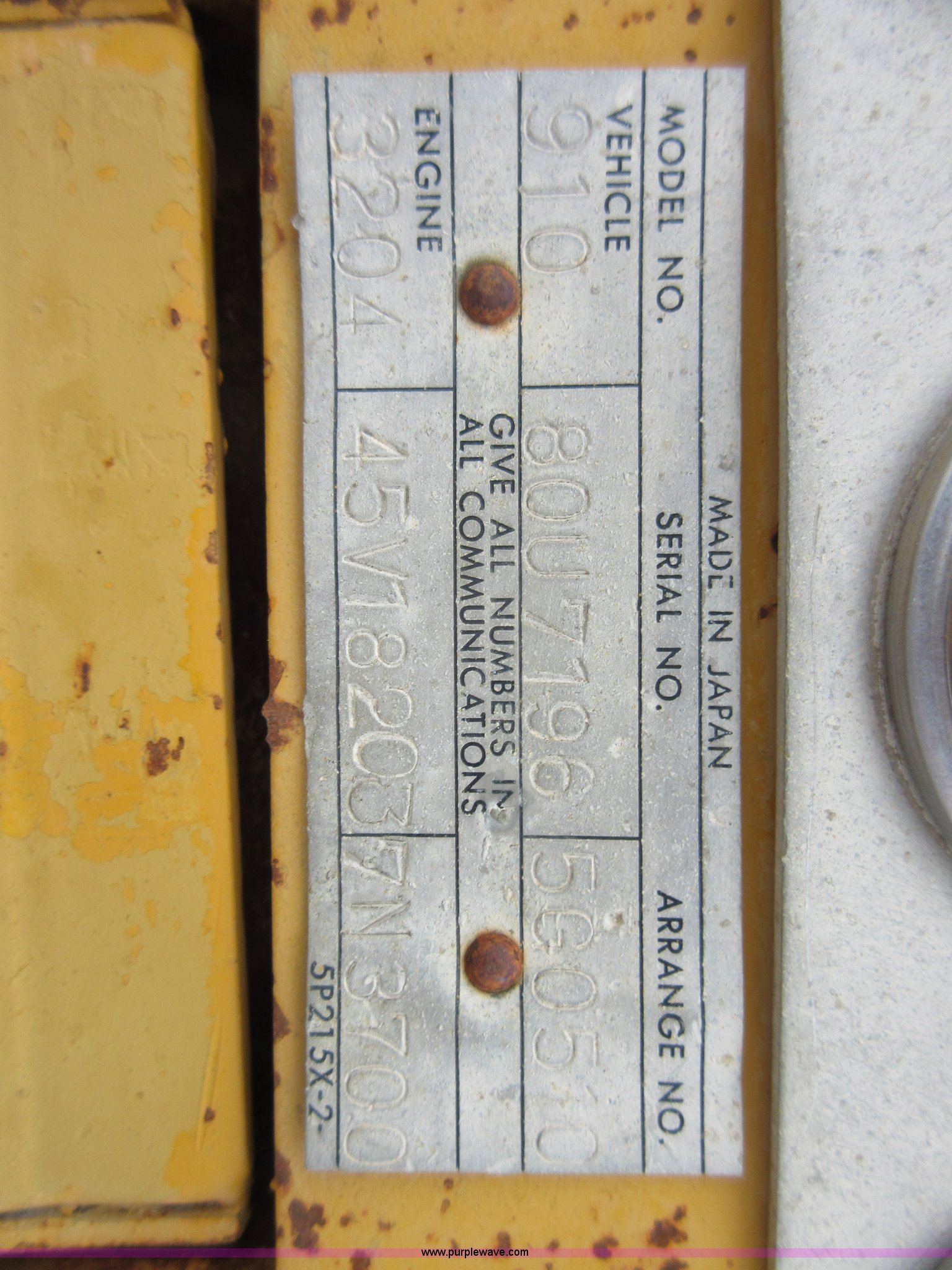Purple Wave is selling a used Wheel Loader in Oklahoma. This item is a 1978 Caterpillar 910 wheel loader with the following: 9,727 hours on meter, Caterpillar 3204 four cylinder diesel engine, Serial 45V18203, Powershift transmission, 3F-1R gears, OROPS, Joystick bucket controls, Front work lights, 15.5-25 tires, 14,679 lbs. base operating weight, Serial 80U7196