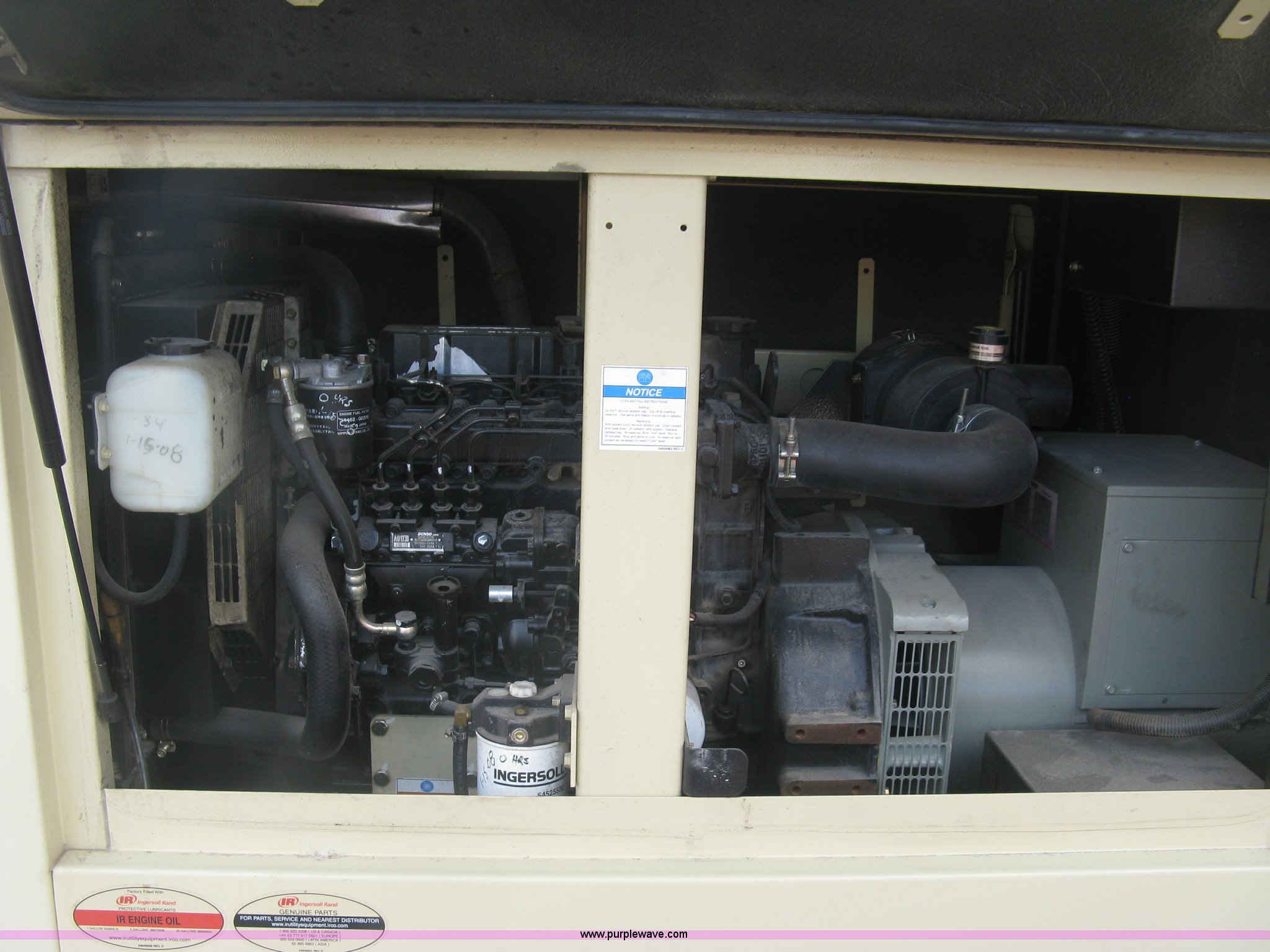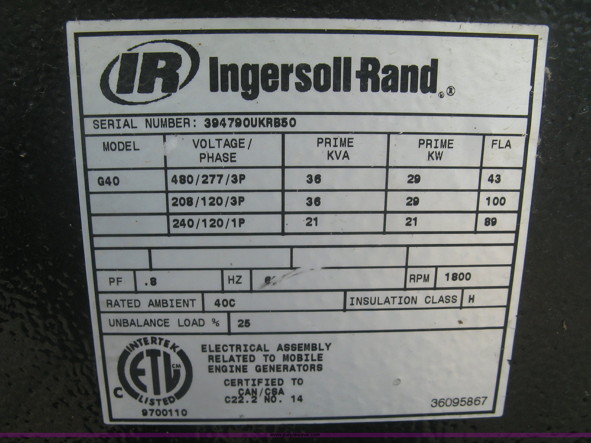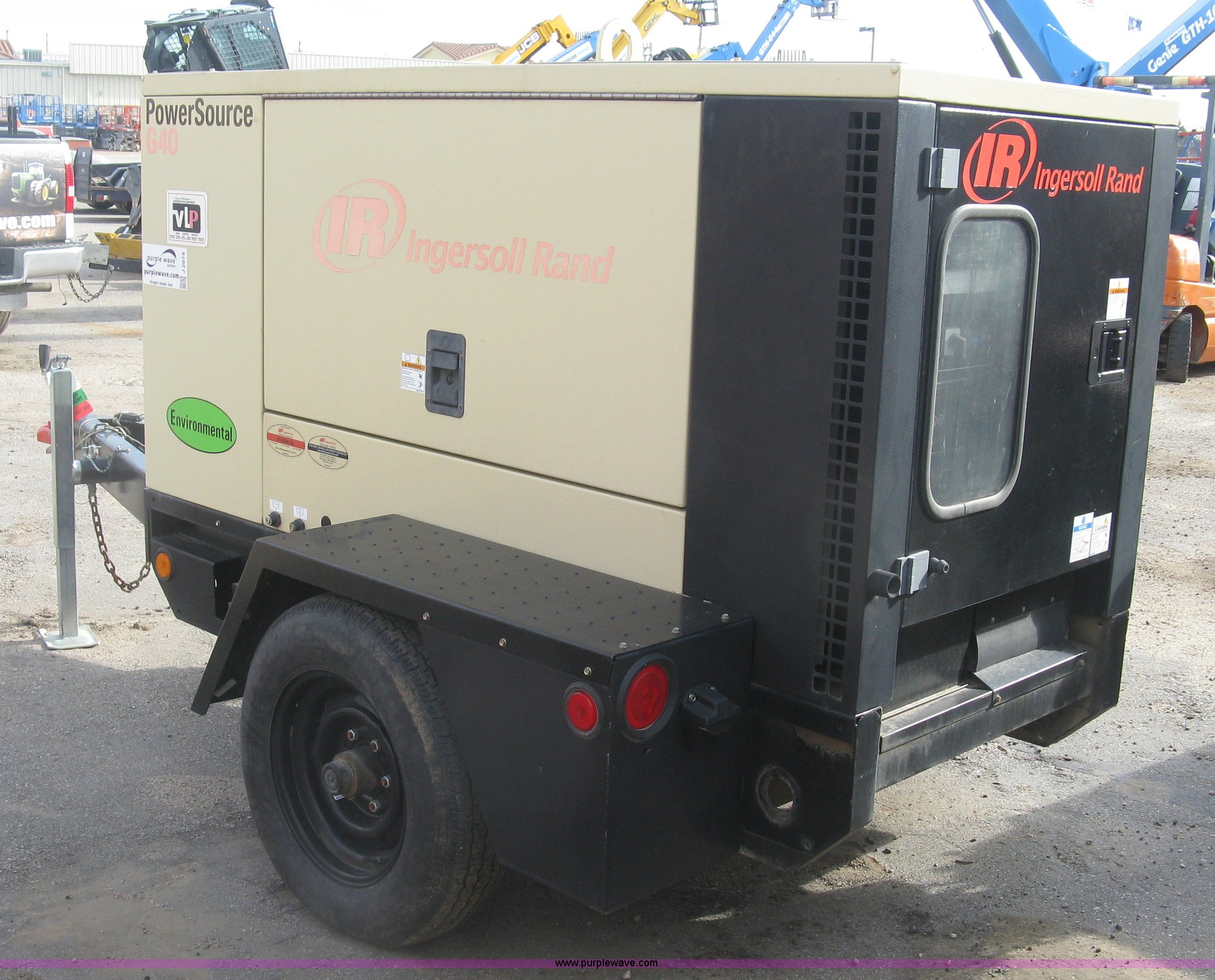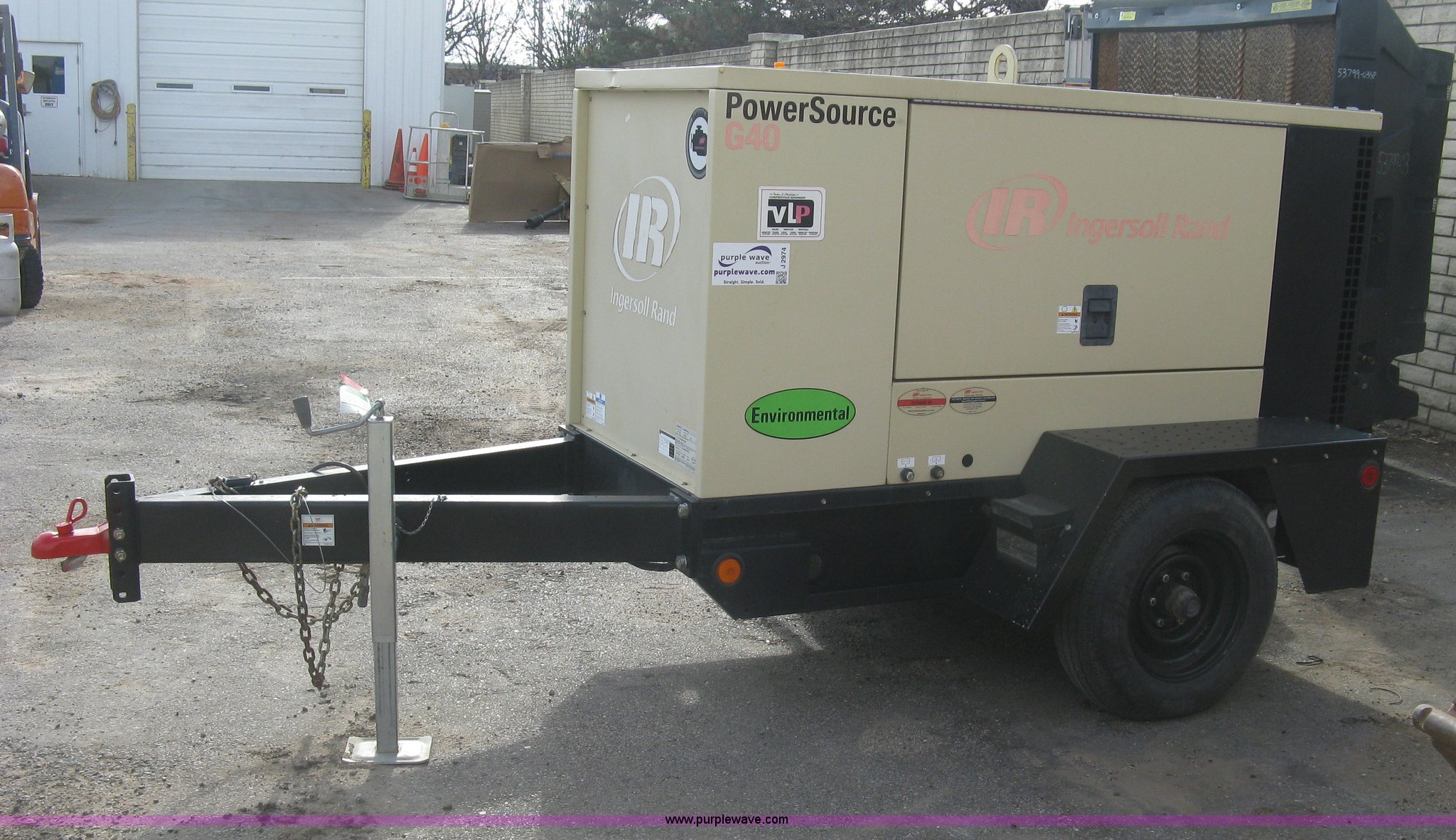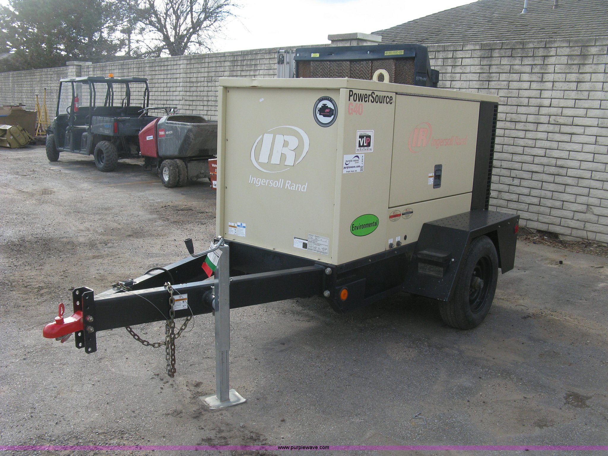 Purple Wave is selling a used Generator Set in Kansas. This item is a 2008 Ingersoll Rand Power Source G40 generator with the following: 1,308 hours on meter, Mitsubishi 4IRS2N 3.3L four cylinder diesel engine, 480/277V, Three phase, 36 kVA, 29 kW, 2 5/16" ball hitch, Adjustable height, Full fenders, Easy lube hubs, ST205/75D15 tires, Serial 394790UKRB50