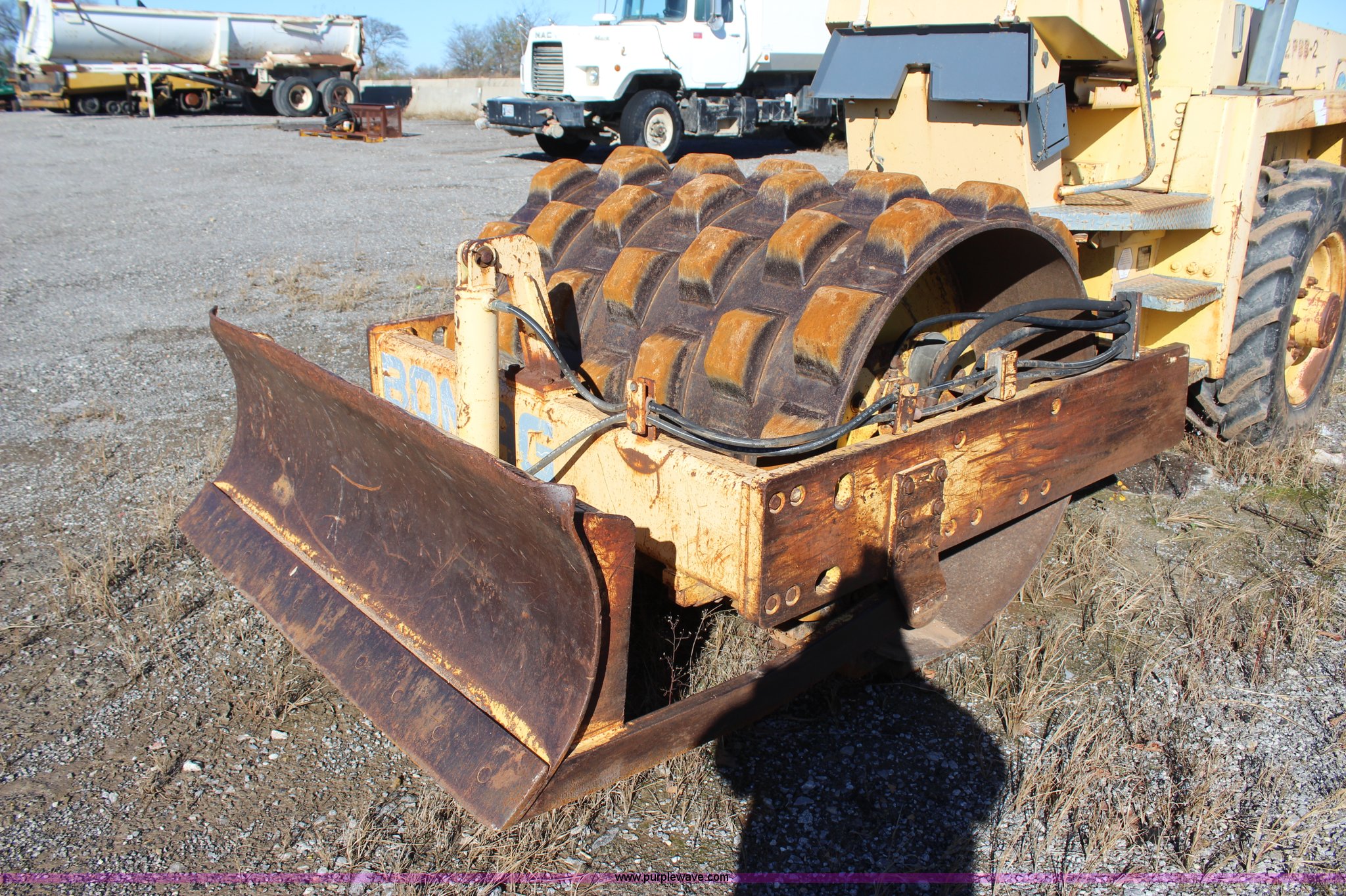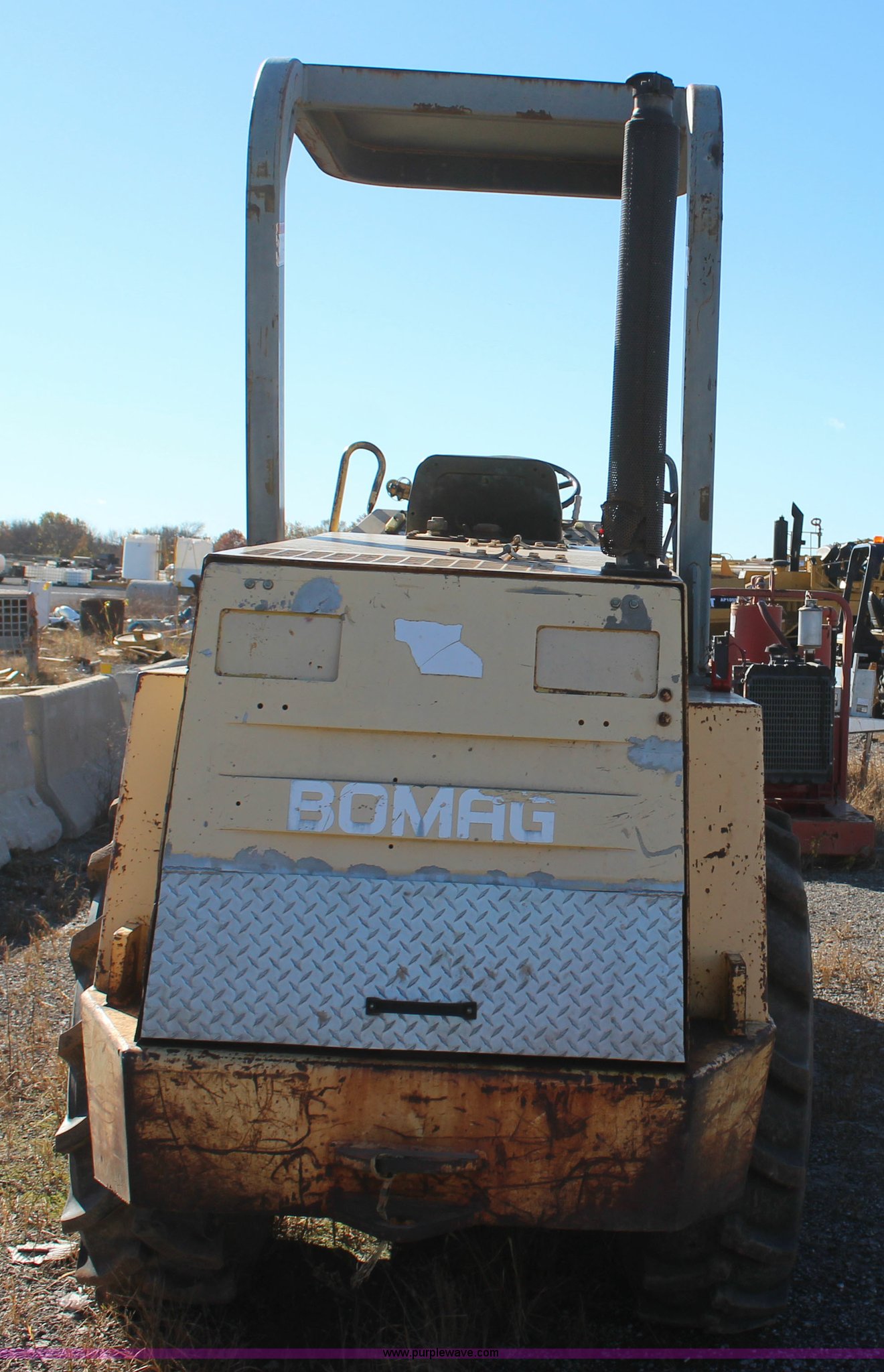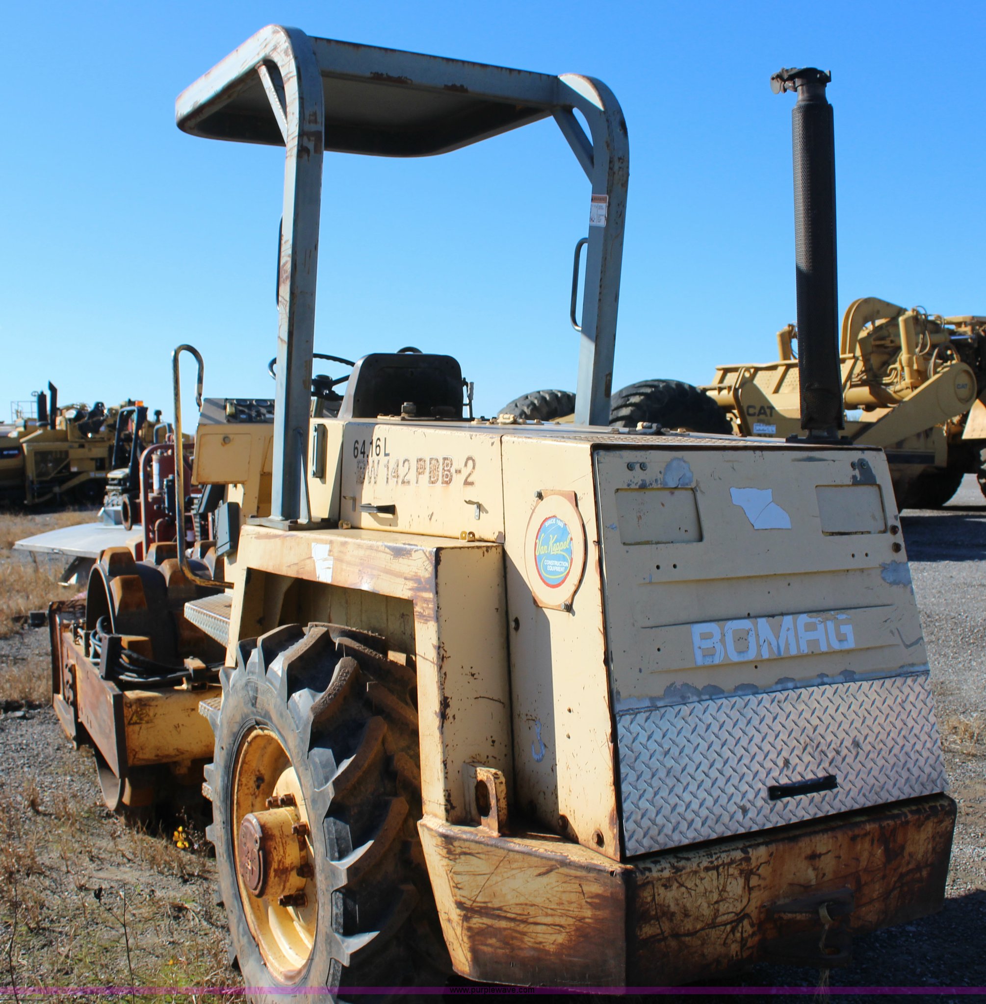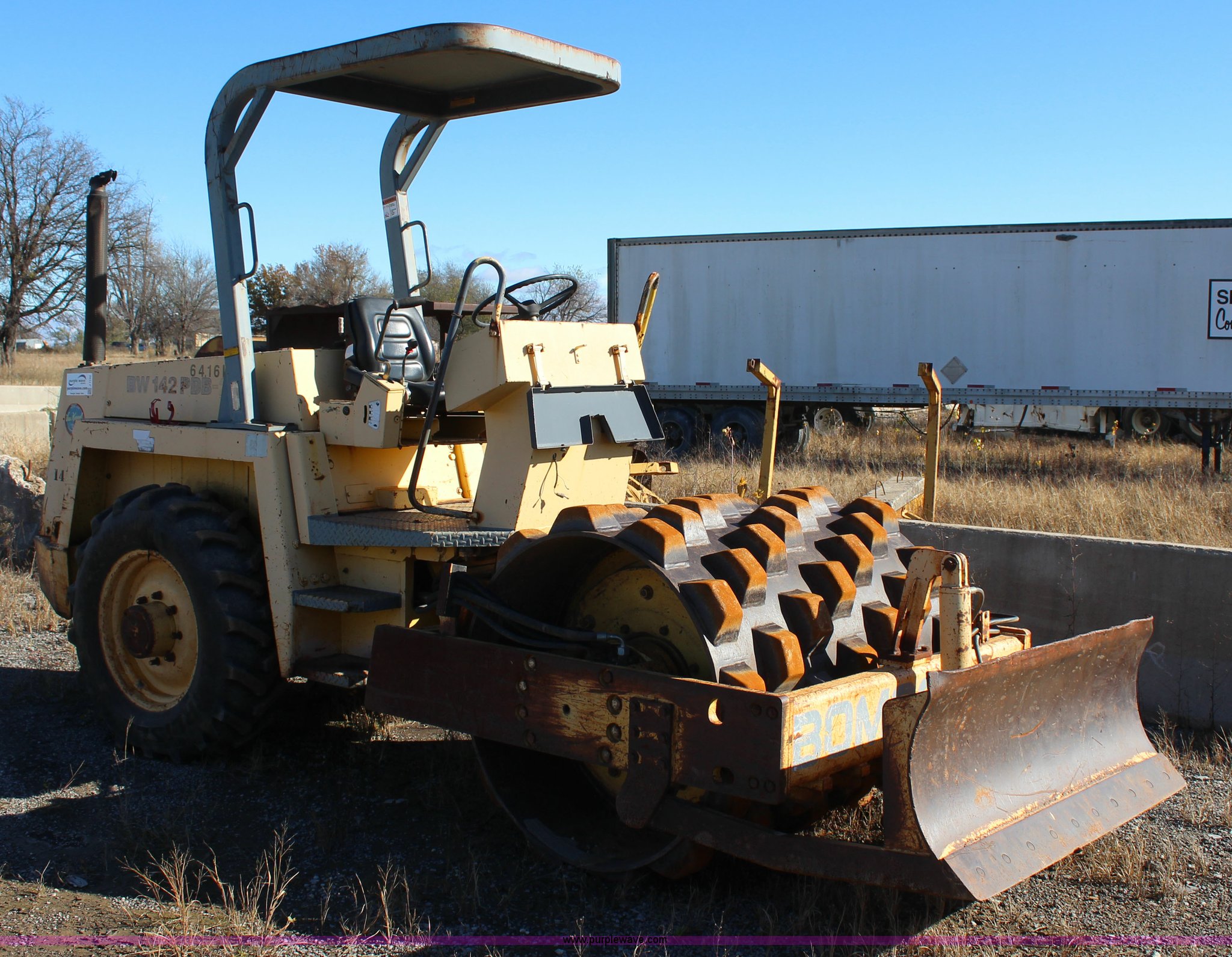 Purple Wave is selling a used Single Drum Roller Compactor in Oklahoma. This item is a Bomag BW142PDB-2 vibratory drum roller with the following: 5,087 hours on meter, Deutz F41011P four cylinder diesel engine, Hydrostatic transmission, Canopy, 60"W x 42" diameter padfoot drum, Two speed vibratory system, Front drum scraper, 62"W front blade, 320/85R24 tires, Inoperable, engine turns over but will not start, Serial 1095105102MT, Unit# 64.16L