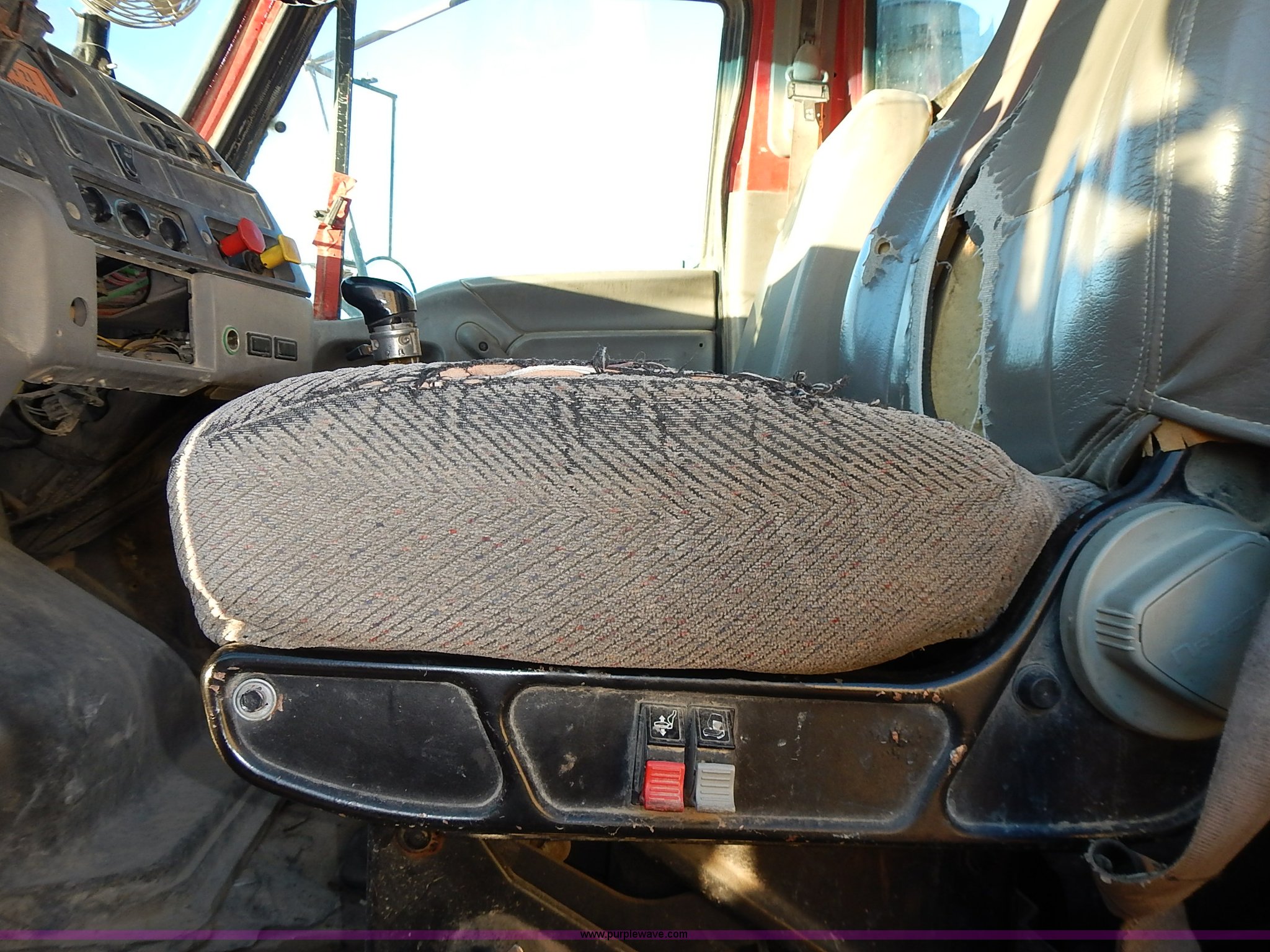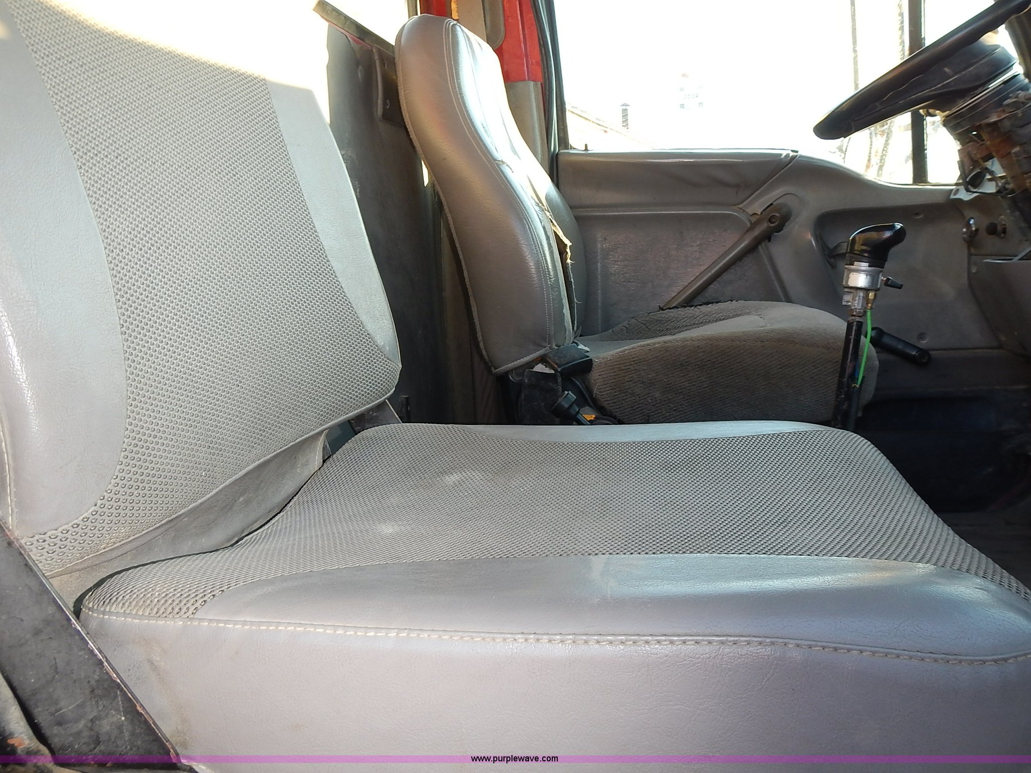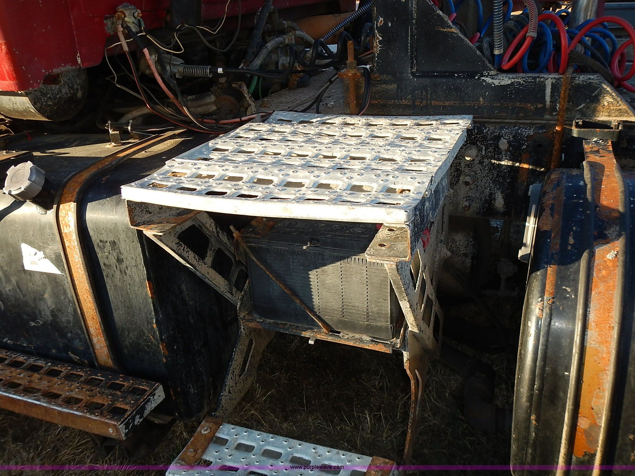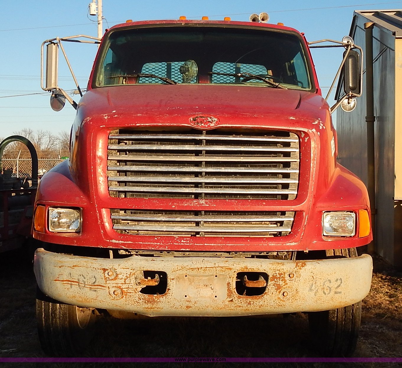 Purple Wave is selling a used Truck Tractor in Kansas. This item is a 1999 Sterling LT9500 semi truck with the following: Non-operational odometer, Approximately 290,000 miles, 5,590 hours on meter, Caterpillar C12 12.0L L6 diesel engine, Eaton Fuller Road Ranger 9 speed manual transmission, APSCO PTO, Heat, Cruise, Air suspension seat, Air ride cab, Air operated sliding fifth wheel plate, Single rear exhaust stack, Dual 75 gallon fuel tanks, Front tow hooks, Headache rack, Aluminum fenders, 4:56 gear ratio, Air suspension, Air brakes, 190" wheelbase, 11R22.5 tires, RAWR 46,000 lbs, Weak engine, Blow by, Seats damaged, One mud flap missing, Cosmetic damage to hood, Unit# 462