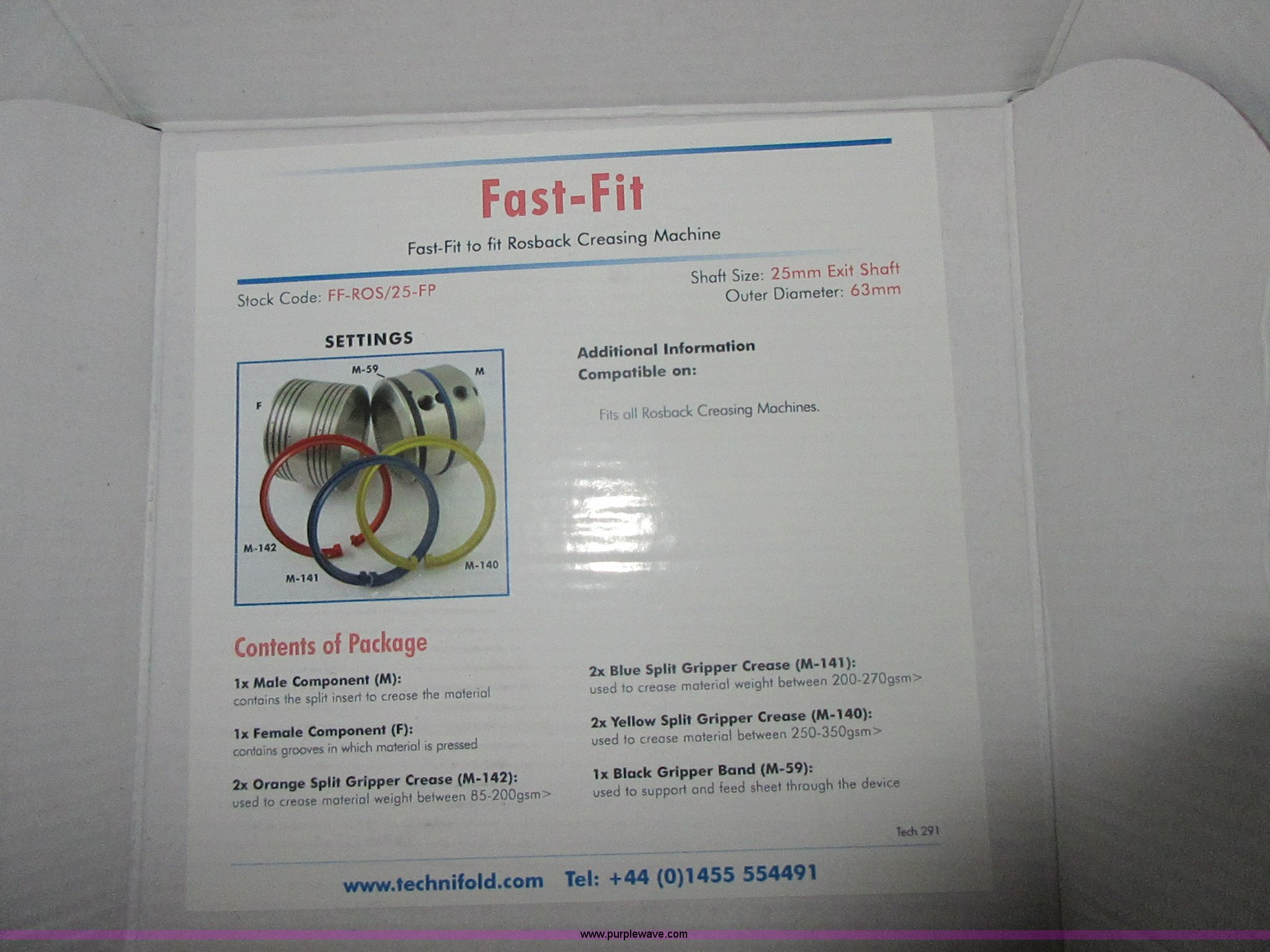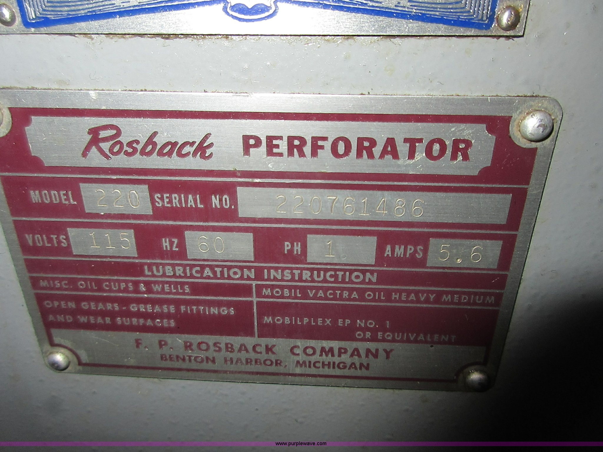 Purple Wave is selling a used Copy or Printing Machine in Kansas. This item is a Rosback 220 paper scoring and perforating machine with the following: 115V, 5.6 amp, Includes Technifold Fast-Fit, Serial 220761486