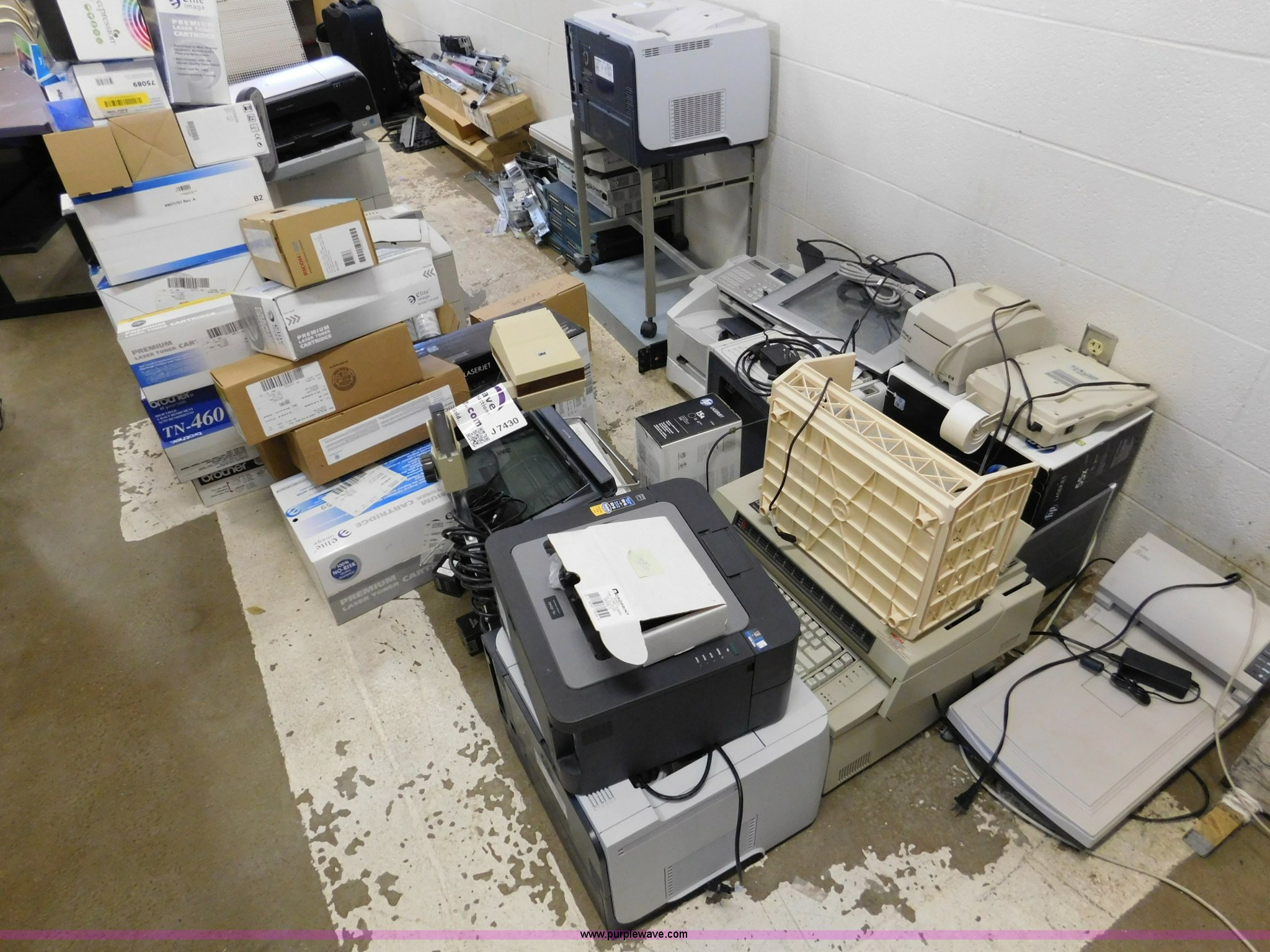 Purple Wave is selling a used Office Supplies and Equip. in Kansas. This item is a Assorted items with the following: (12) printers and fax machines, Overhead projector, Ink cartridge