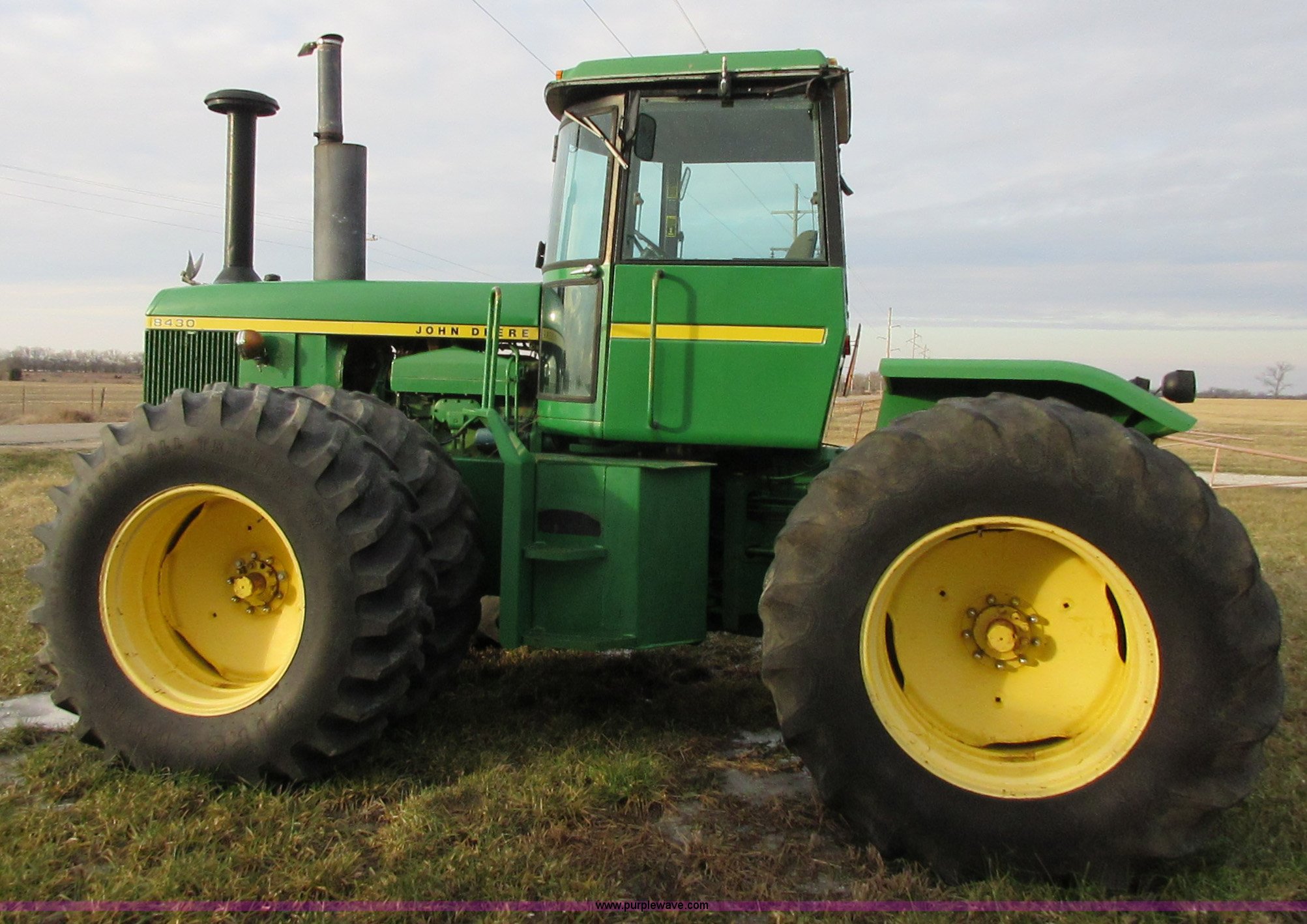 Purple Wave is selling a used Articulated 4-Wheel Drive Tractor in Kansas. This item is a 1976 John Deere 8430 4WD tractor with the following: 3,208 hours on meter, John Deere six cylinder turbo diesel engine, Quad-Range transmission, 16F-4R gears, AC and heat, Tilt steering wheel, AM/FM, Suspension seat, Seven pin outlet, Large 1000 PTO, (3) rear hydraulic remote sets, Wheel weights, 20.8-34 tires, Approx. 3,028 hours on in-frame overhaul, Approx. 400 hours on transmission overhaul, Serial 8630H002902R