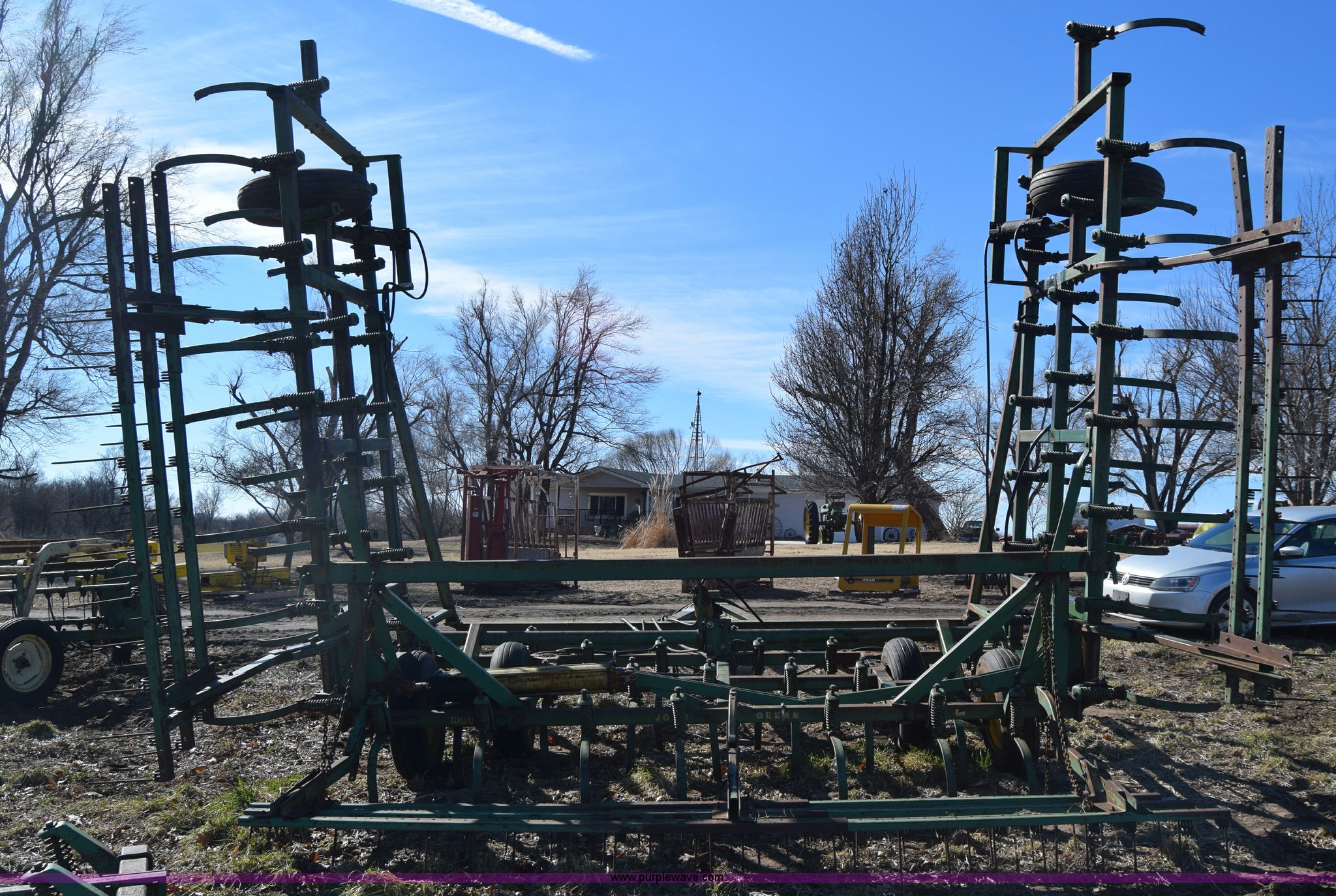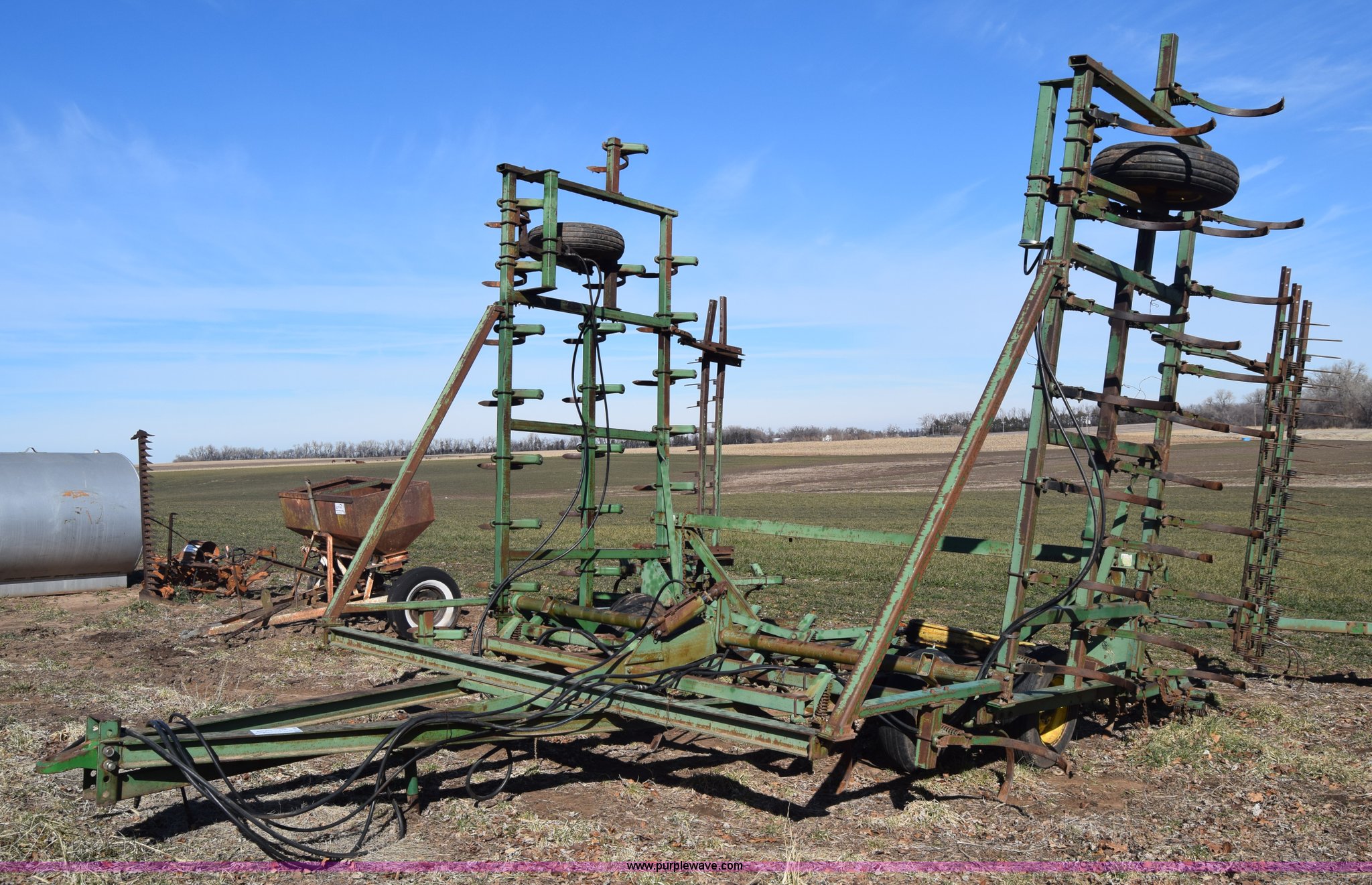 Purple Wave is selling a used Field Cultivator or Sweep Plow in Kansas. This item is a John Deere 1000 field cultivator with the following: 36'W, (2) extensions, Extends to 42' total width, Lift and wing hydraulic cylinders, Spring tine harrow, (4) hydraulic hoses, Adjustable pin hitch, Jack stand