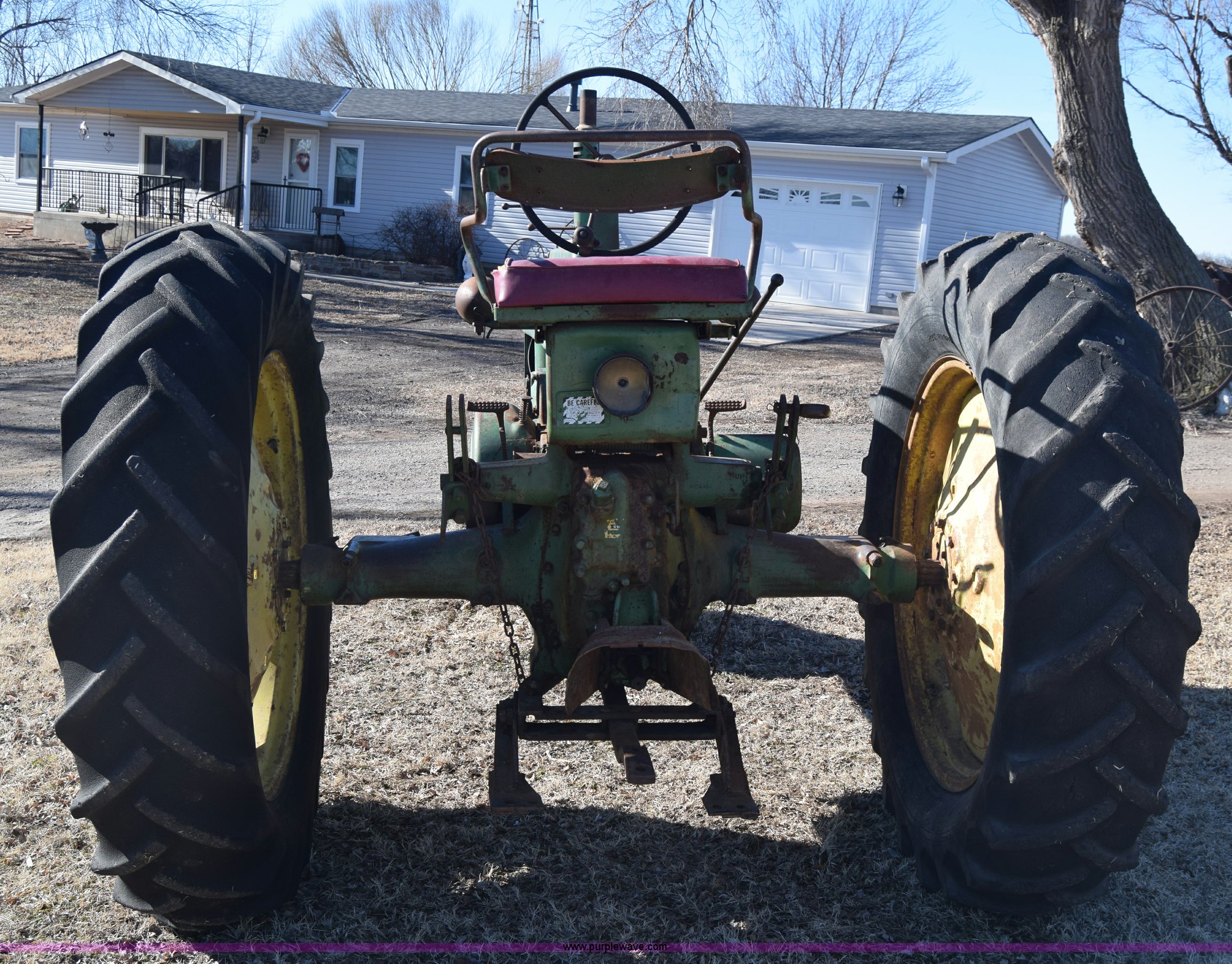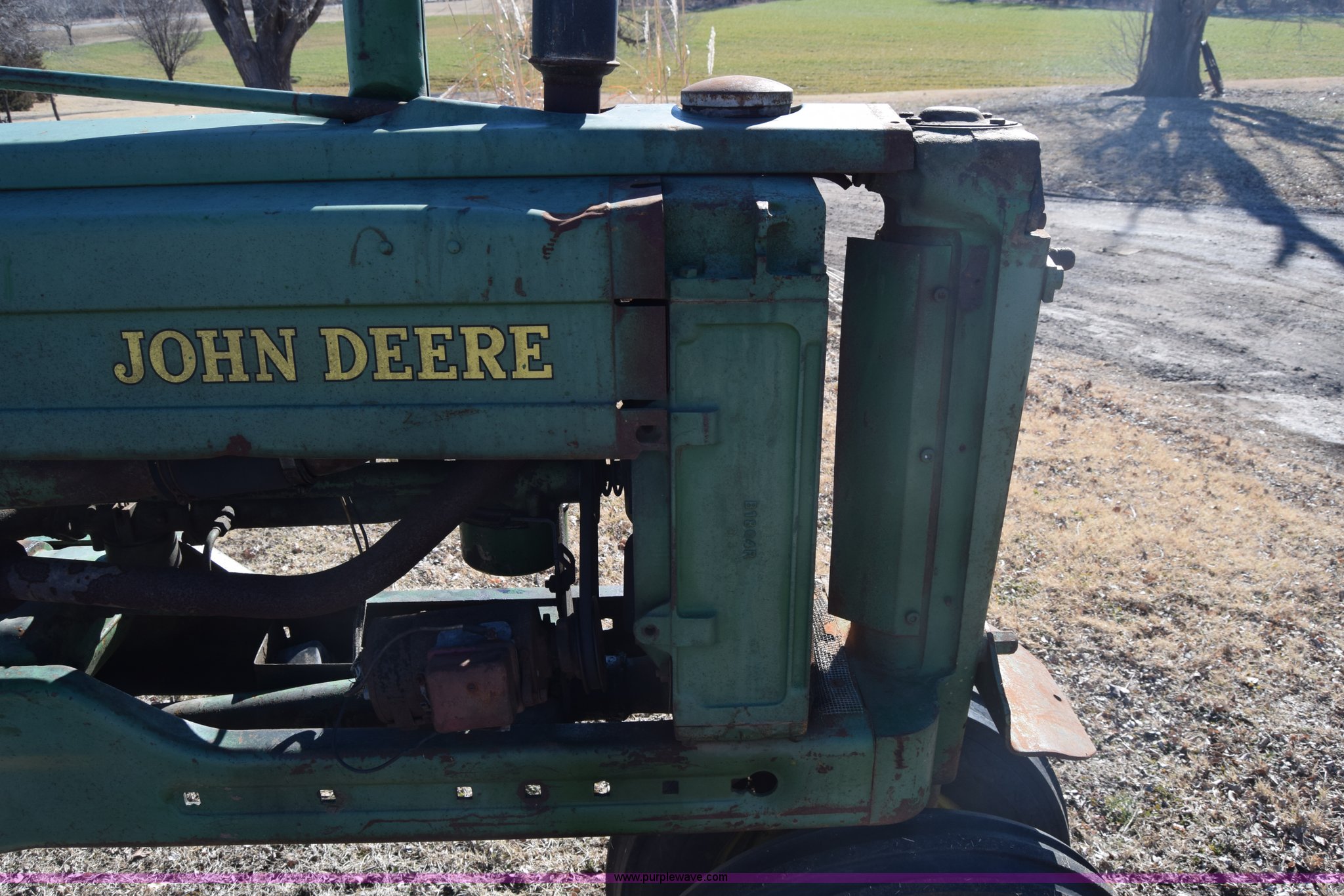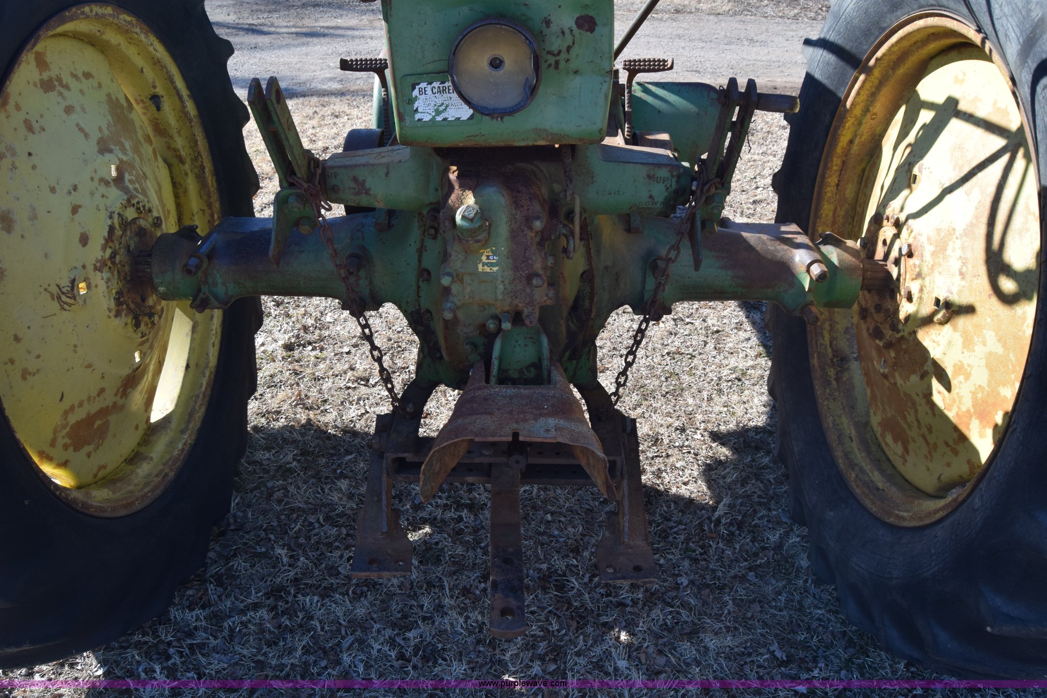 Purple Wave is selling a used Tractor in Kansas. This item is a John Deere B tractor with the following: John Deere two cylinder gas engine, 16 HP, Manual transmission, 4F-1R gears, Work lights, Two point, 540 PTO, 12 gallon fuel tank, 6.00-16 front tires, 14.9-38 rear tires, 3,275 lbs. base operating weight, Serial B24638