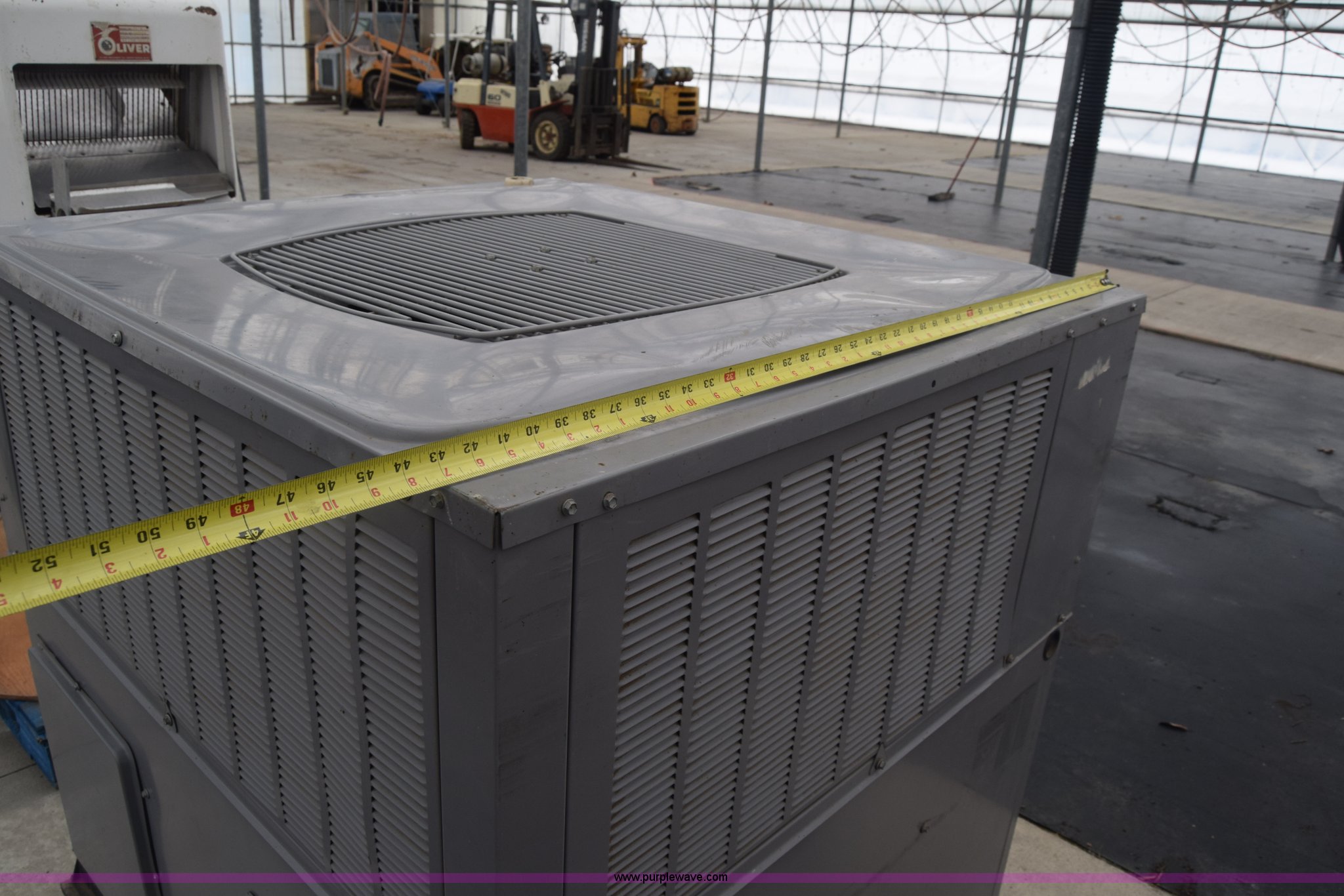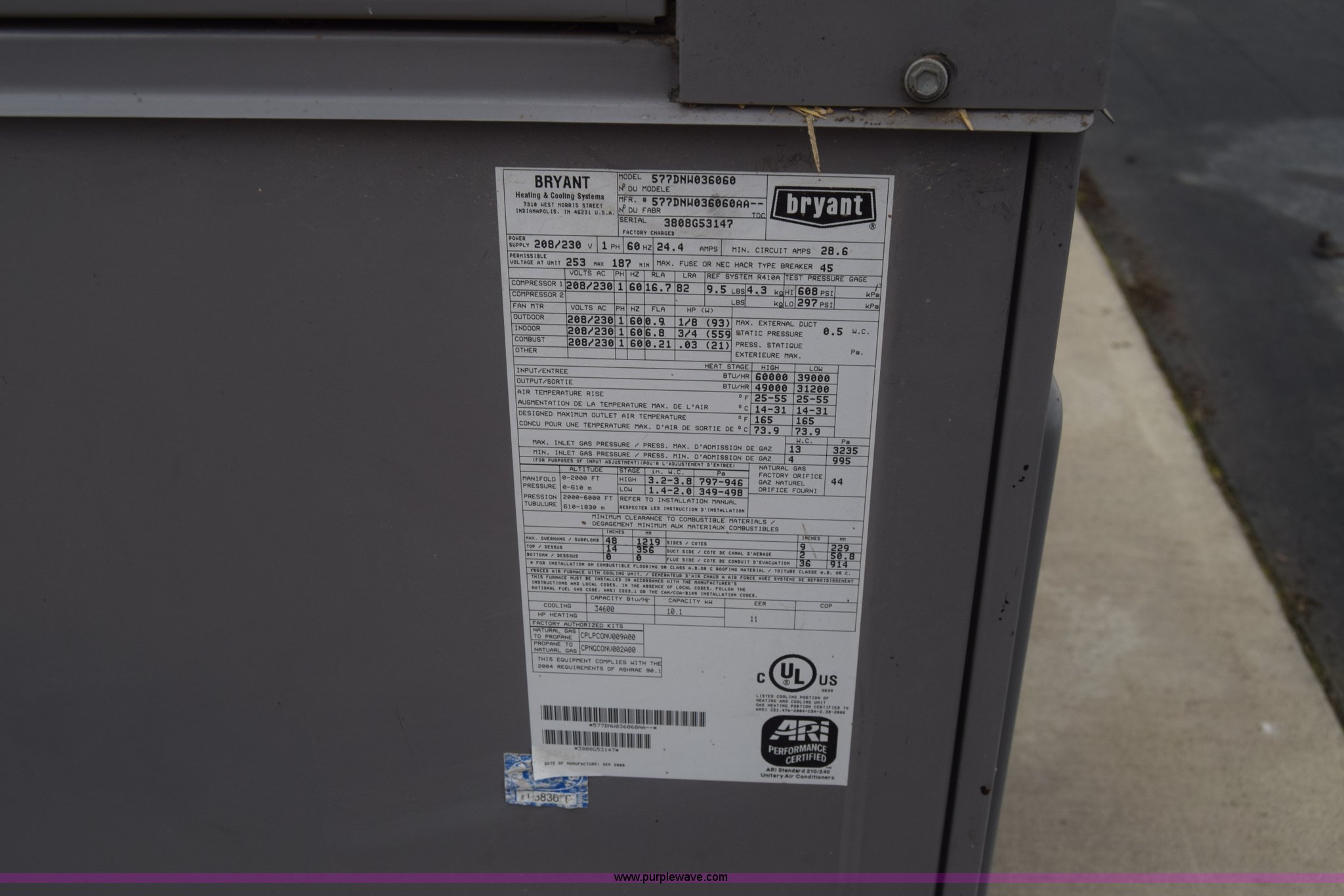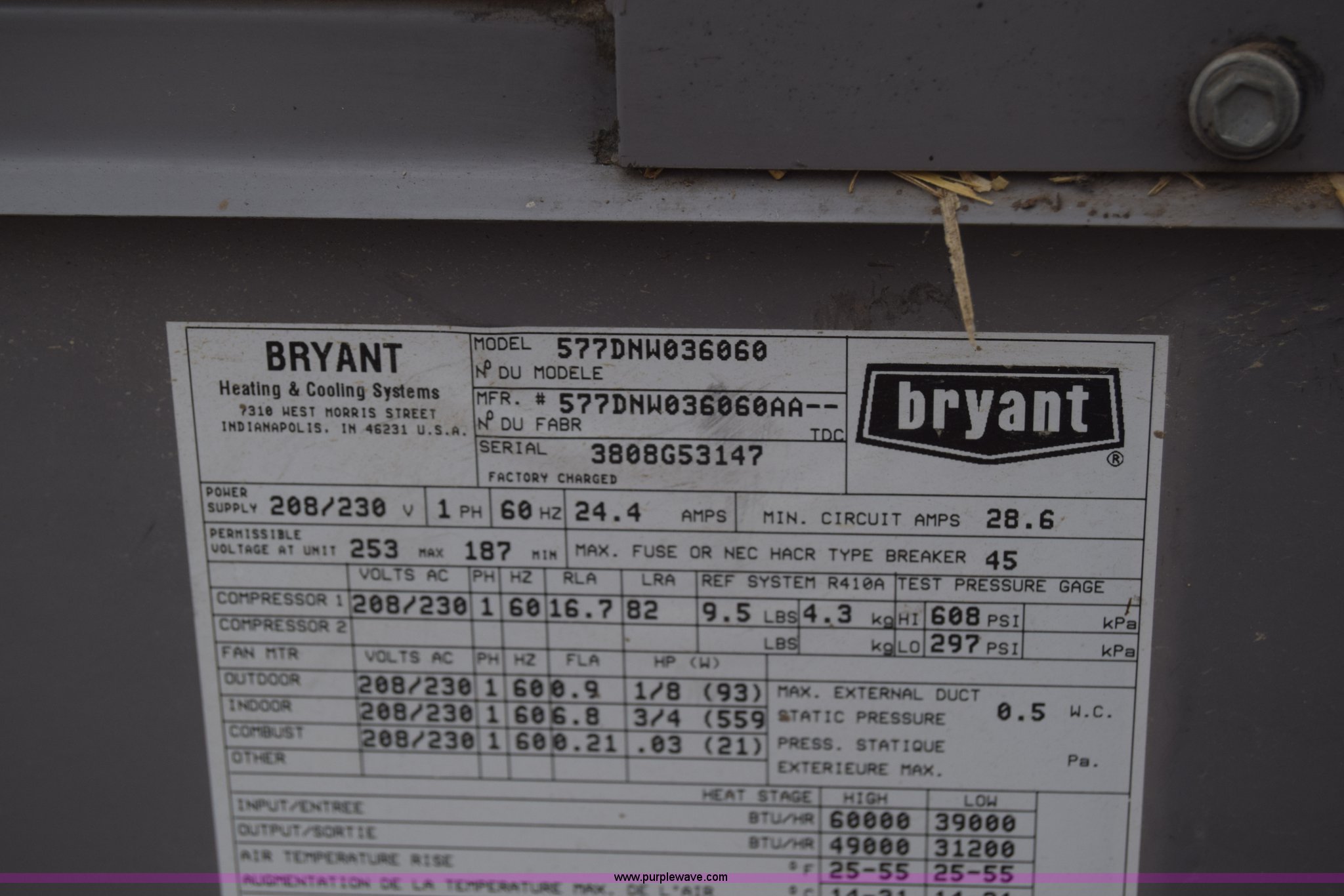 Bryant heating and cooling system. Model 577DNW036060, 48" x 44" x 48"H, Central AC, Gas heating, 208/230V, Single phase. Johnson Ag. 17701 Holmes Road. Belton, MO 64012