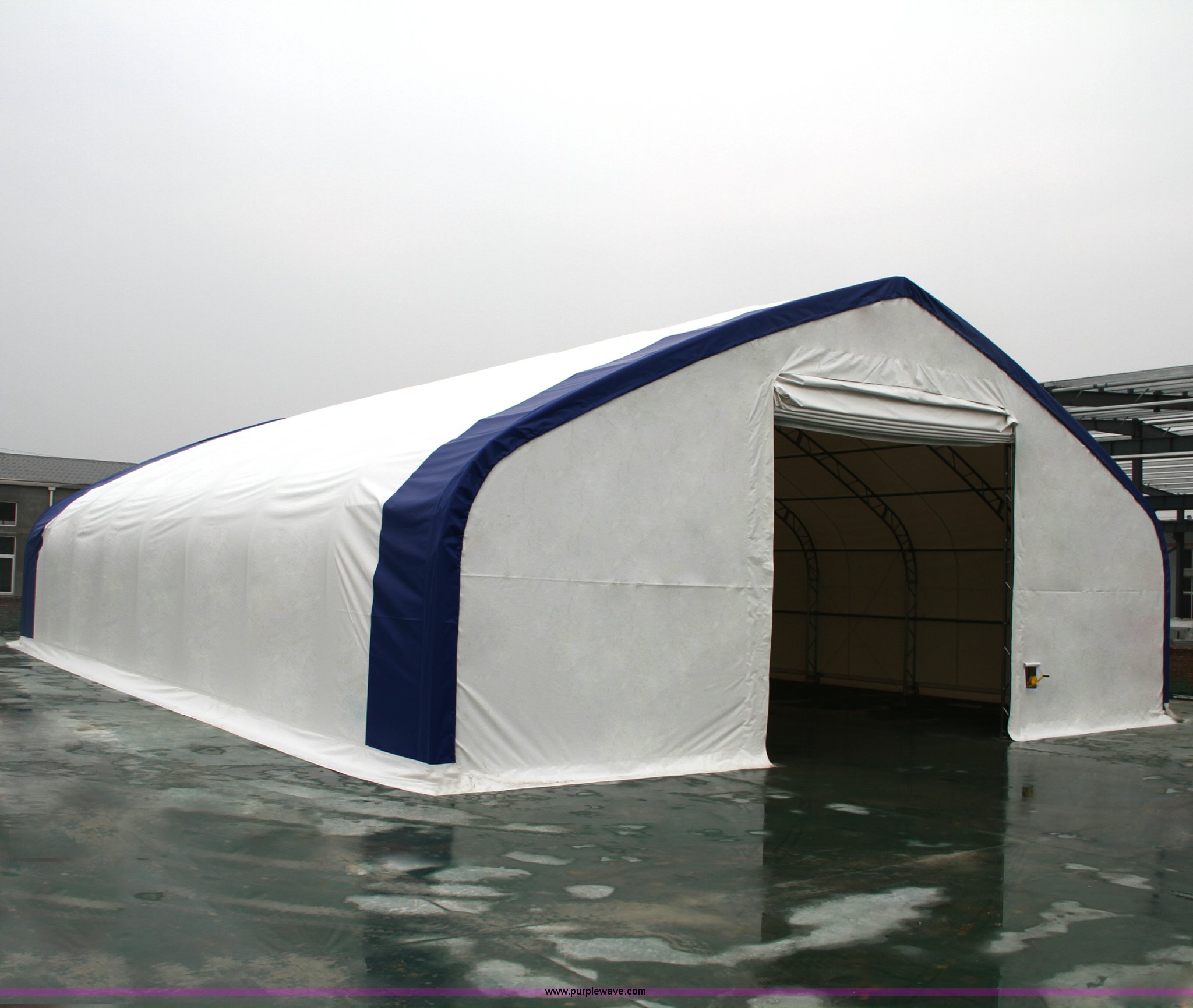 Purple Wave is selling a used Building Materials in Minnesota. This item is a Premium Storage Building™ with the following: Model 50x100x23DT, 5,000 sq. ft., 18'W x 16'H doors, (2) semi hard steel/fabric track frame double doors, Steel winch, Wire tension frame bracing, Heavy double truss galvanized steel frame, Quad ratchet tension system, Basic anchoring system, UV and fire resistant fabric cover, 2.65 oz PVC rip stop fabric covering, 750 gsm, 10' arch distance, Bolt together arches, Double truss frame