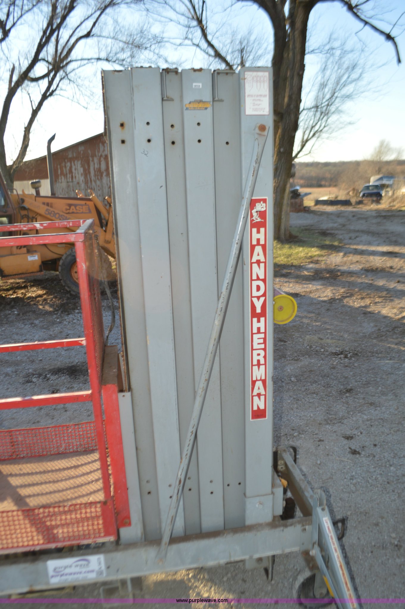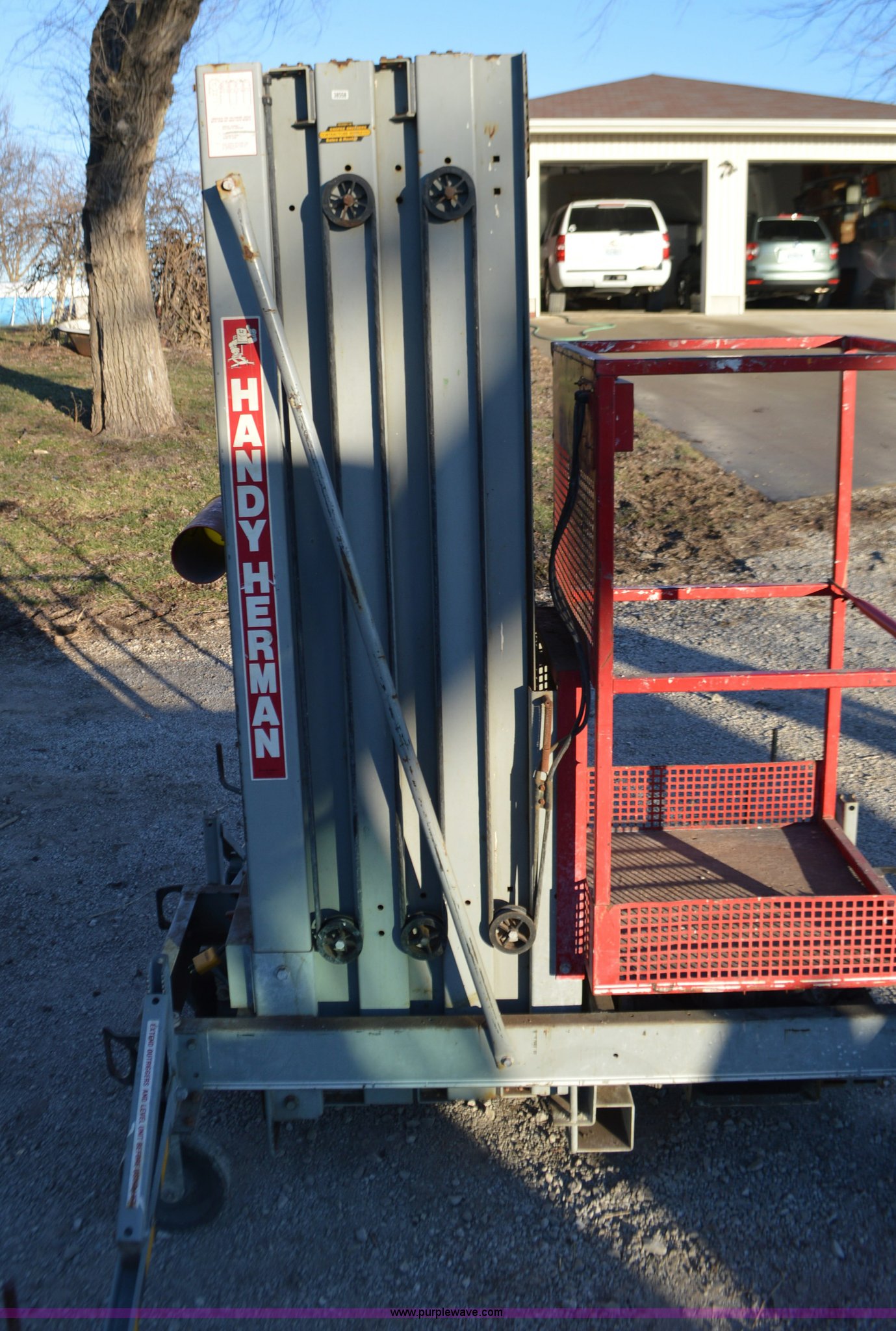 1997 Handy Herman 24D manlift. 34' max lift height, 12V, 2' x 2' x 44" platform, Serial 07503345. View equipment video. 1164 SW St Route 13. Leeton, MO 64761