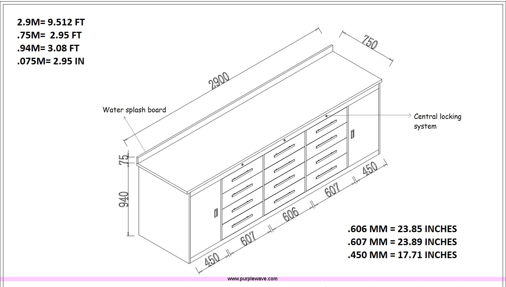 Toolbox. 9.51' x 2.95' x 3.08', (12) drawers Roll bearing drawers, Central locking system, Sealed back and base, Steel layered over wood top, Back splash, Unused. Seller provided shipping available to a commercial address with a forklift in the lower 48 states for $225. Optional insurance $35. Representative photo. Canada West Supply. 1100 McKinley St. Anoka, MN 55303