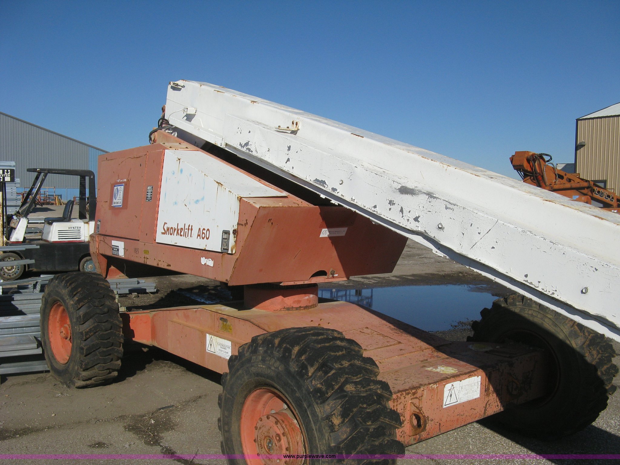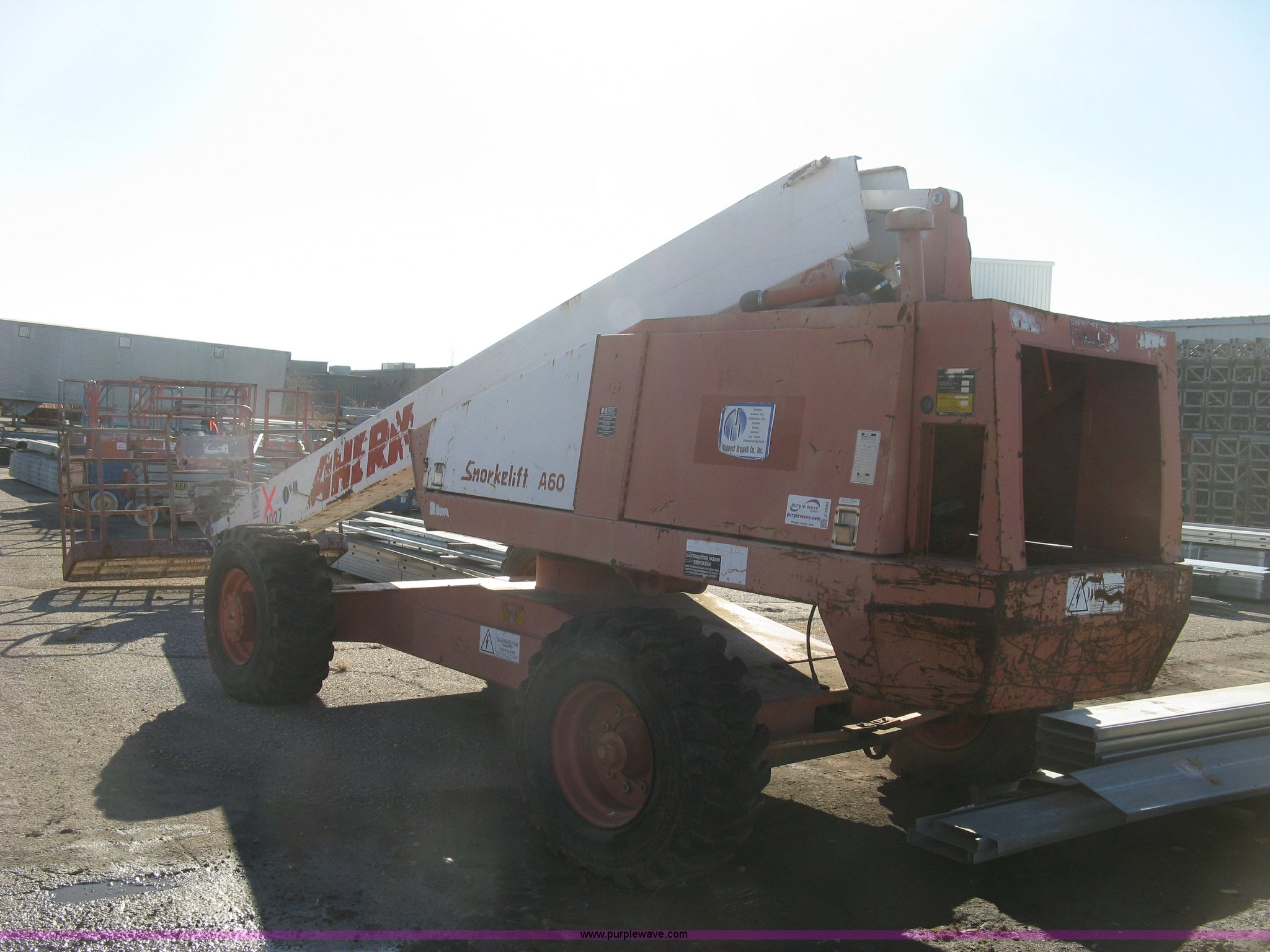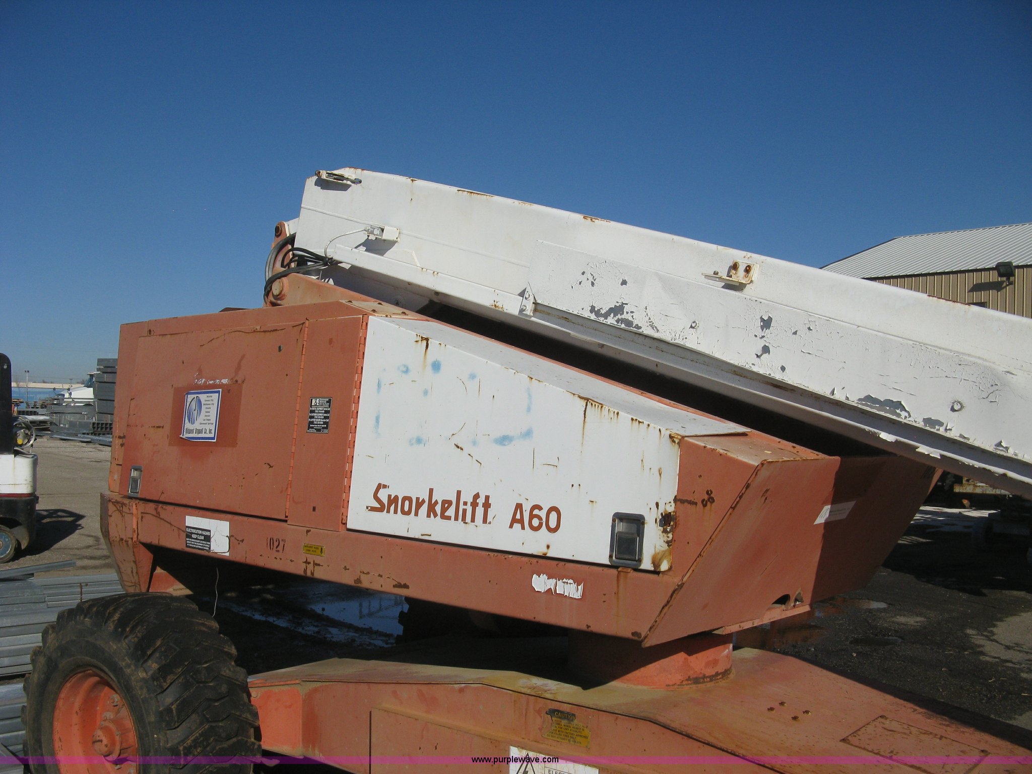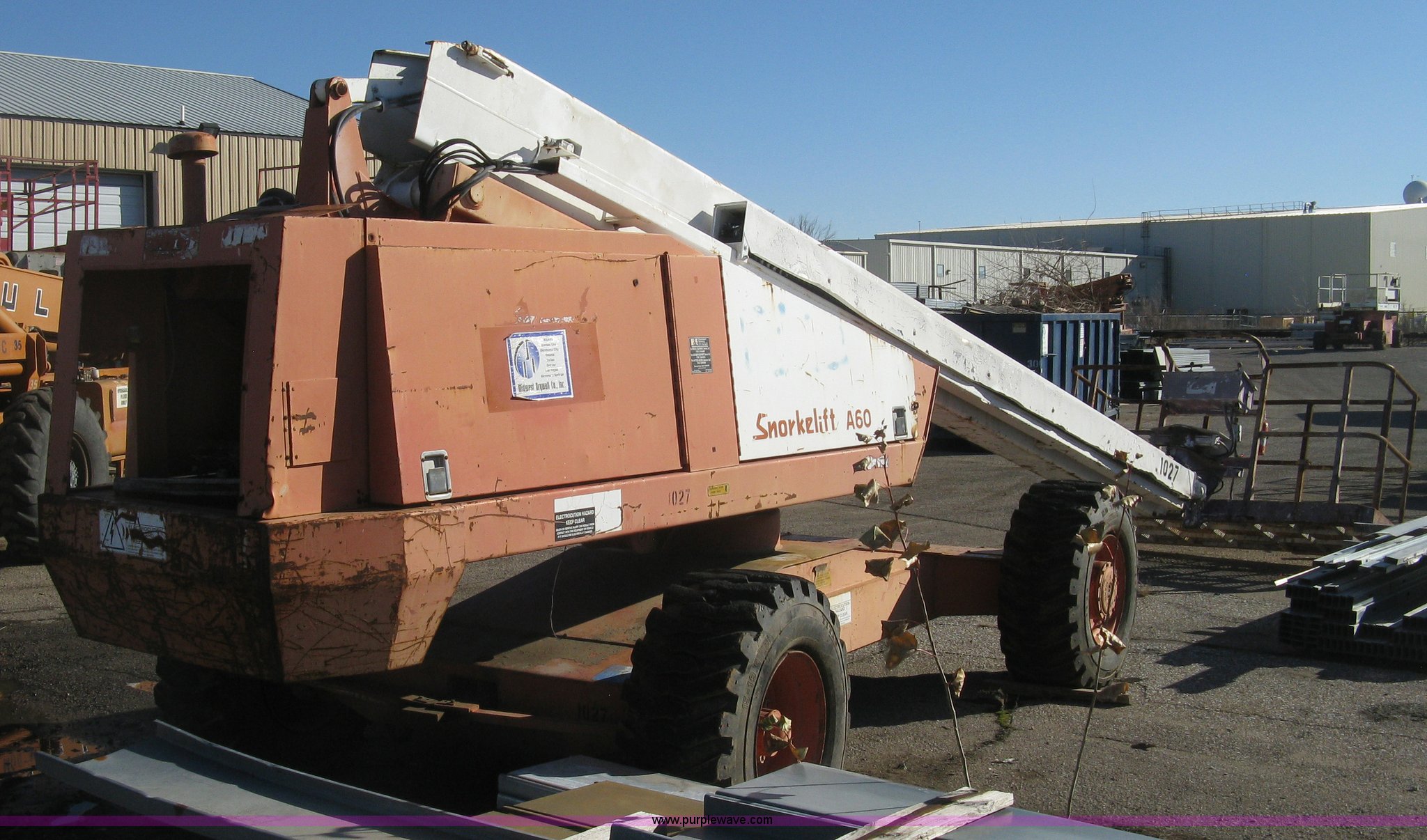 Purple Wave is selling a used Boom Lift in Kansas. This item is a Snorkelift A60R boom lift with the following: 5,823 hours on meter, No engine, 500 lbs maximum lift capacity, 60' maximum reach, 92"L x 30"W platform, Platform controls, AC power outlet, Platform rotation, 15-19.5 foam filled tires, Non-operational unit, Serial 9007950790, Unit# 1027