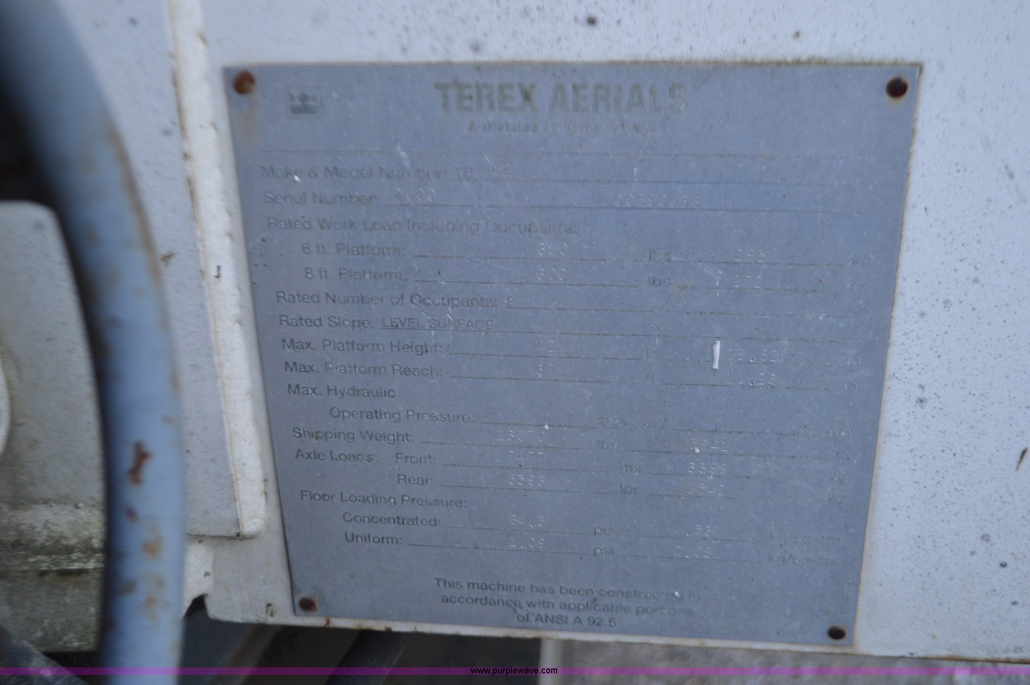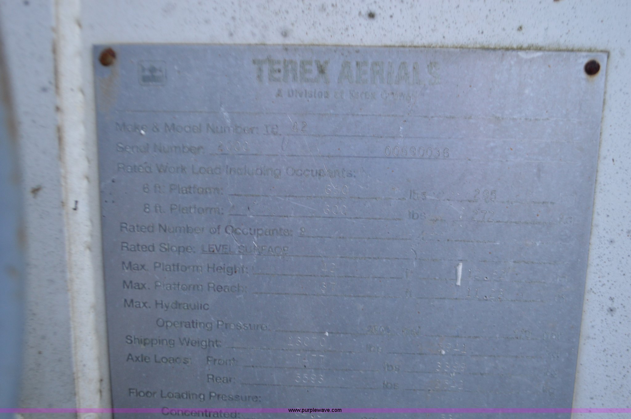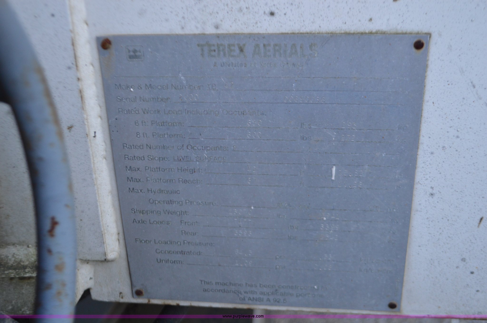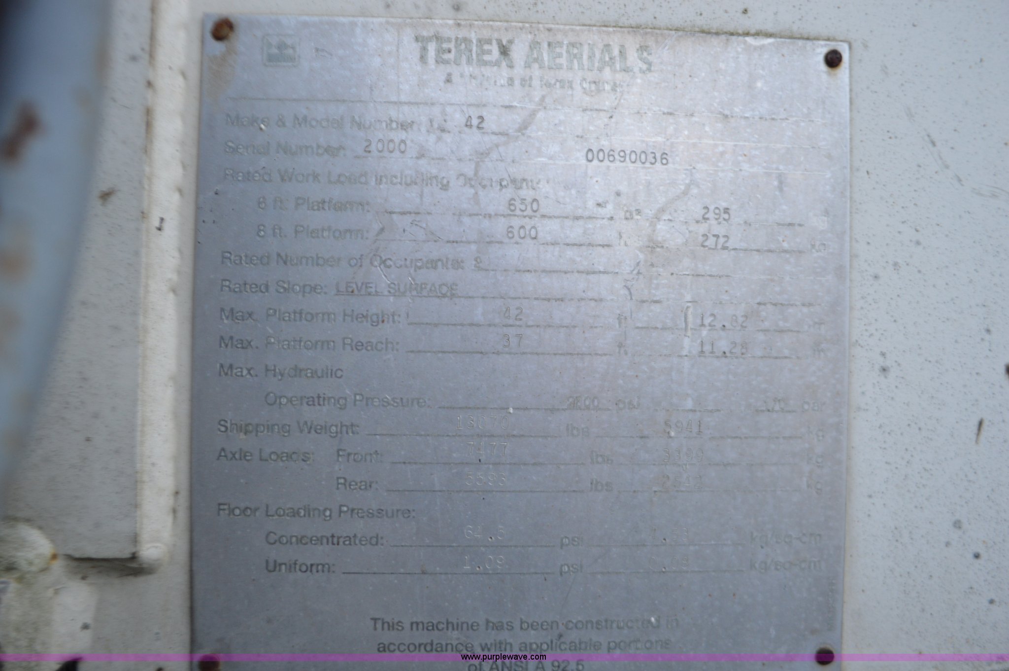 2000 Terex TB42 boom lift. 3,389 hours on meter, Ford dual fuel engine Model LRG-425P-6006A, Gas or propane capable, Serial 09790-1-05-99, Selector stuck on propane, Hydrostatic transmission, Four wheel drive, 42' maximum platform height, 6'W platform, Propane tank included, Serial 00690036. 14029 Highway 32. Sainte Genevieve, MO 63670