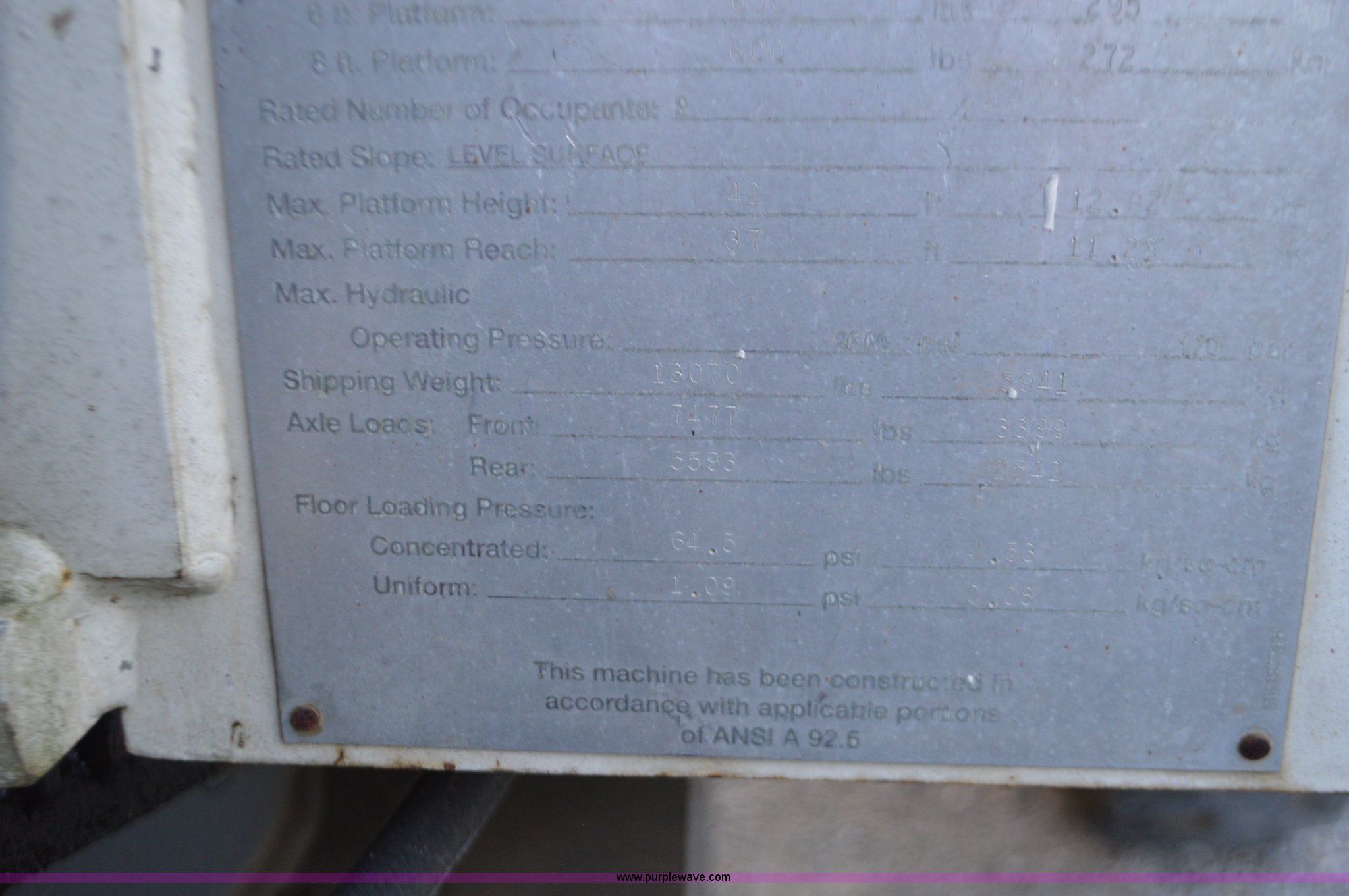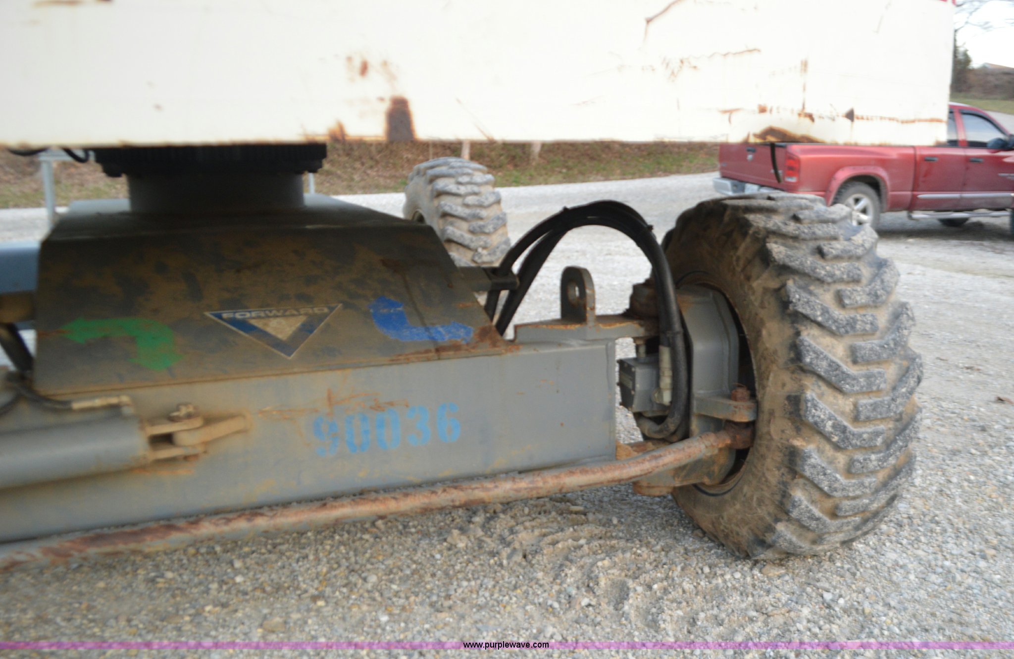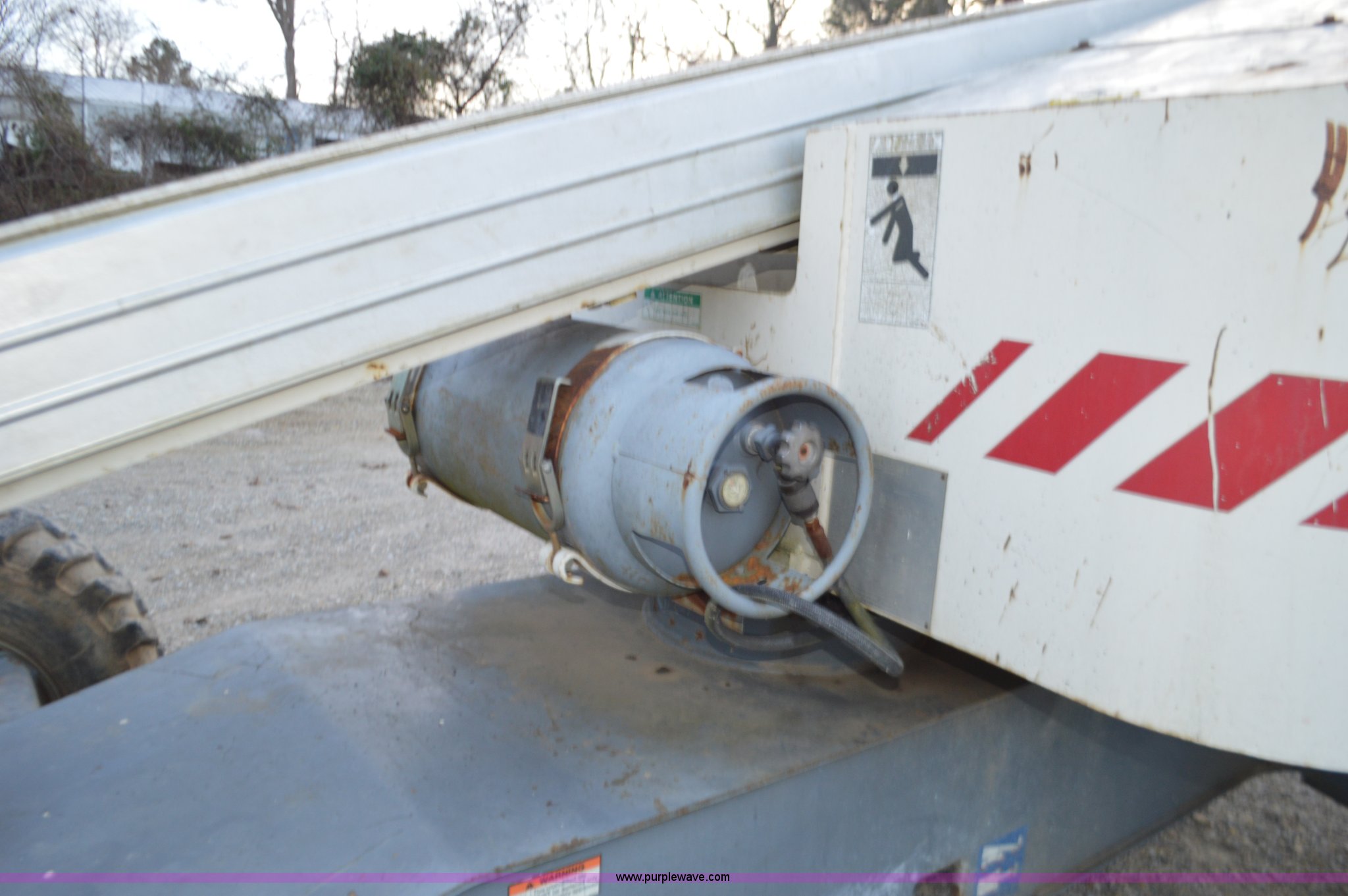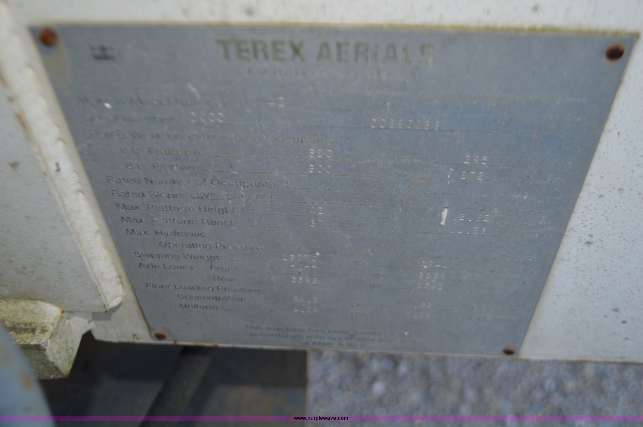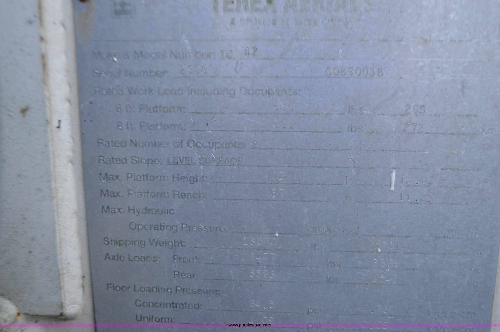 2000 Terex TB42 boom lift. 3,389 hours on meter, Ford dual fuel engine Model LRG-425P-6006A, Gas or propane capable, Serial 09790-1-05-99, Selector stuck on propane, Hydrostatic transmission, Four wheel drive, 42' maximum platform height, 6'W platform, Propane tank included, Serial 00690036. 14029 Highway 32. Sainte Genevieve, MO 63670