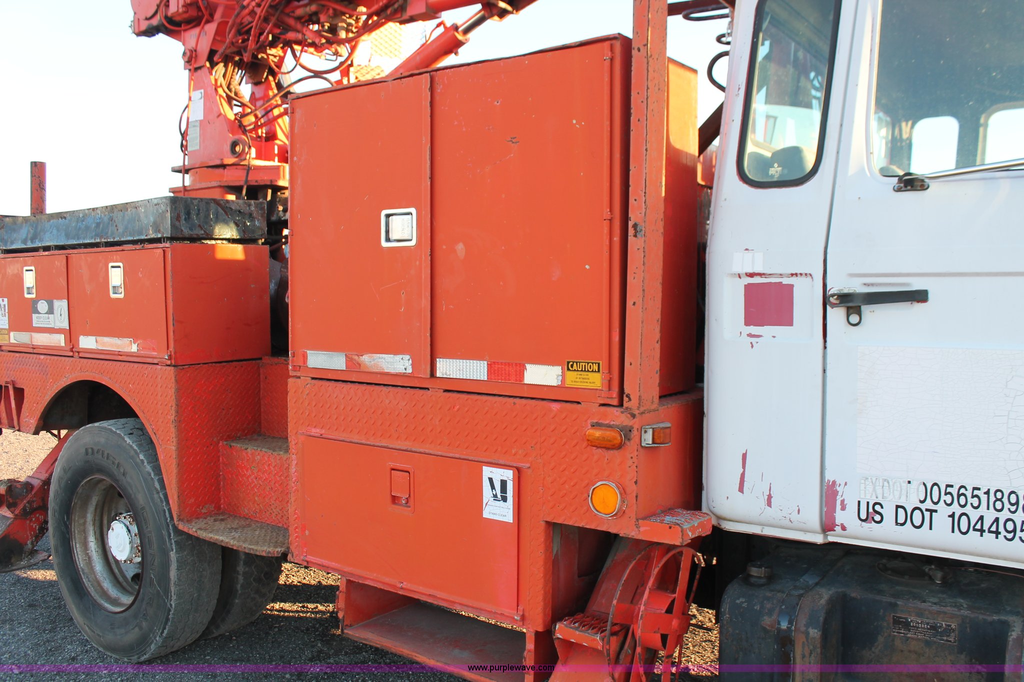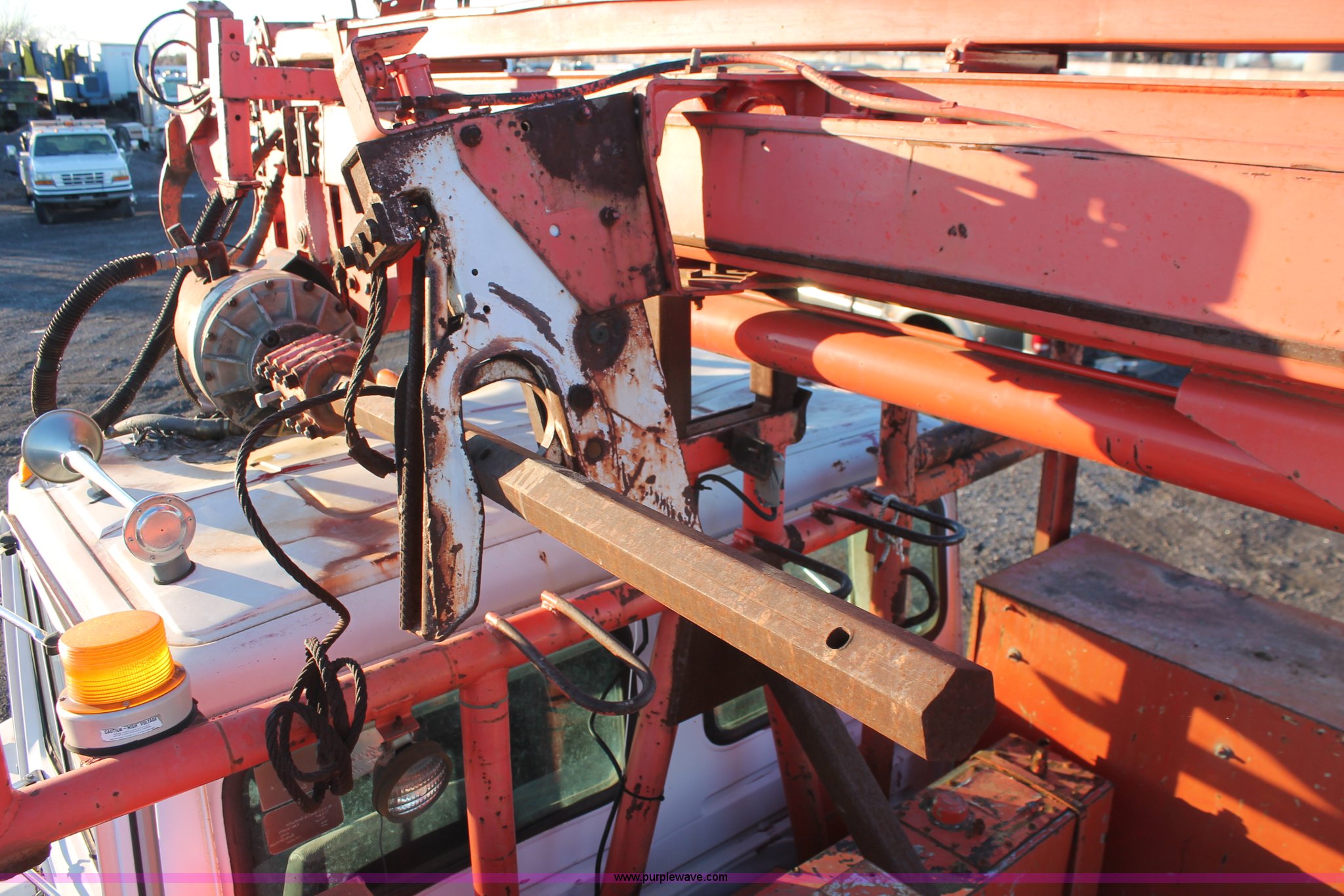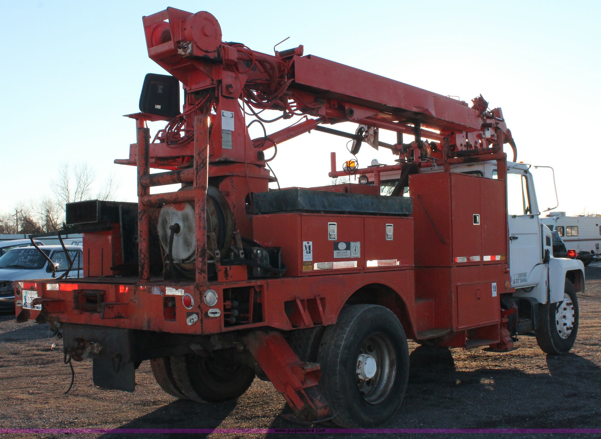 Purple Wave is selling a used Digger Derrick Truck in Oklahoma. This item is a 1993 Mack CS300T digger derrick truck with the following: 122,070 miles on odometer, Renault 6.2L six cylinder turbo diesel engine, Nine speed manual transmission, Heat, Spring suspension seat, PTO, Rawson Koenig 14.5'L service bed, Shelving, Pintle hitch, Telelect Commander C130 digger derrick, Serial C130-1011JM, 35.1' boom length, 15,000 lbs maximum lift capacity, 44.3' maximum lift height, Ground and platform controls, Telescopic boom, 20" auger, (4) outriggers, 2.5" hex head, Auxiliary hydraulic outlet, Single fuel tank, 176" wheelbase, Spring suspension, Air brakes, 11R22.5 tires, Boom dented, One lift cylinder missing, Unknown operating condition