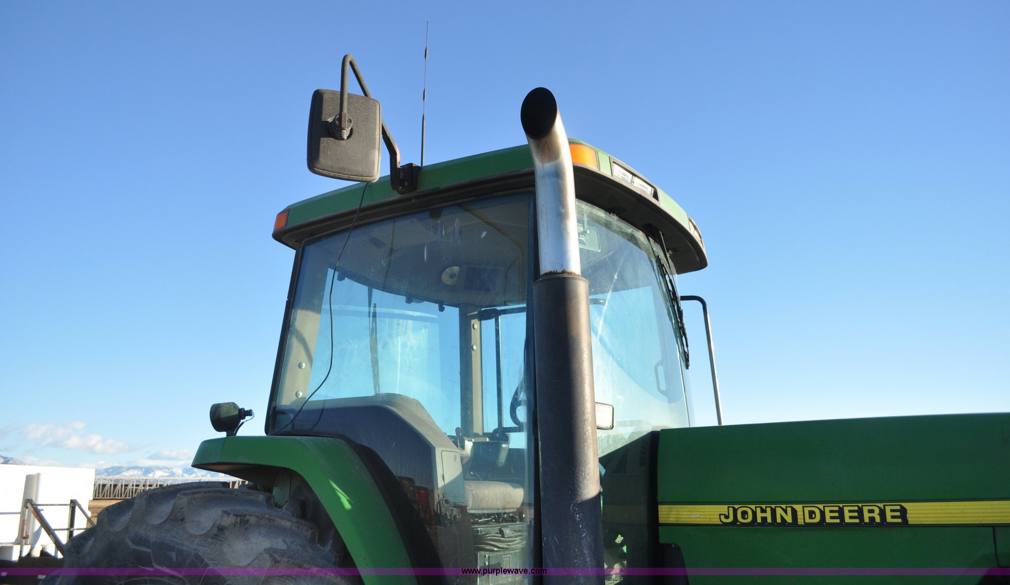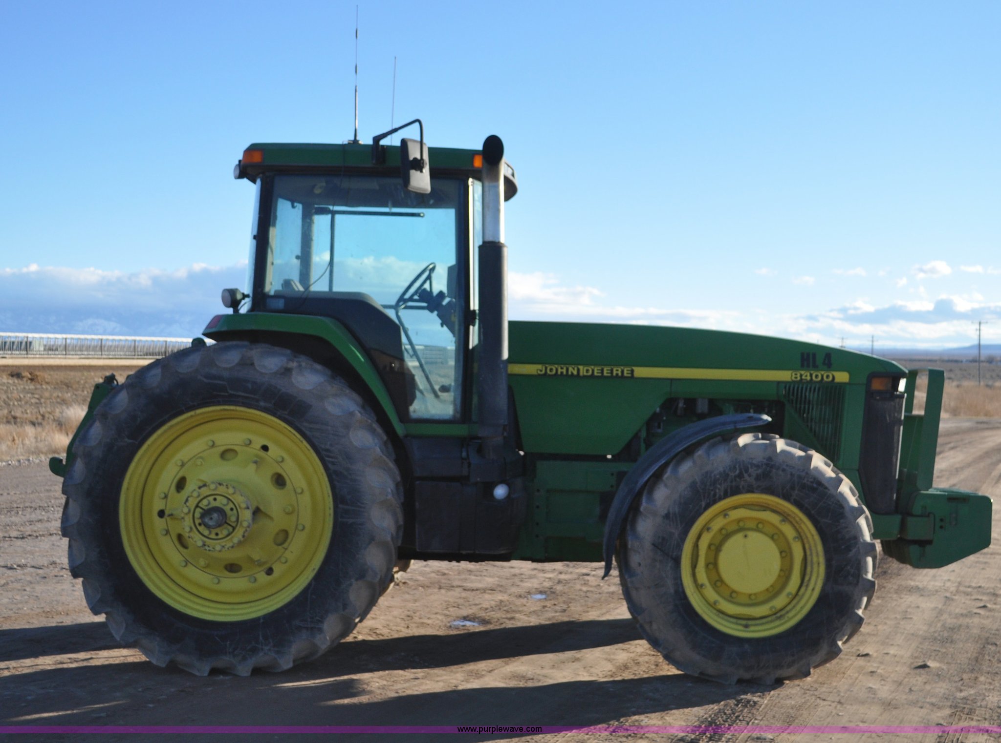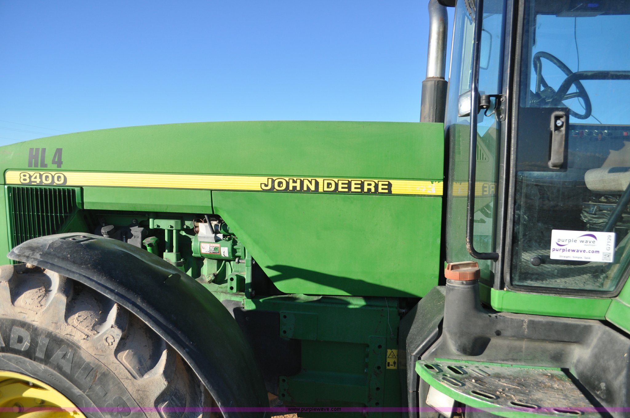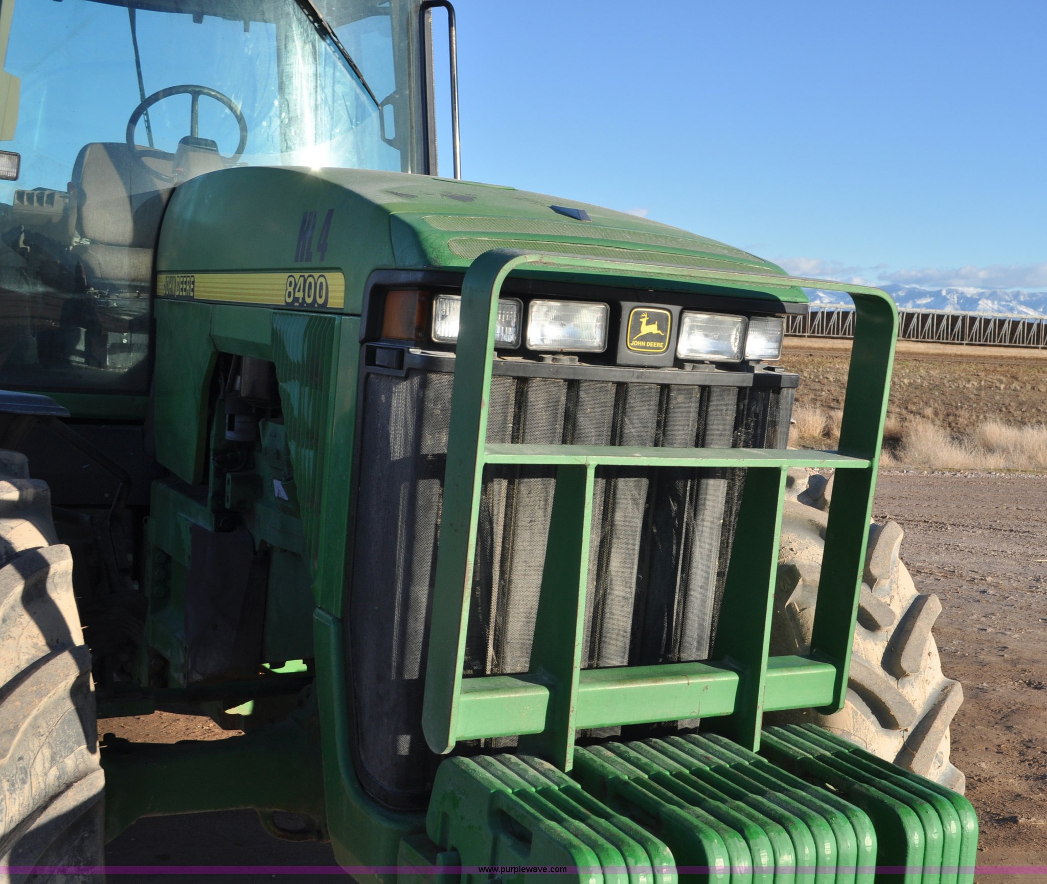 Purple Wave is selling a used Tractor in Utah. This item is a 1997 John Deere 8400 MFWD tractor with the following: 1,064 hours on meter, John Deere 8.1L six cylinder turbo diesel engine, Powershift transmission, 16F-4R gears, Differential lock, AC and heat, Tilt steering wheel, AM/FM, Air suspension seat, Three point, Top link, Quick attach, Large 1000 PTO, Seven pin outlet, (4) hydraulic remote sets, (16) suitcase weights, Wheel weights, 420/85R30 front tires, 480/80R46 rear tires, Dual wheels included, Serial RW8400P012202