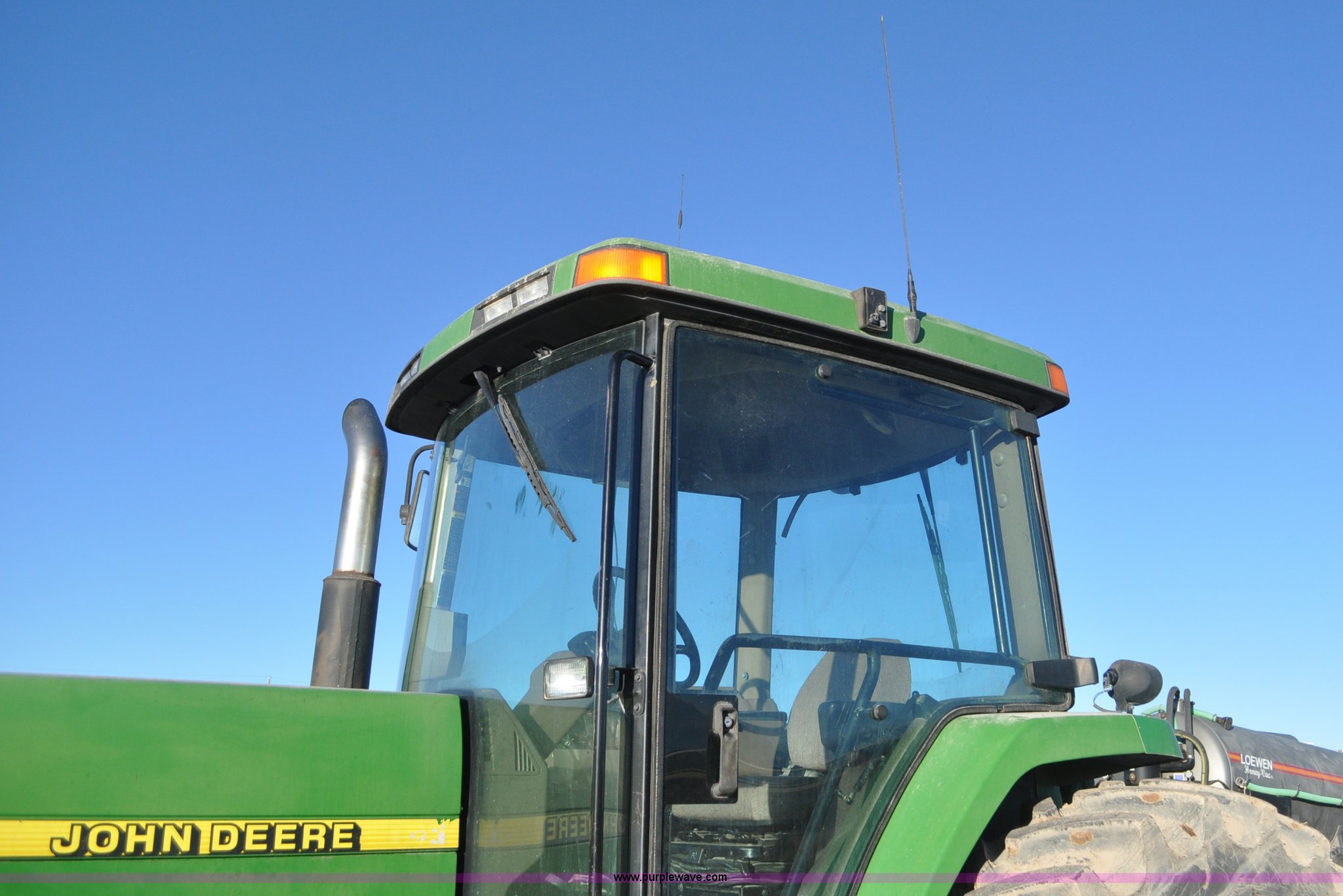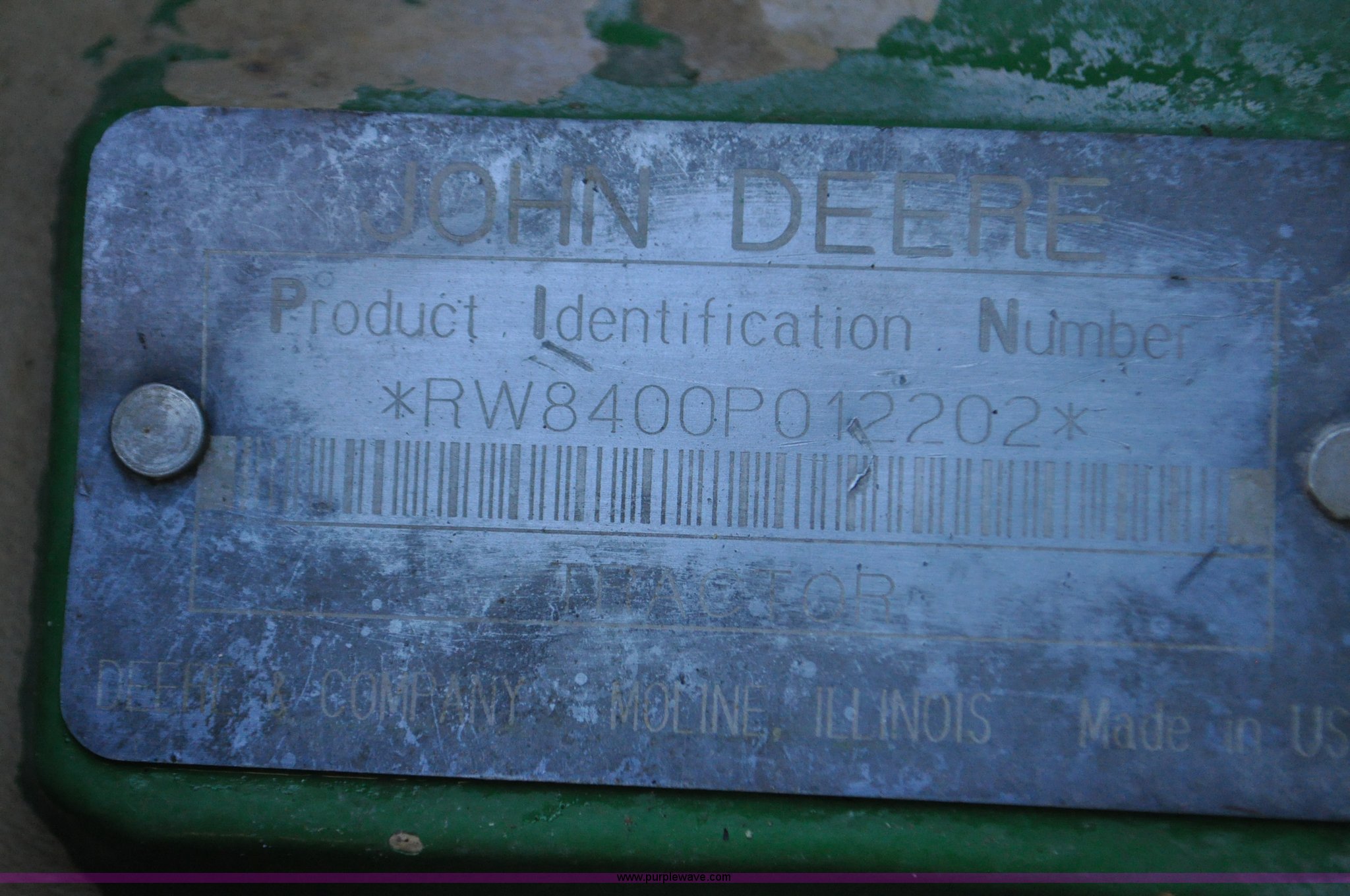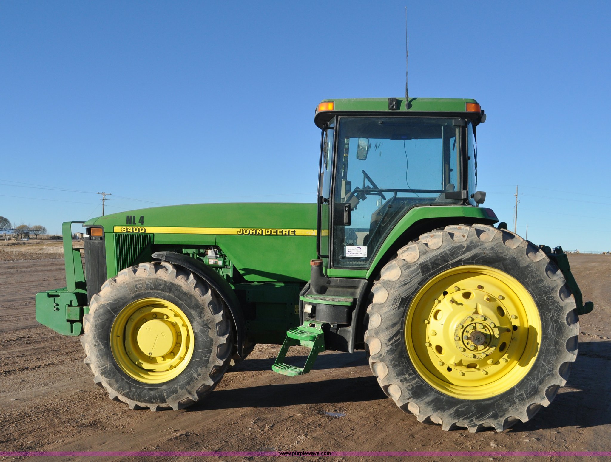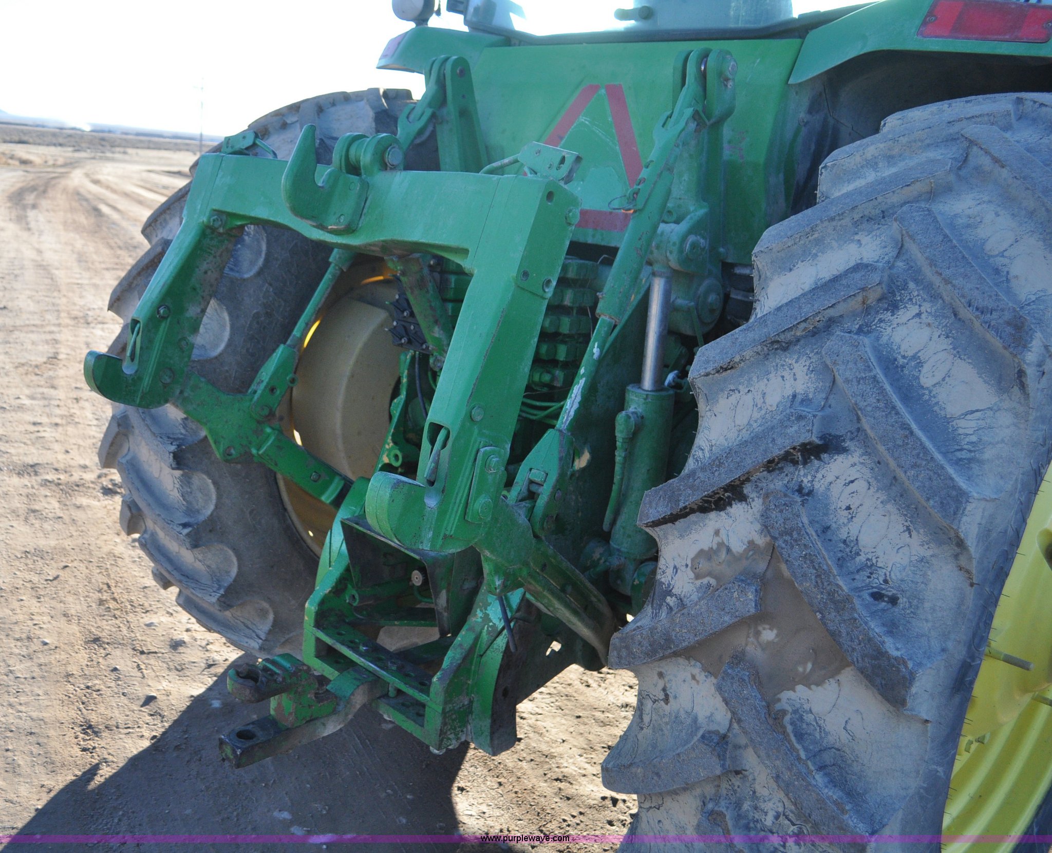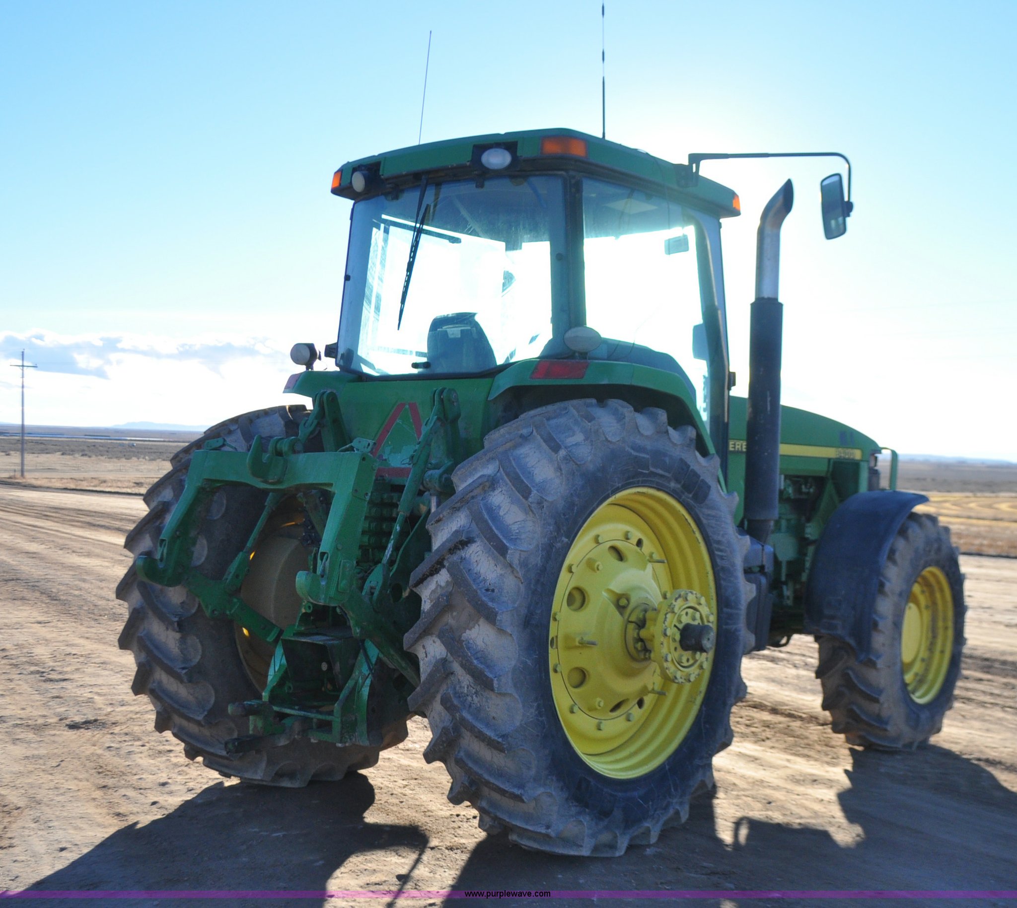 Purple Wave is selling a used Tractor in Utah. This item is a 1997 John Deere 8400 MFWD tractor with the following: 1,064 hours on meter, John Deere 8.1L six cylinder turbo diesel engine, Powershift transmission, 16F-4R gears, Differential lock, AC and heat, Tilt steering wheel, AM/FM, Air suspension seat, Three point, Top link, Quick attach, Large 1000 PTO, Seven pin outlet, (4) hydraulic remote sets, (16) suitcase weights, Wheel weights, 420/85R30 front tires, 480/80R46 rear tires, Dual wheels included, Serial RW8400P012202