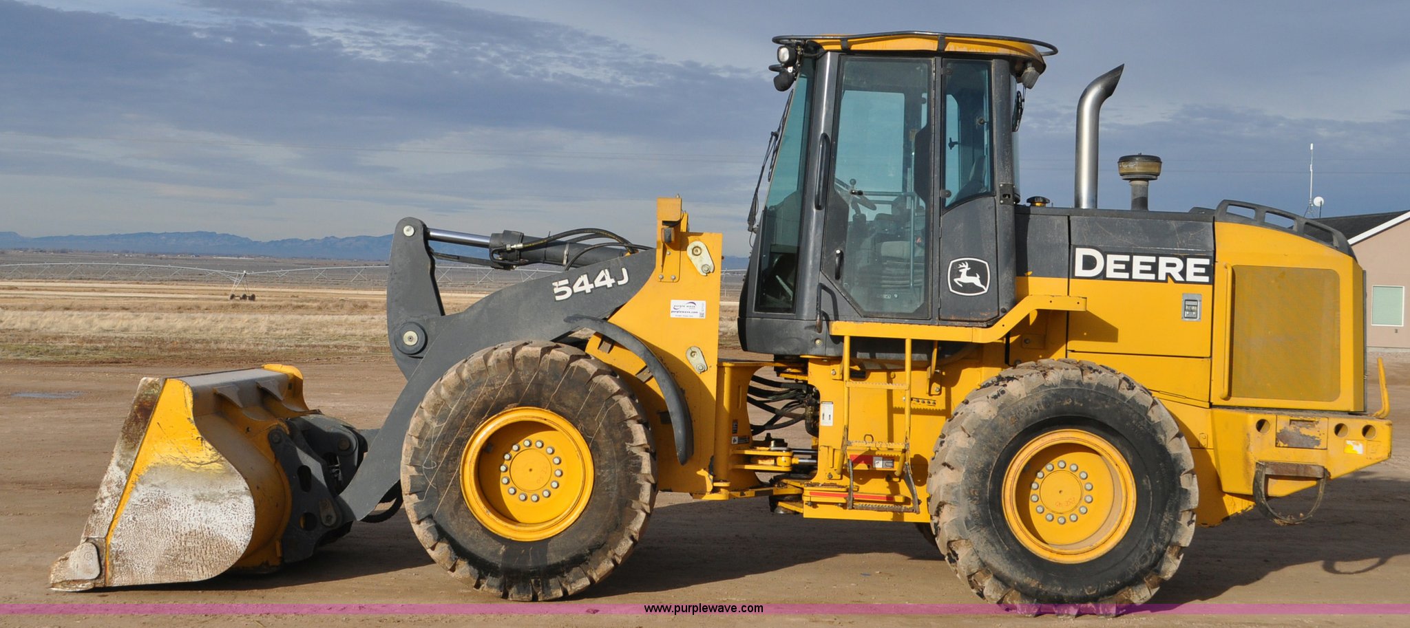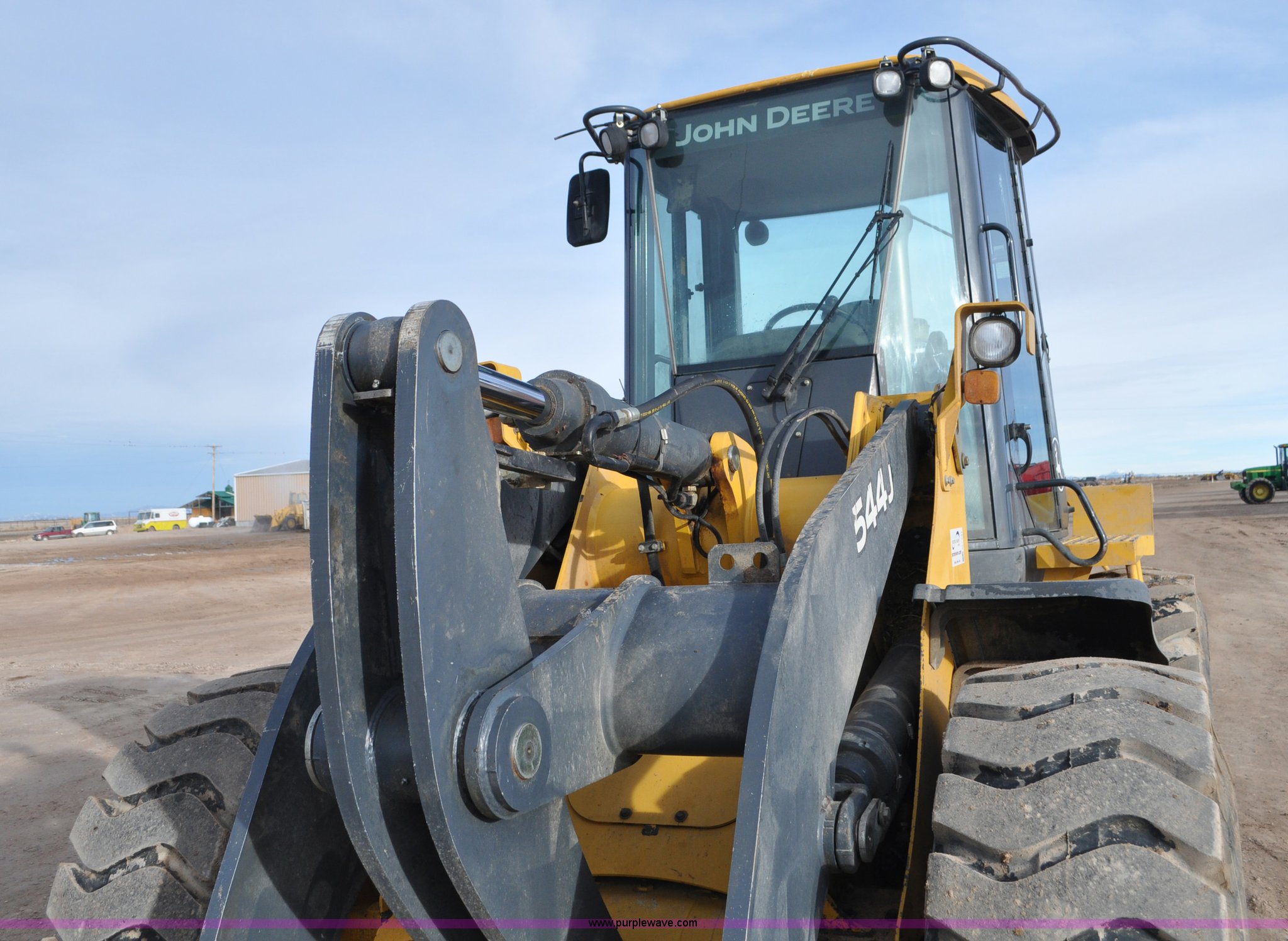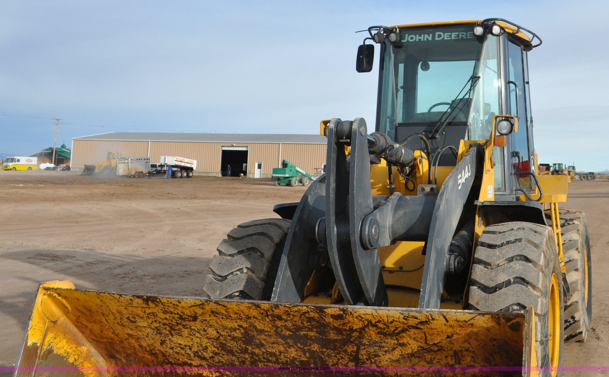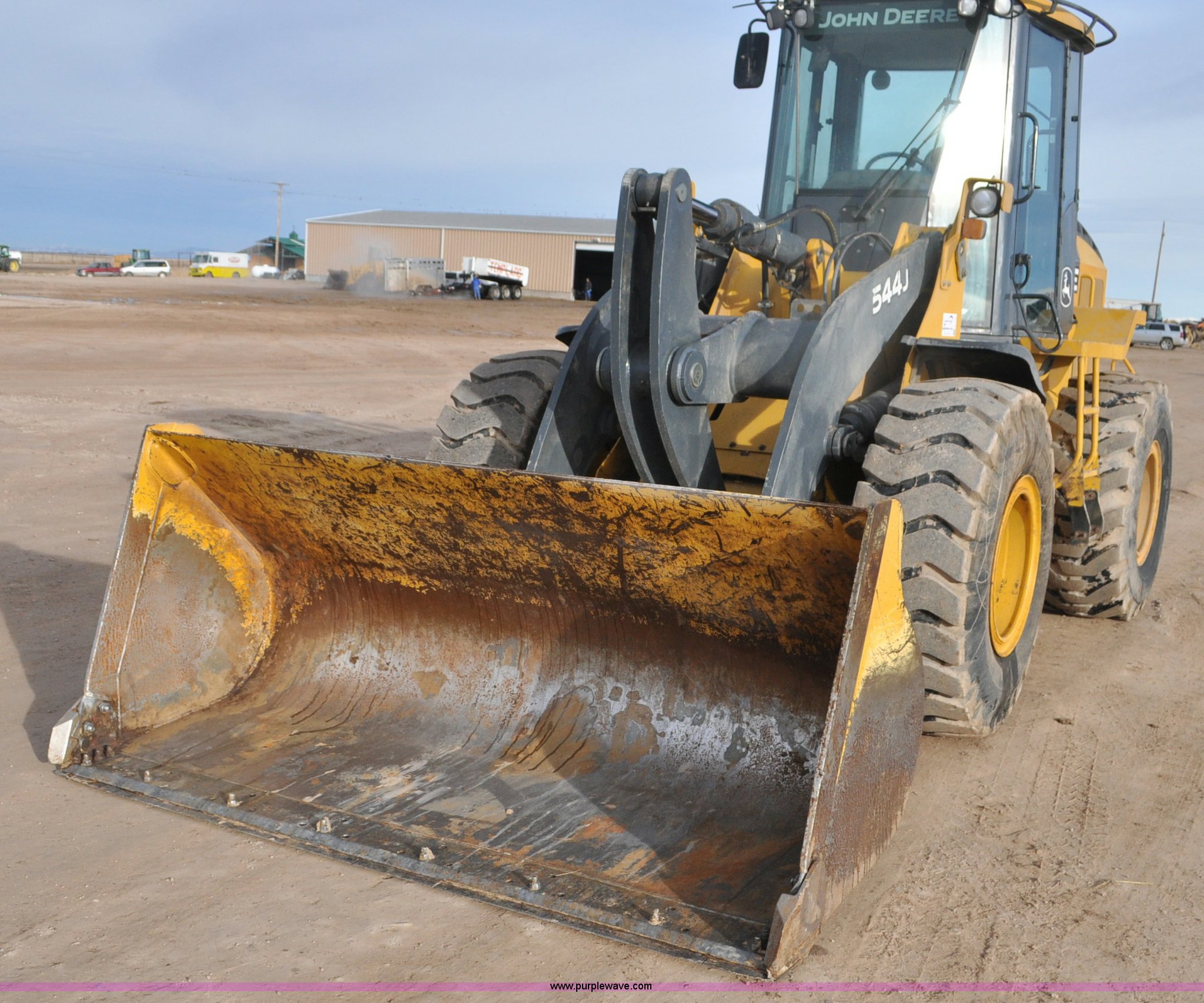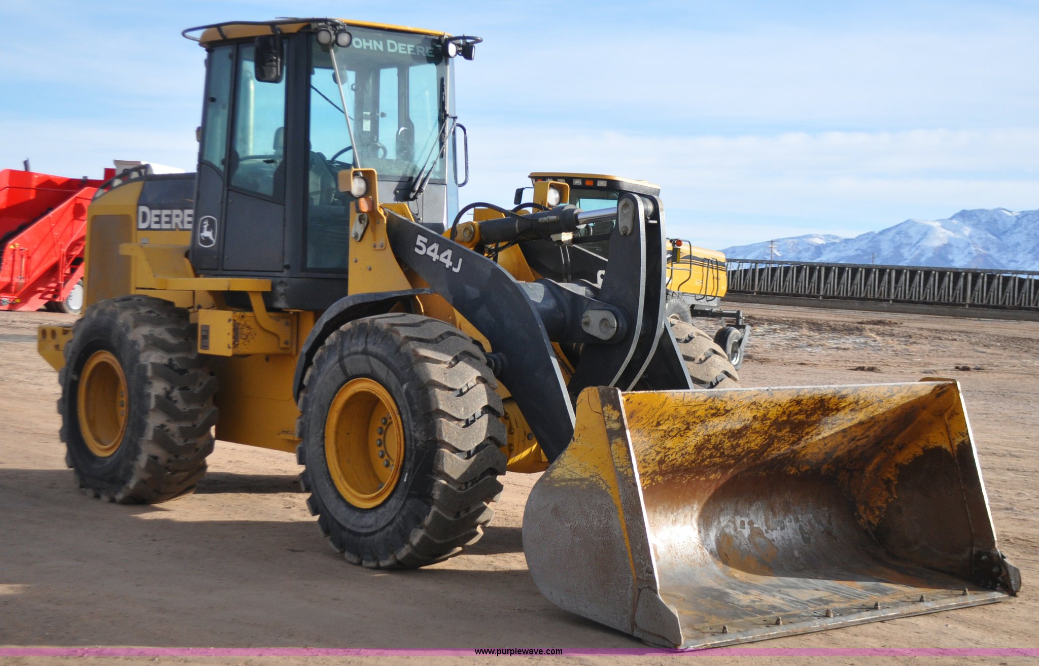Purple Wave is selling a used Wheel Loader in Utah. This item is a 2007 John Deere 544J wheel loader with the following: 27,433 hours on meter, John Deere 6.8L six cylinder turbo diesel engine, 149 HP, Powershift transmission, 4F-3R gears, Differential lock, EROPS, AC and heat, Wipers, Front and rear work lights, John Deere 105"W general purpose bucket, Three cu. yd. capacity, Bolt-on cutting edge, Self-leveling, Hydraulic quick coupler, Counterweights, 20.5-25 tires, 28,332 lbs. base operating weight, Serial DW544JJZ613789
