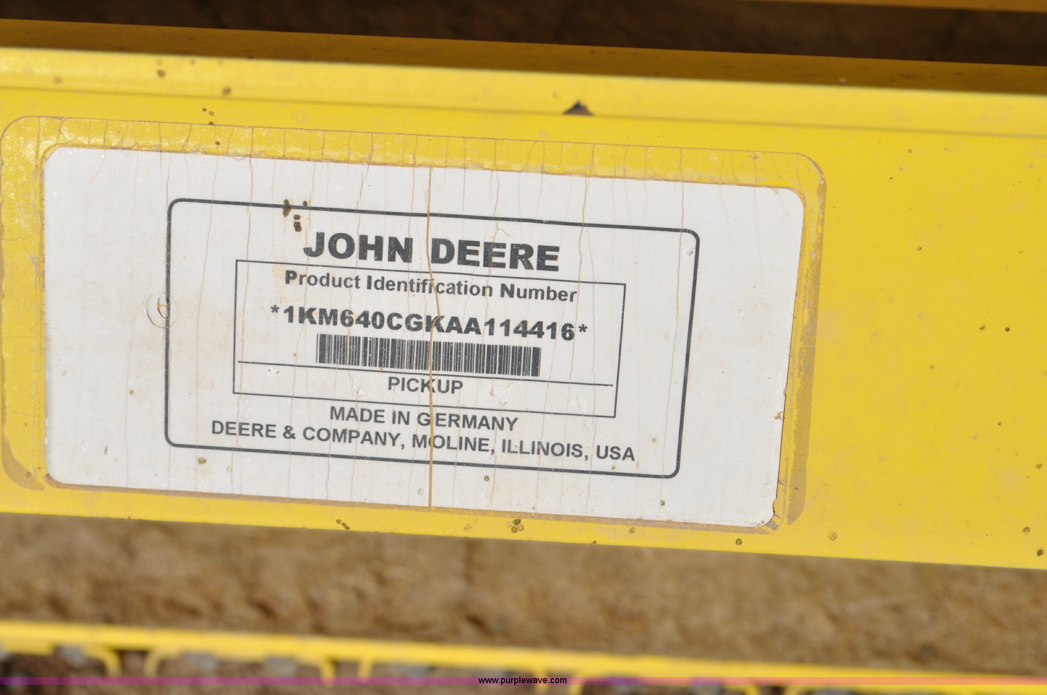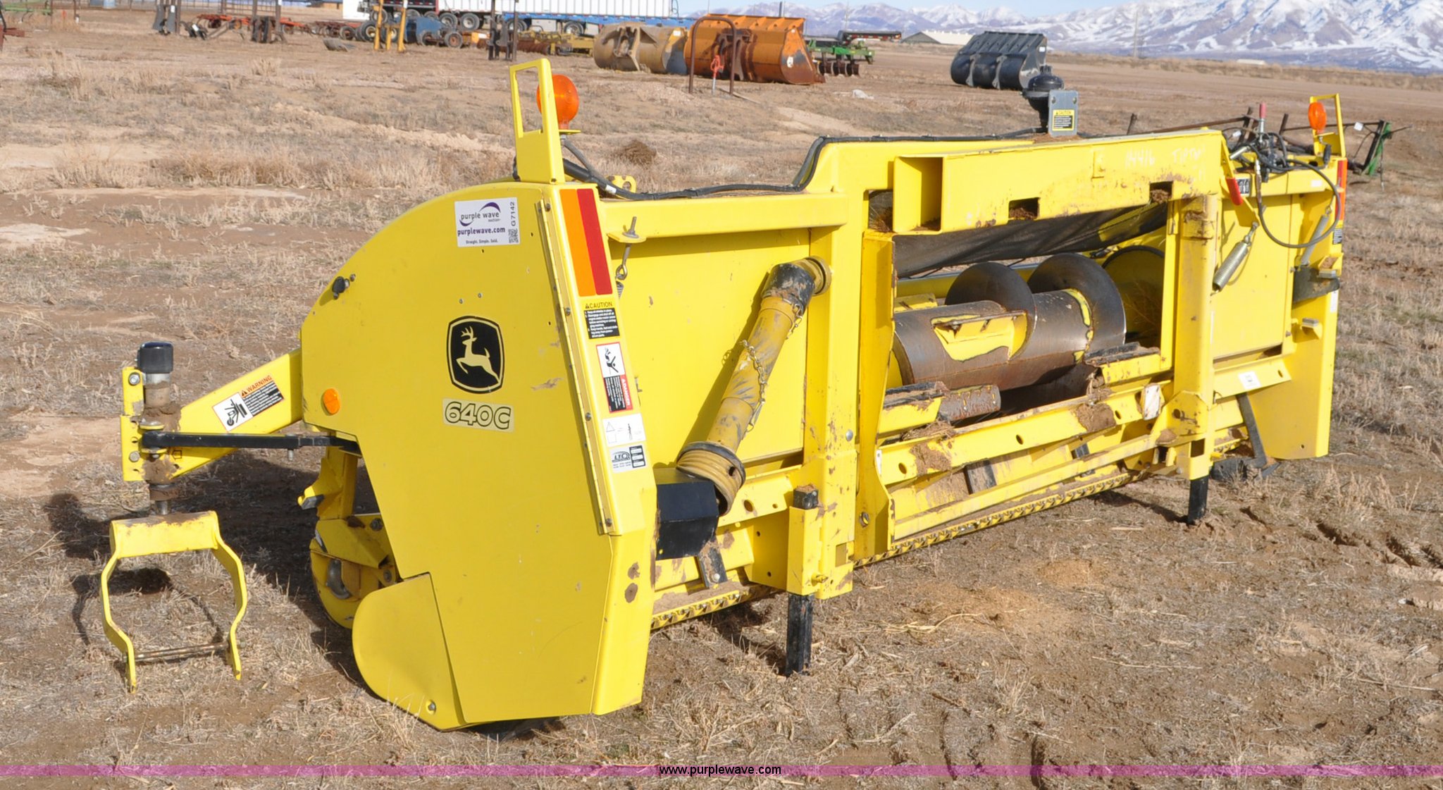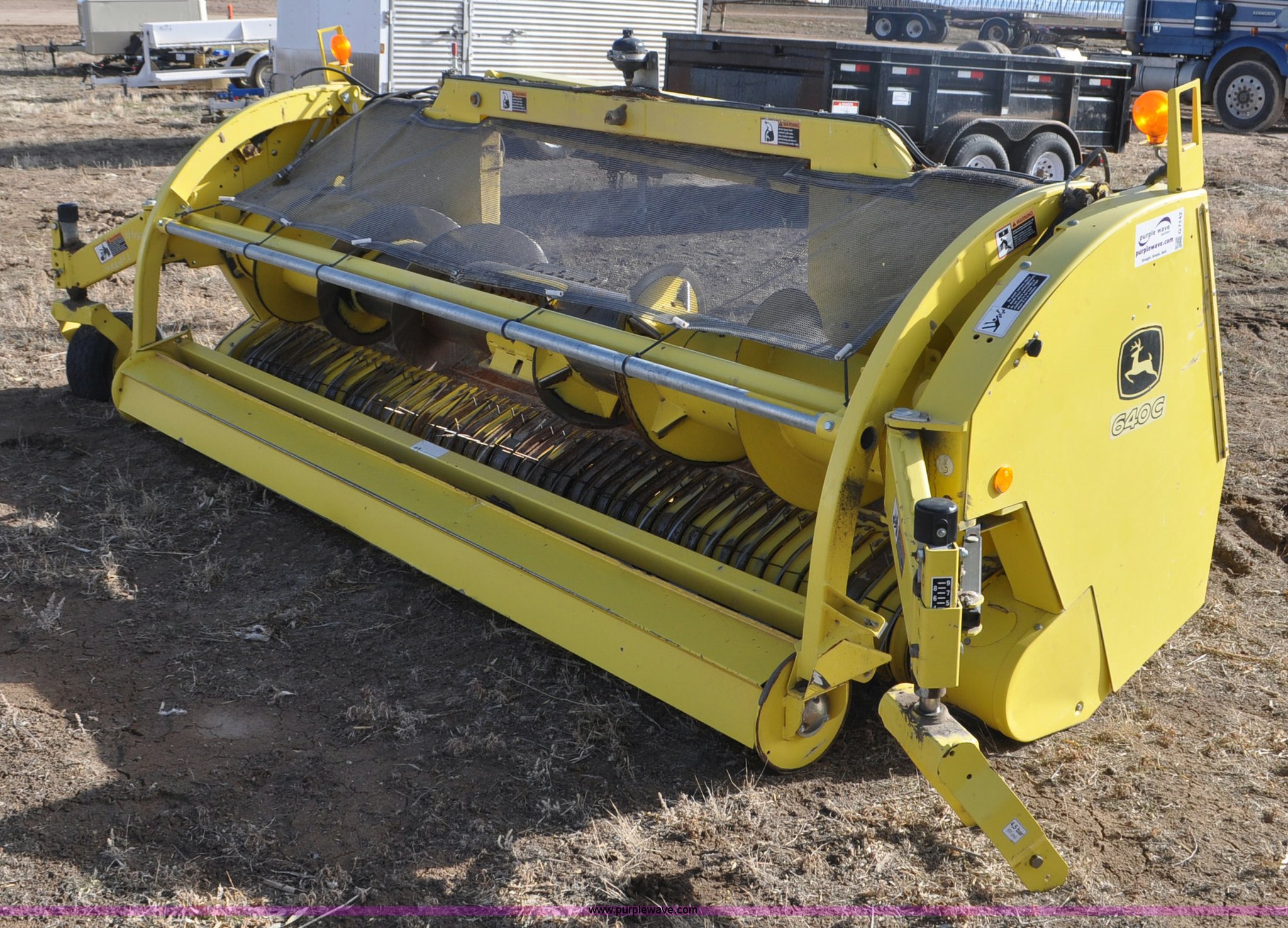 Purple Wave is selling a used Platform or Stripper Head in Utah. This item is a John Deere 640C pickup head with the following: 12'W, Single drive line, Crop roller, Gauge wheels, One missing, Serial 1KM640CGKAA114416