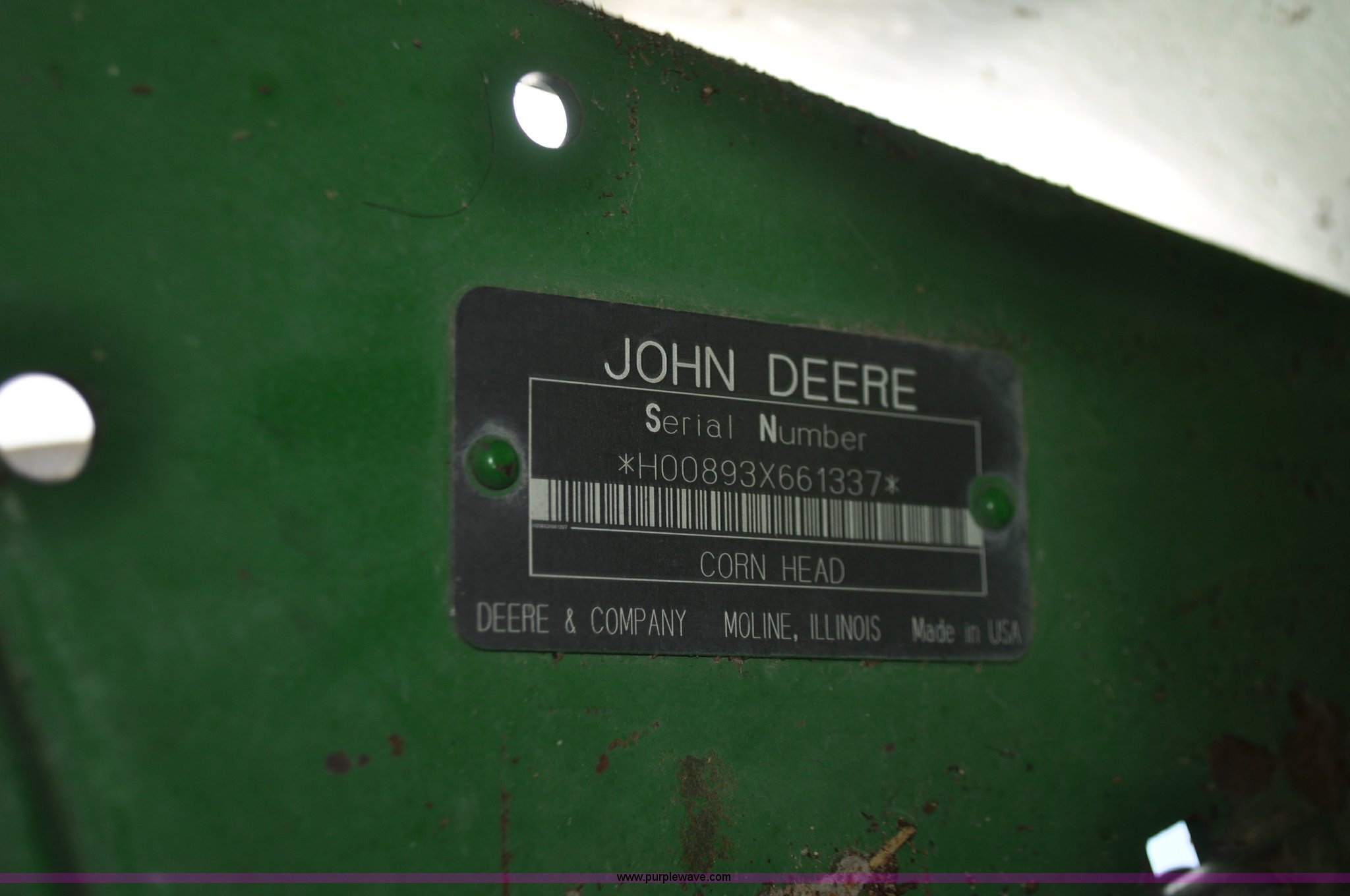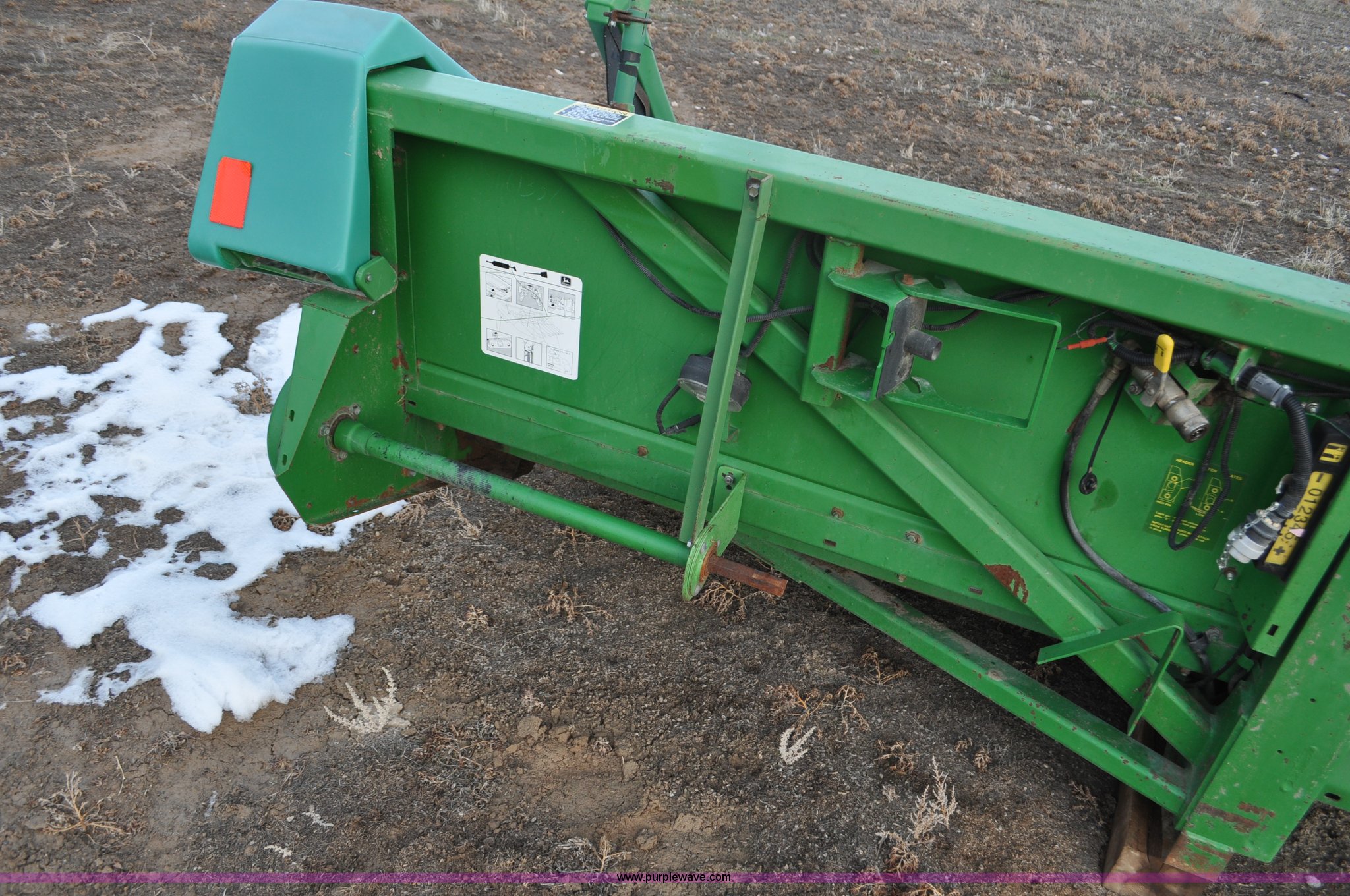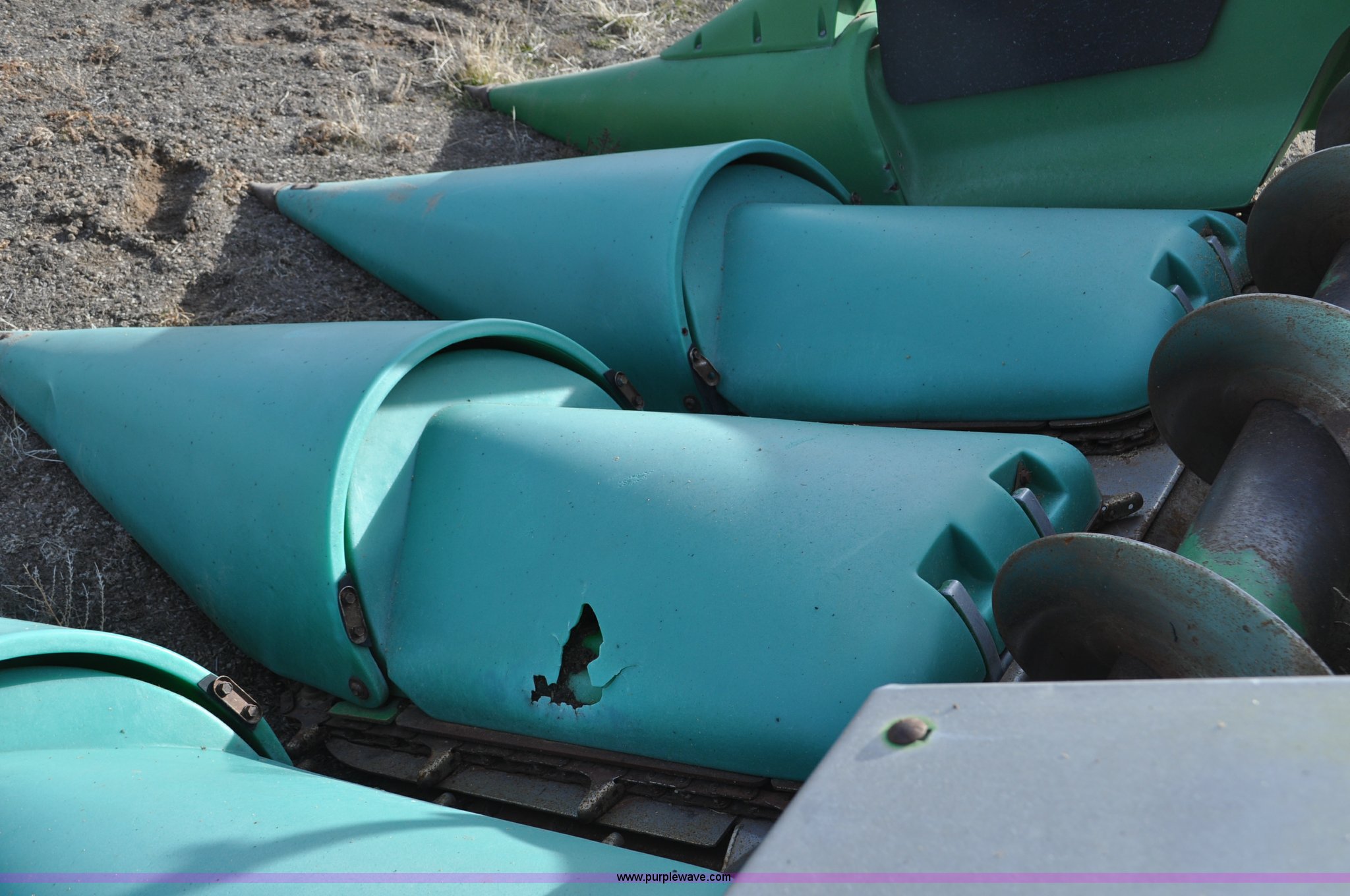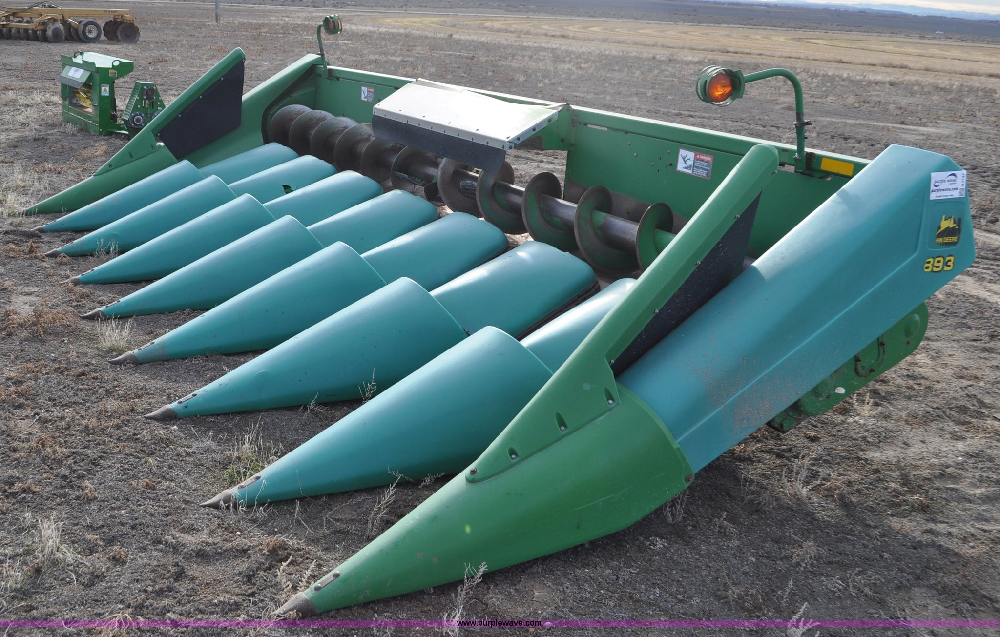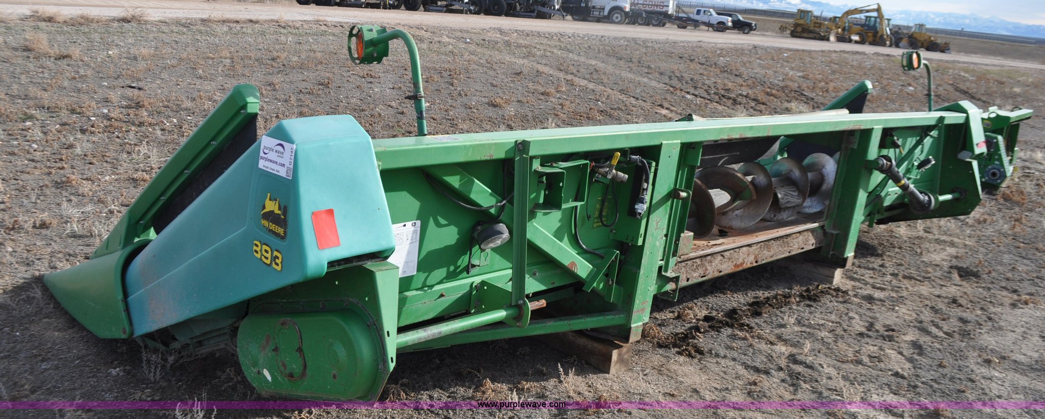 Purple Wave is selling a used Corn or Row Head in Utah. This item is a 1995 John Deere 893 corn head with the following: Eight rows, 30" row spacing, Dual drivelines, Hydraulic deck plates, Poly snouts, Snout damage, Hole in center floor pan, Serial H00893X661337