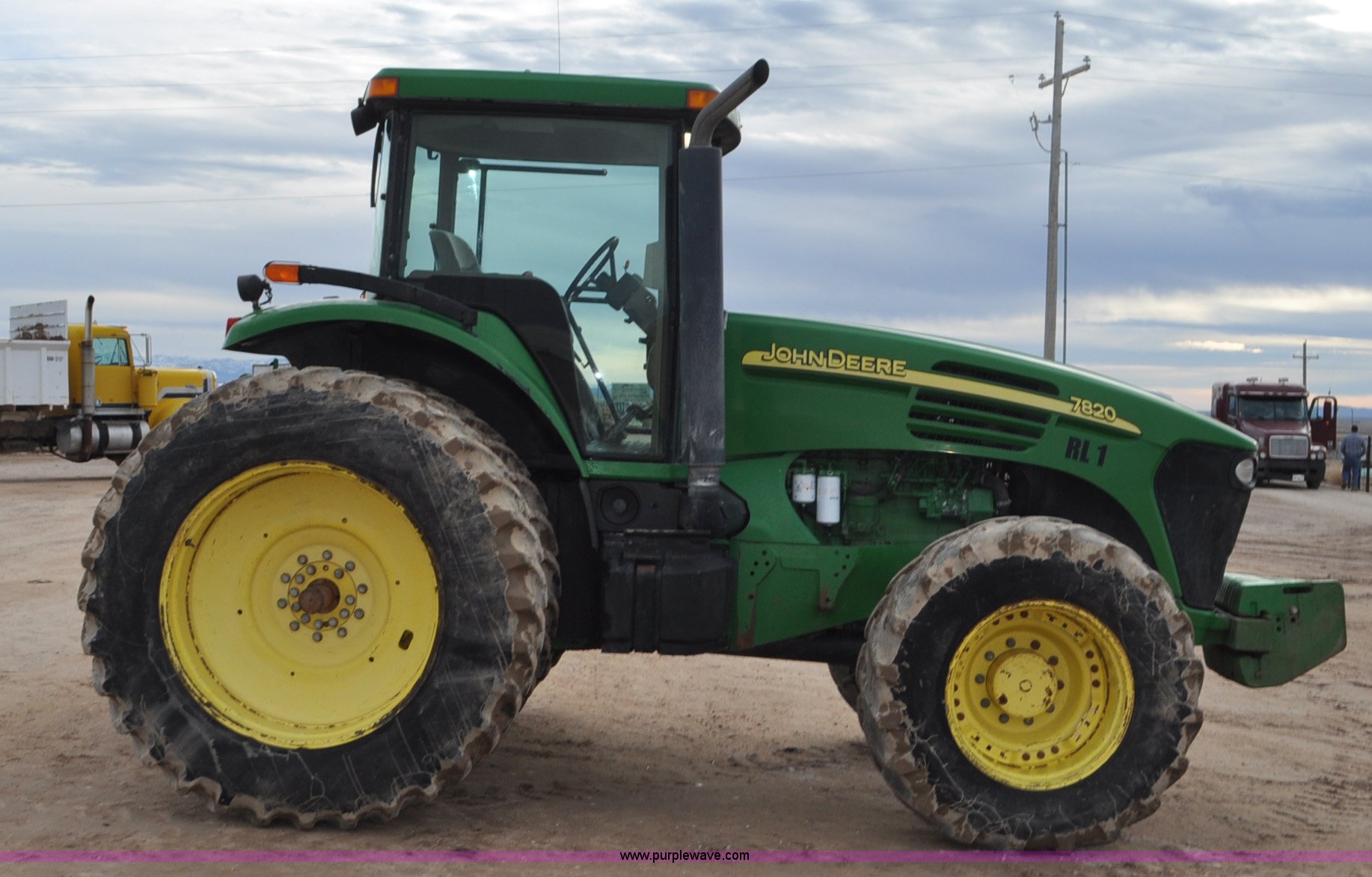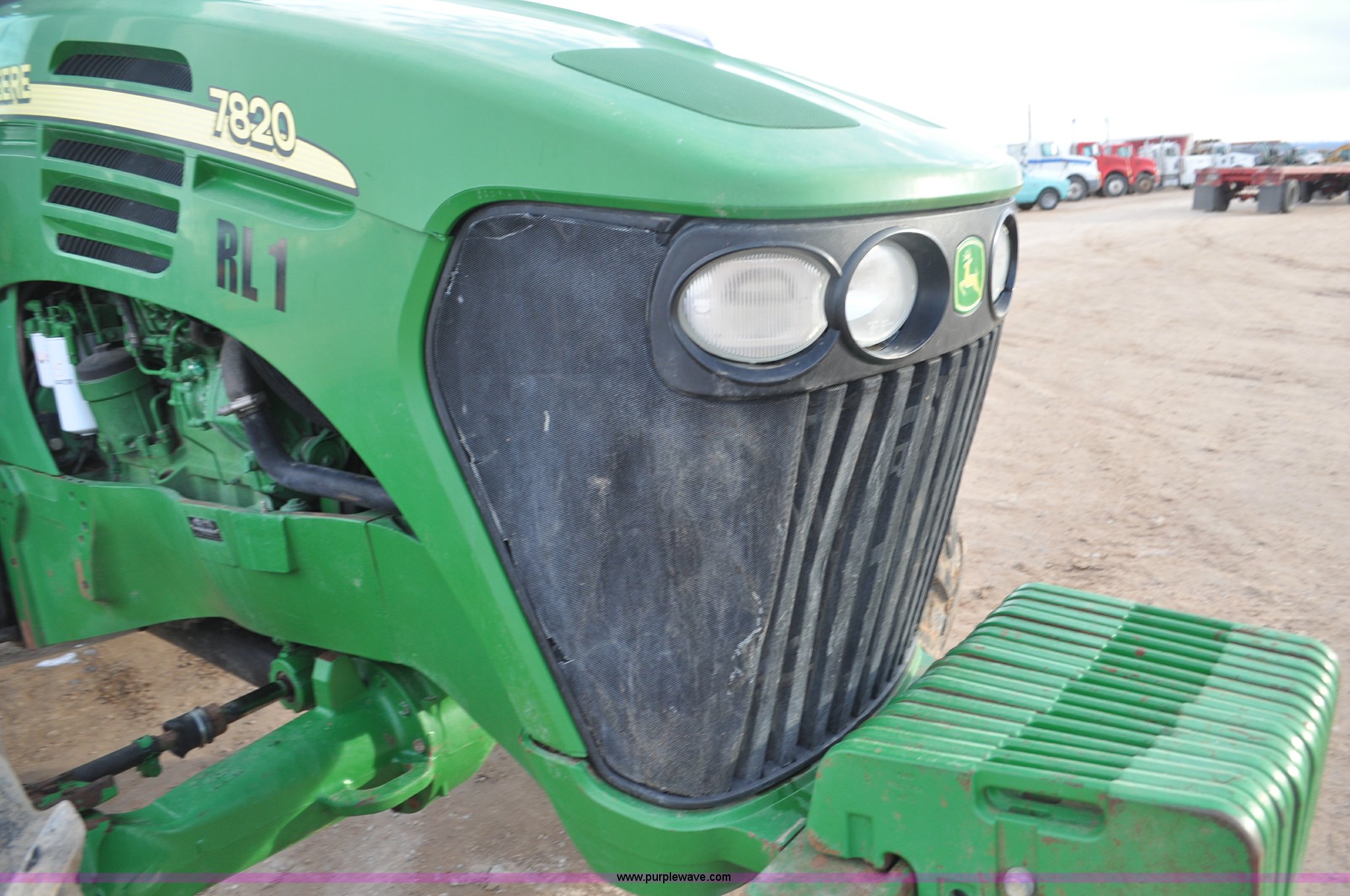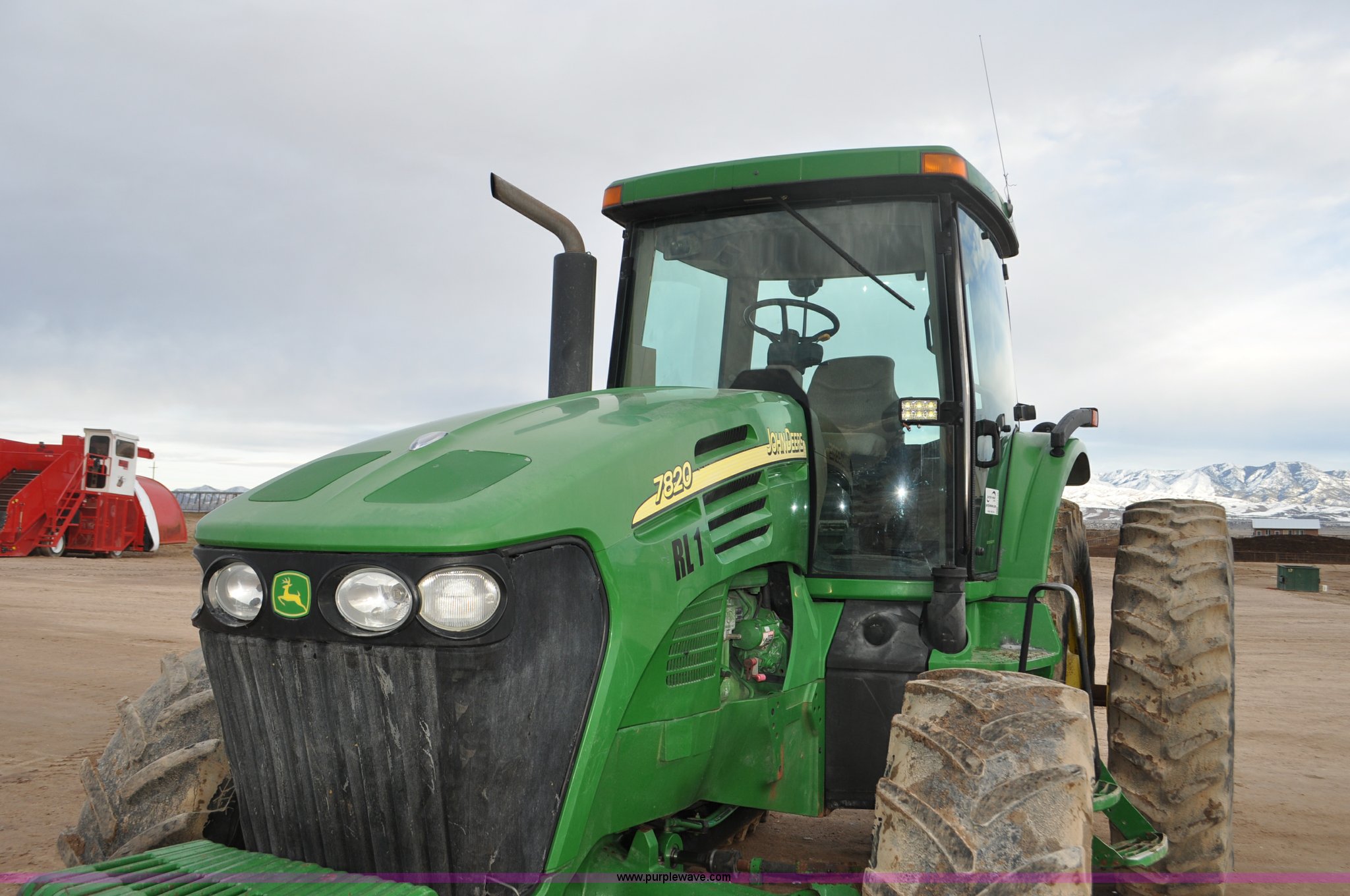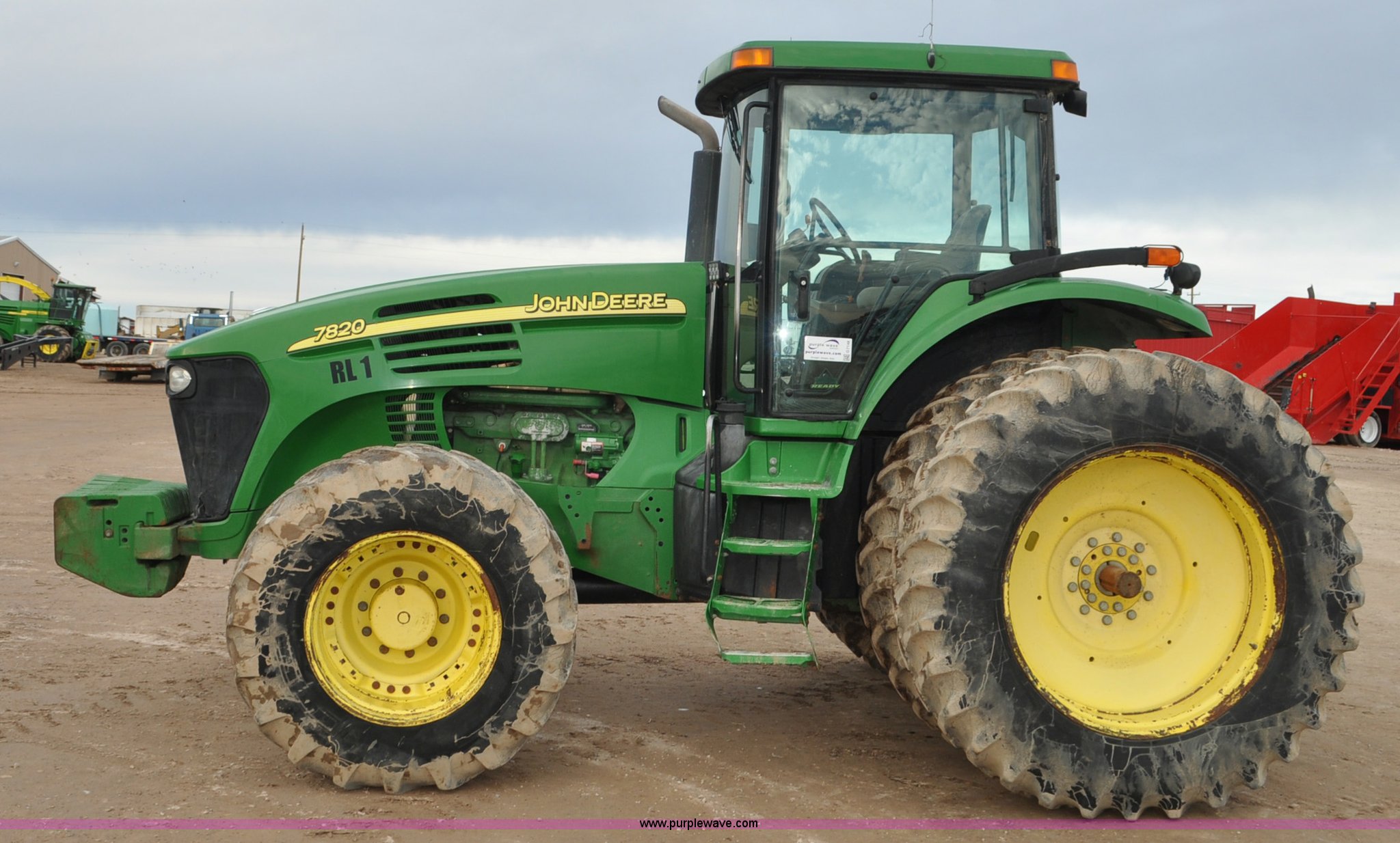 Purple Wave is selling a used Tractor in Utah. This item is a 2005 John Deere 7820 MFWD tractor with the following: 16,828 hours on meter, John Deere 6081H 6.8L six cylinder turbo diesel engine, Quad-Range Plus transmission, 20F-20R gears, Differential lock, AC and heat, Air suspension seat, Tilt steering wheel, Three point, Top link, 1000 PTO, Seven pin outlet, (3) rear hydraulic remote sets, (16) suitcase weights, Wheel weights, 16.9R28 front tires, 480/80R42 dual rear tires, PTO shaft missing, Interior/exterior cosmetic damage, Serial RW7820R033150