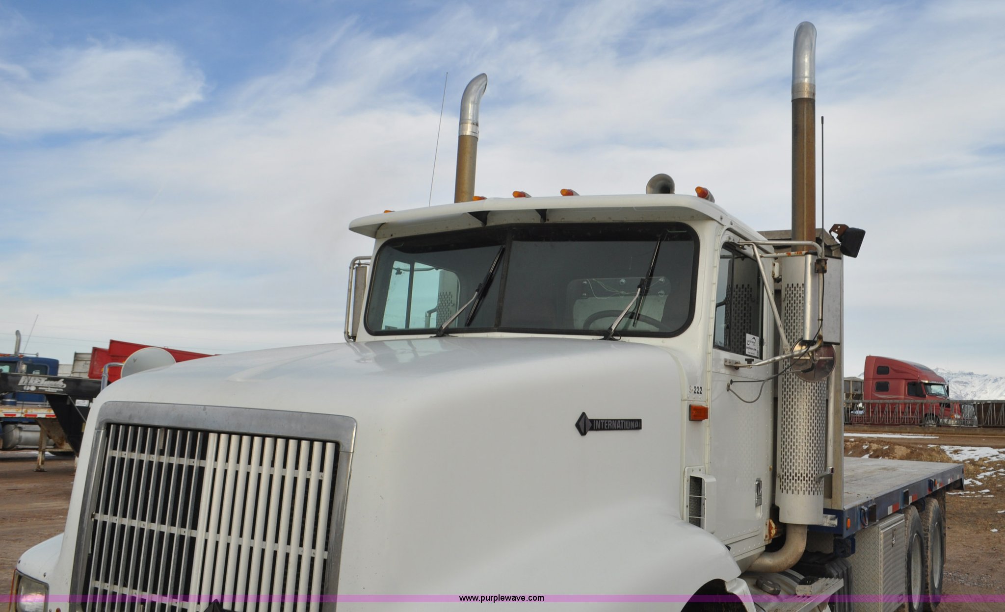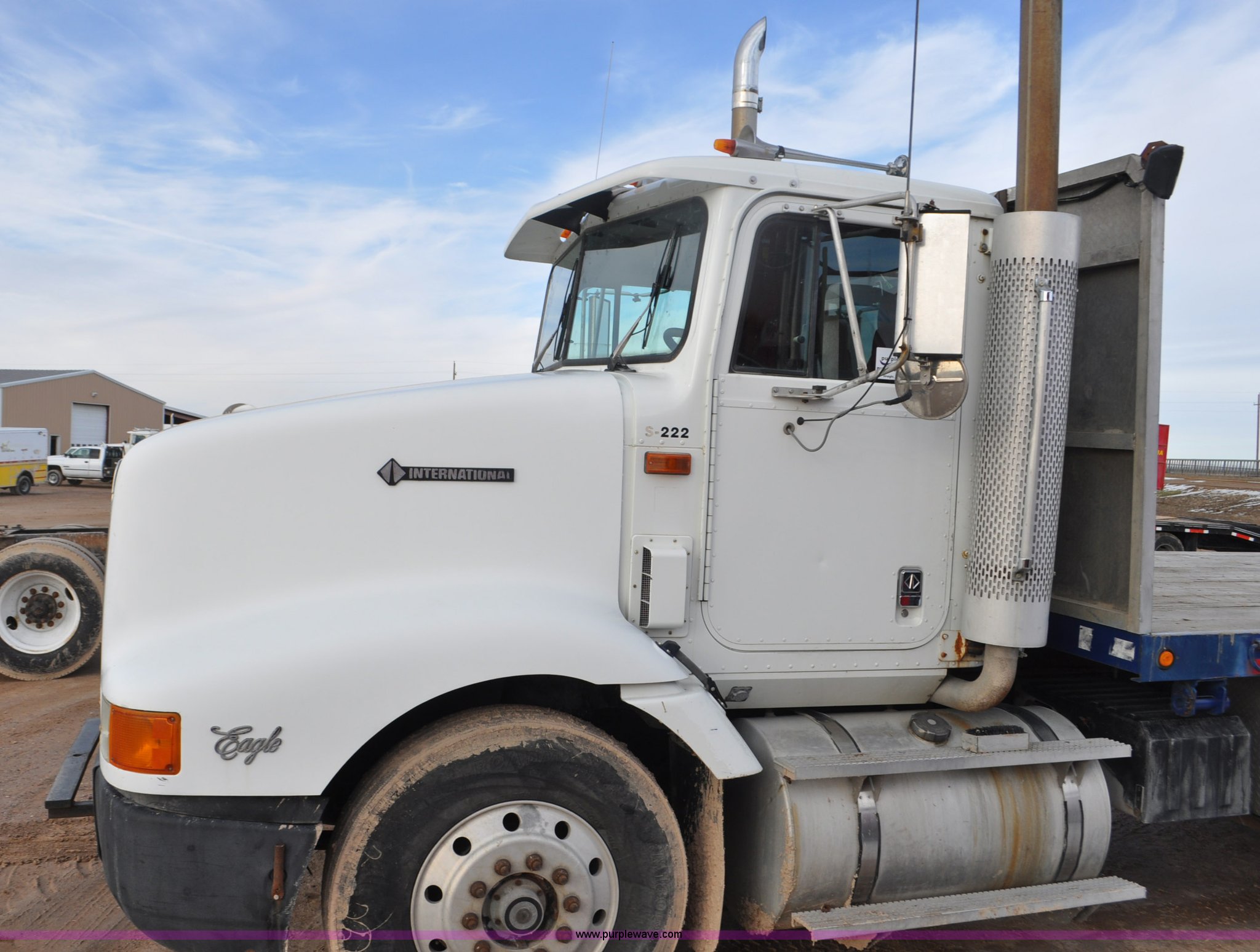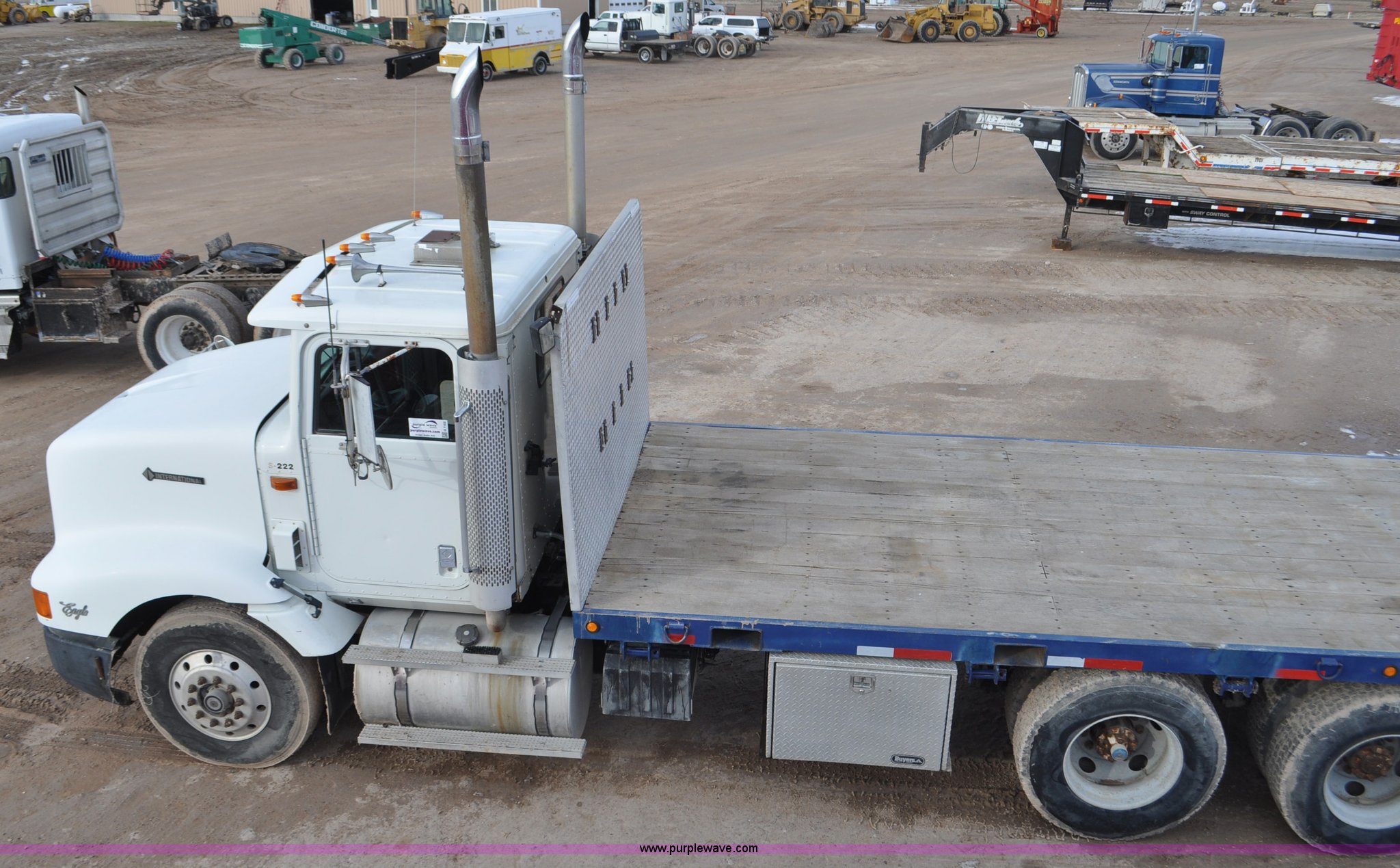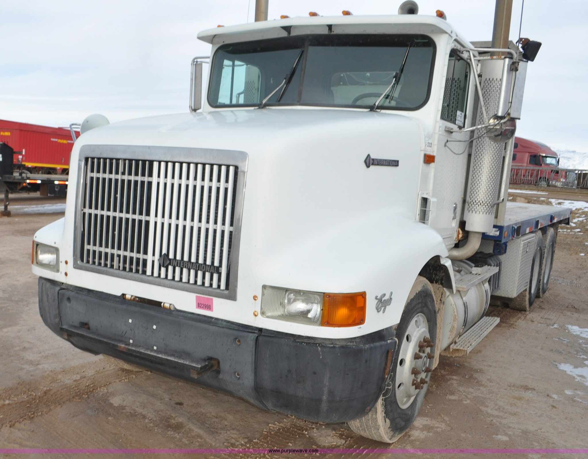 Purple Wave is selling a used Flat Bed Truck in Utah. This item is a 1994 International 9200 flatbed truck with the following: 691,196 miles on odometer, Cummins L10 six cylinder turbo diesel engine, Spicer 10 speed manual transmission, Tandem axle, Inter-axle differential lock, Heat, AM/FM, Tilt, Air suspension seat, Dump valves, Exterior visor, Dual rear exhaust stacks, Aluminum headache rack, 22' x 8' flatbed, D-ring and strap tie downs, Under bed aluminum toolbox, Pintle hitch, Trailer hookups, Air suspension, Air brakes, 215" wheelbase, 11R22.5 tires, GVWR 52,000 lbs, FAWR 12,000 lbs, IAWR 20,000 lbs, RAWR 20,000 lbs, Interior/exterior cosmetic damage