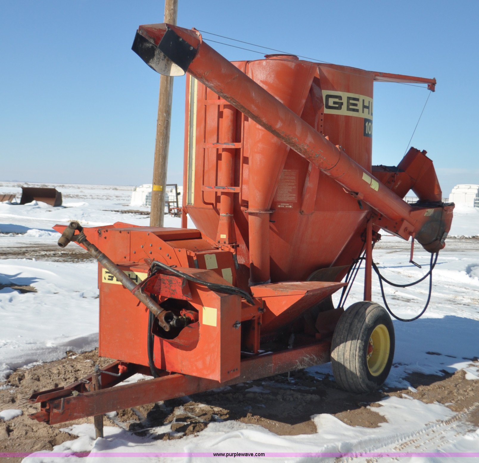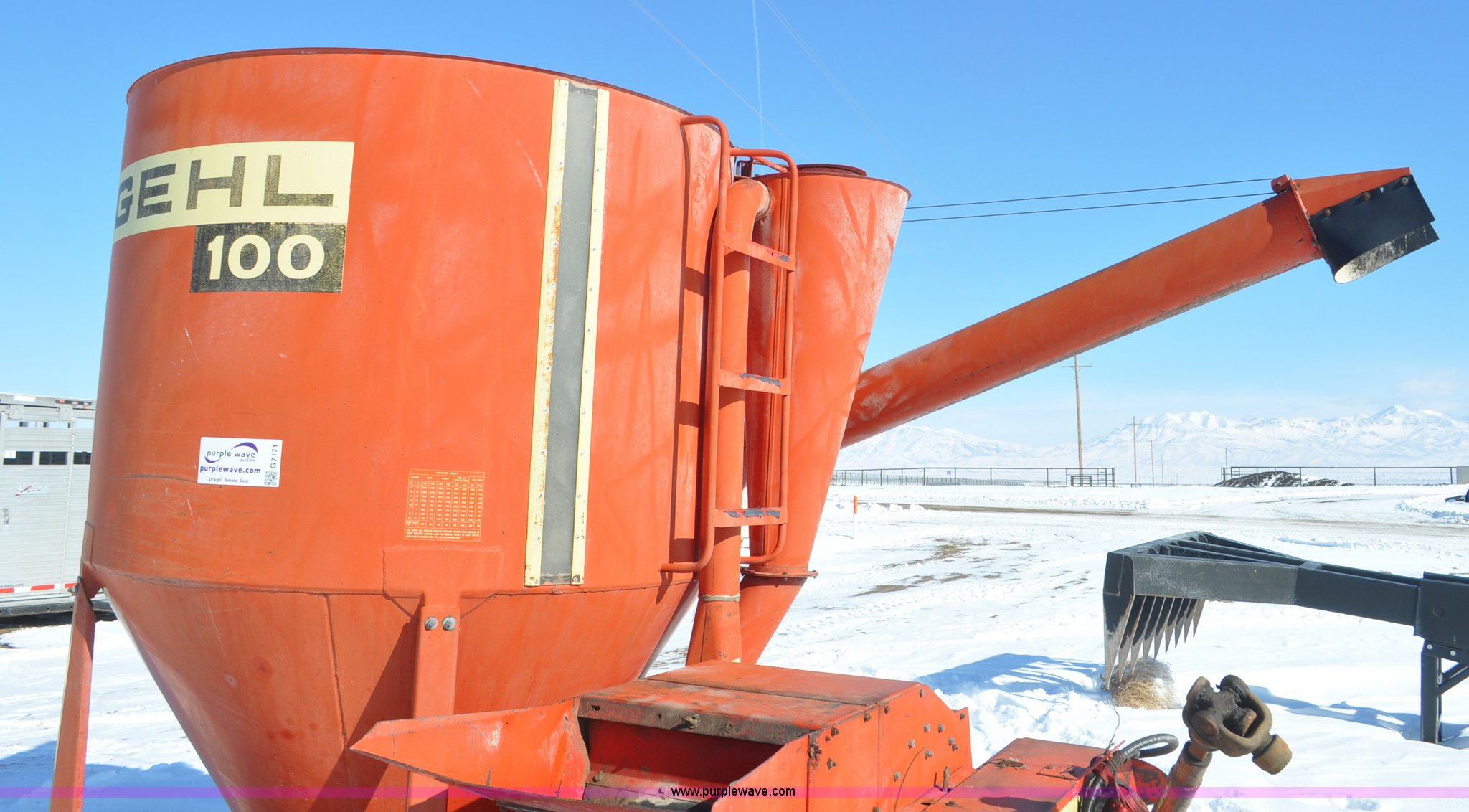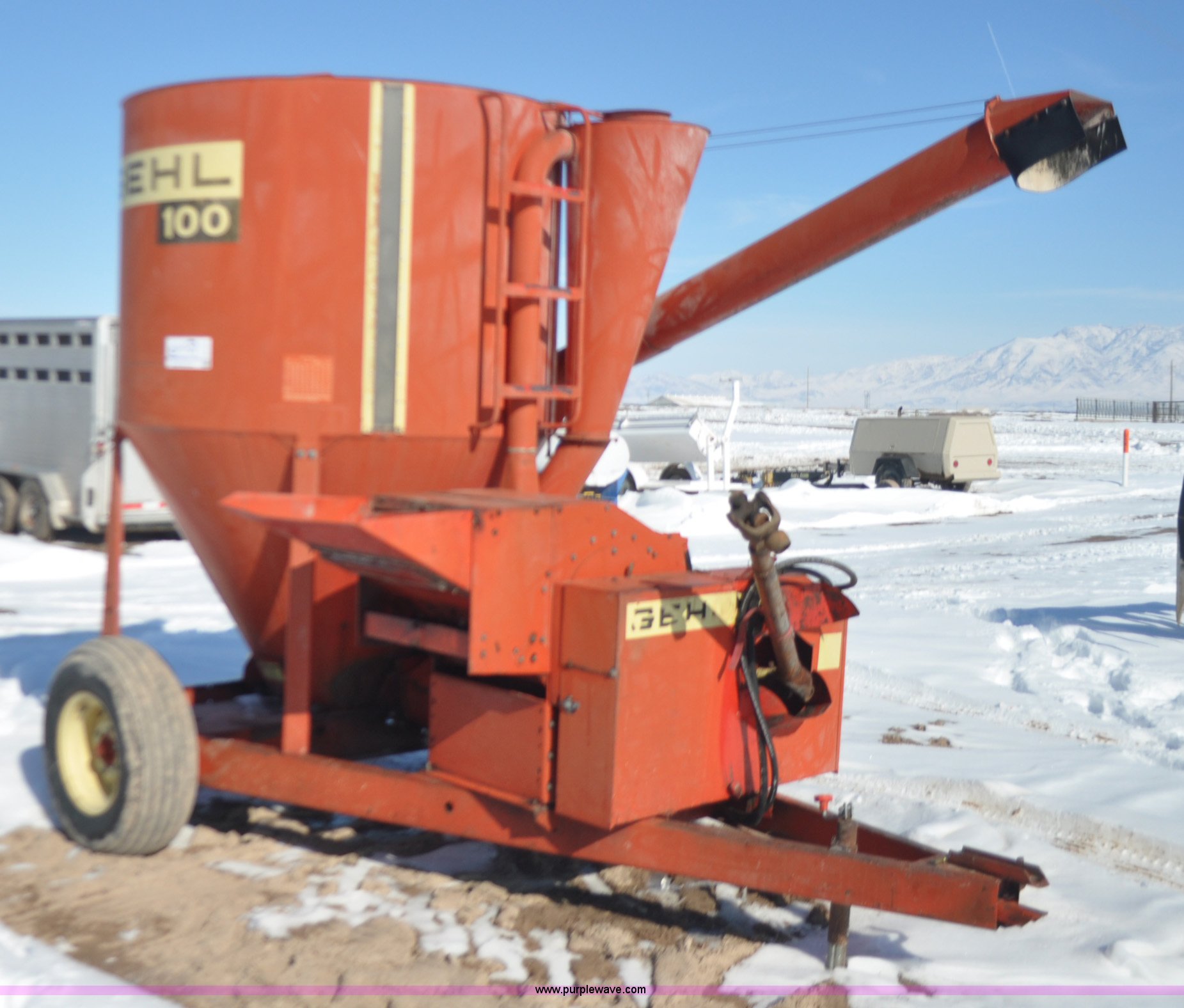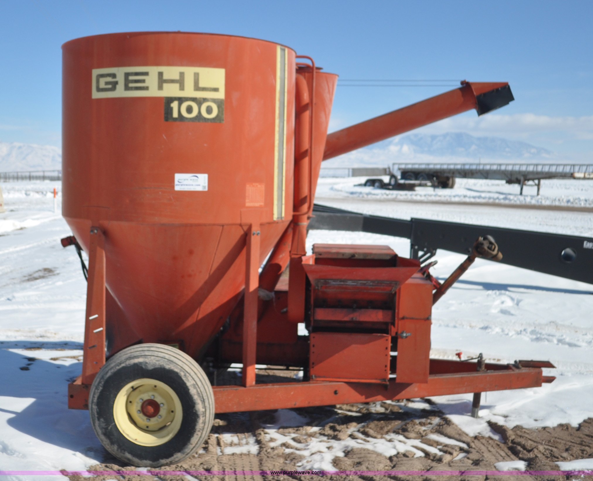 Purple Wave is selling a used Feed Mixer or Bale Processor in Utah. This item is a Gehl 100 grinder mixer with the following: 540 PTO, 20" mill, Pin hitch, 11L-15 tires, Additional screens, Rust, Damage