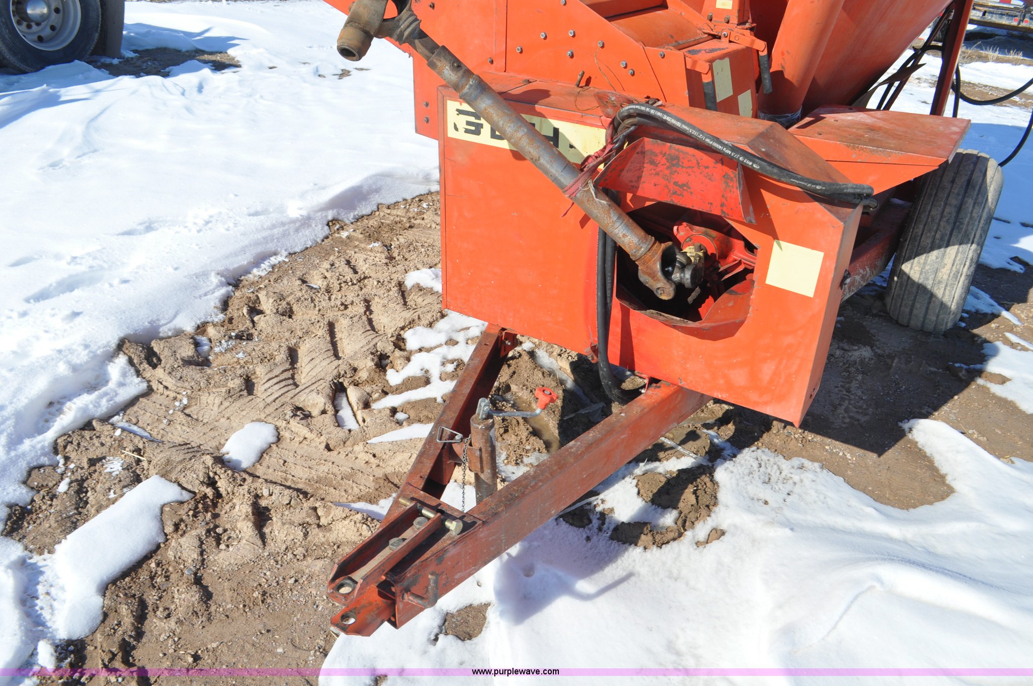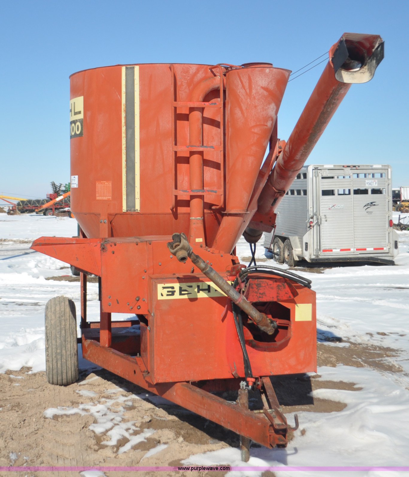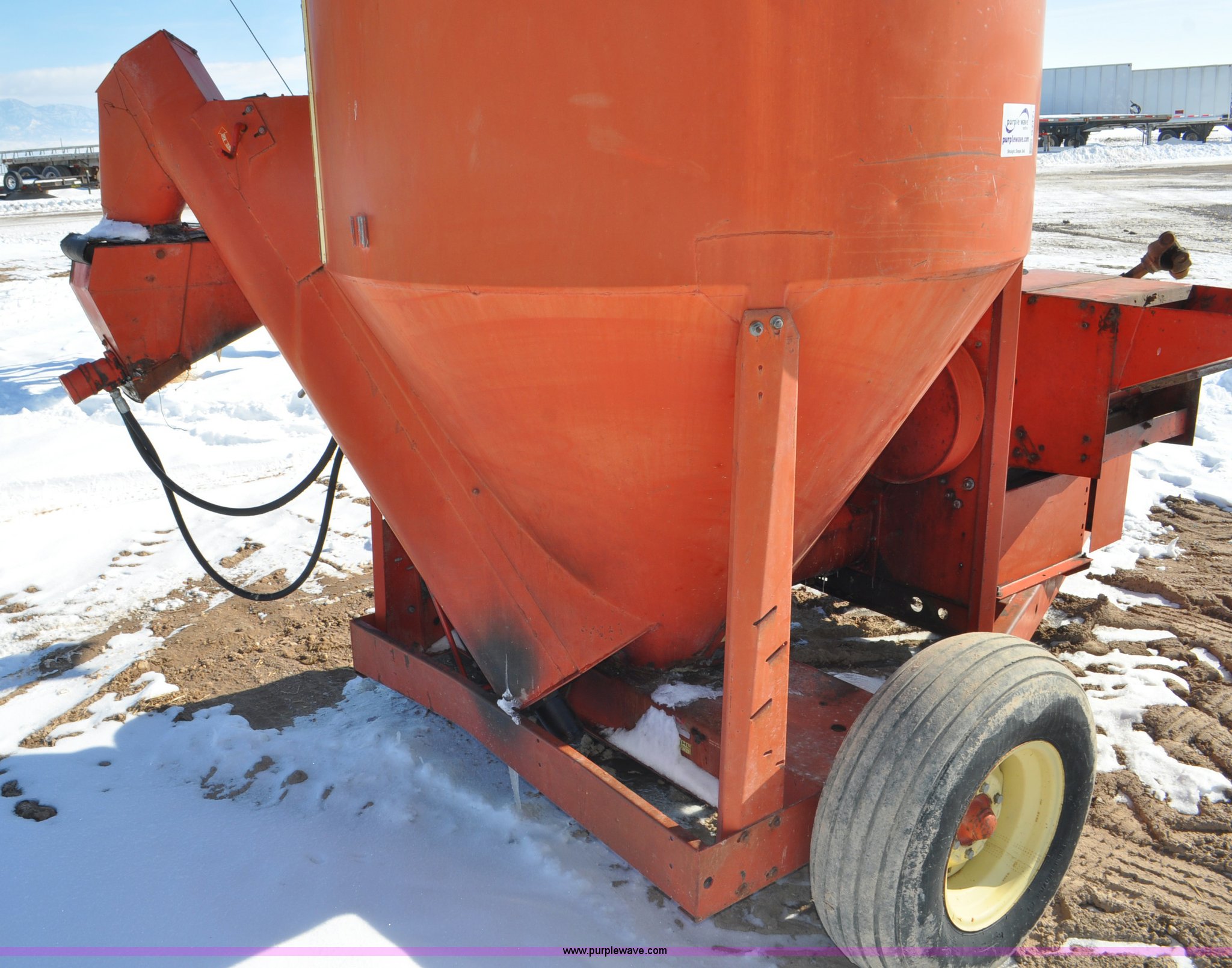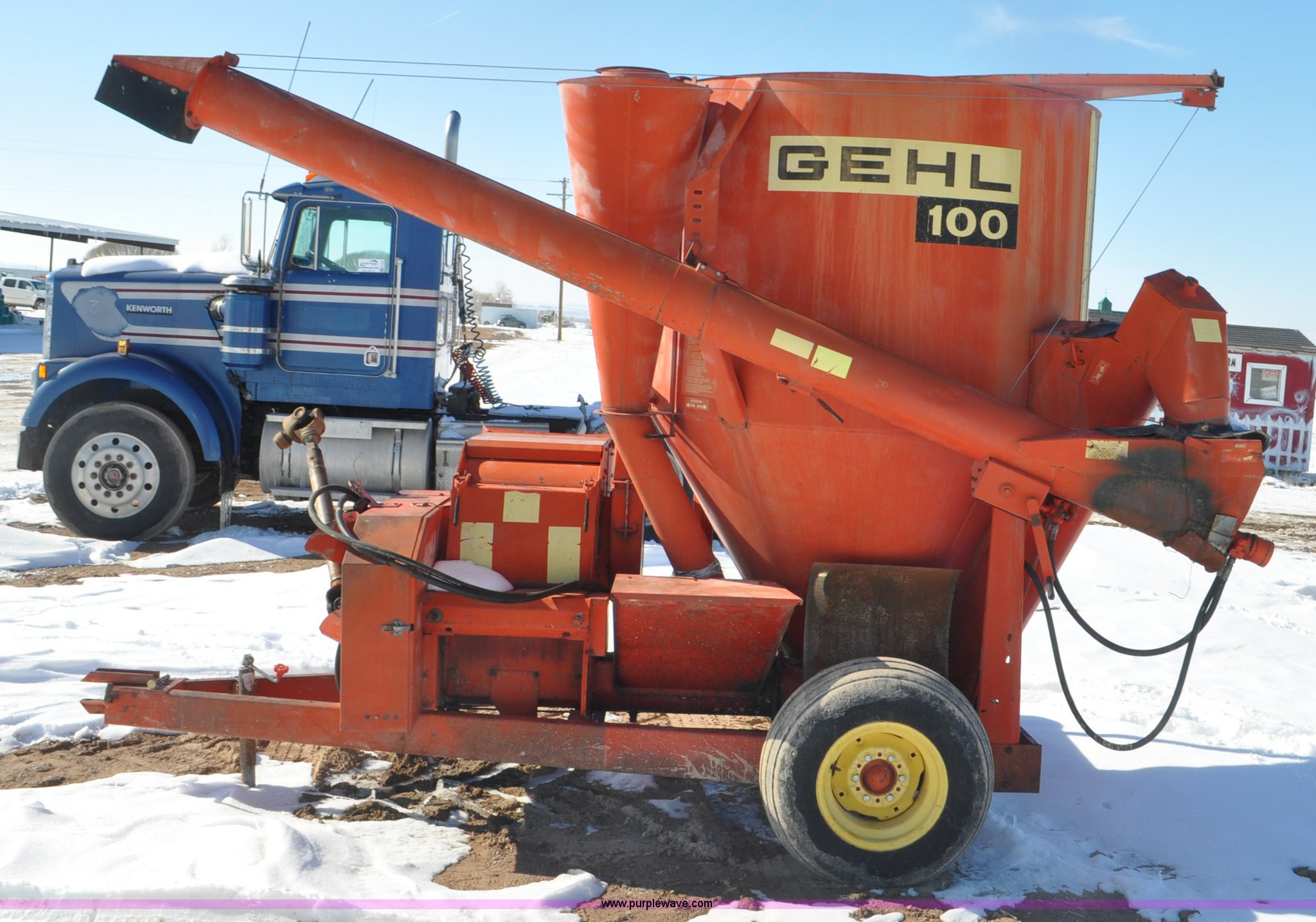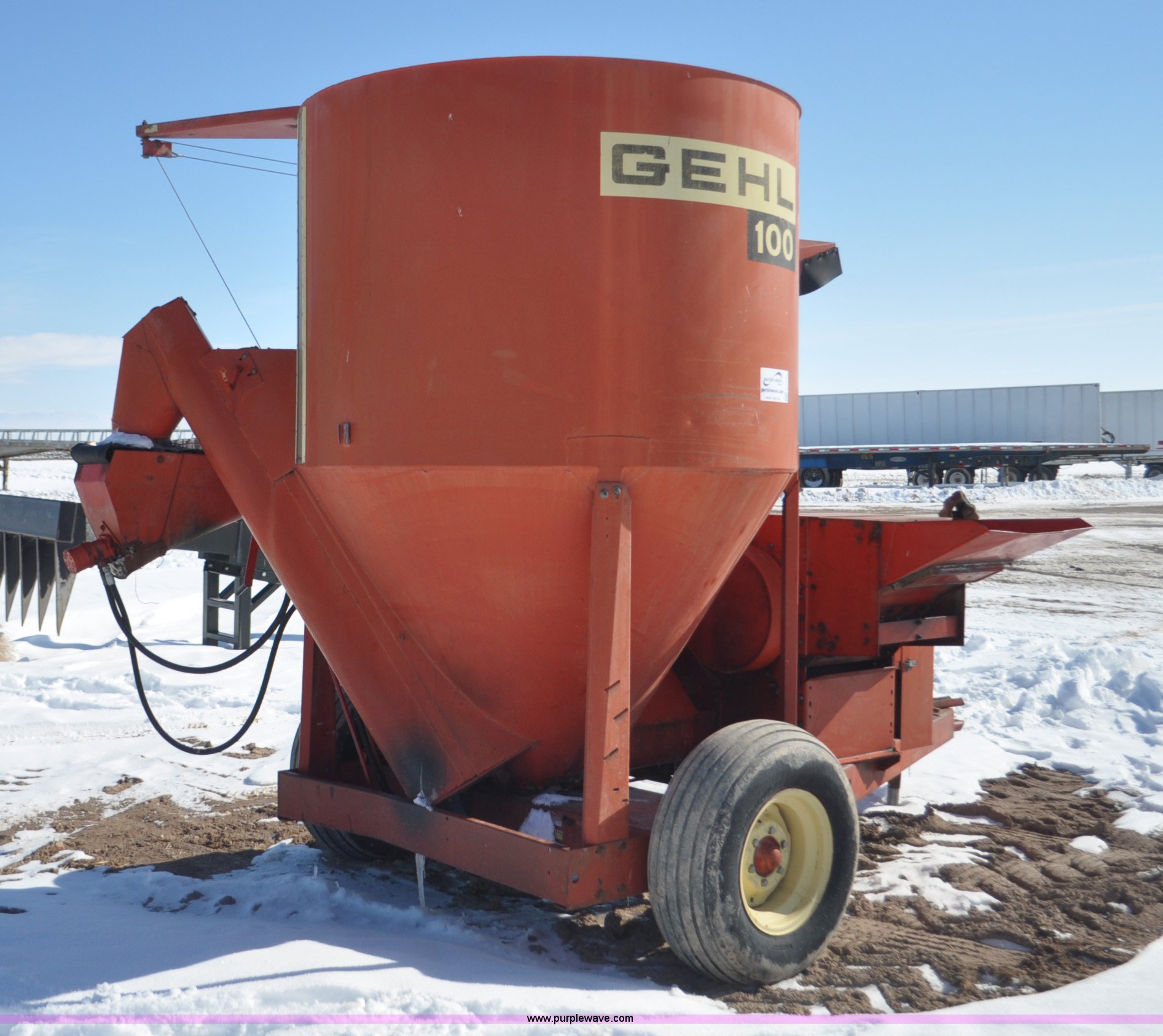 Purple Wave is selling a used Feed Mixer or Bale Processor in Utah. This item is a Gehl 100 grinder mixer with the following: 540 PTO, 20" mill, Pin hitch, 11L-15 tires, Additional screens, Rust, Damage