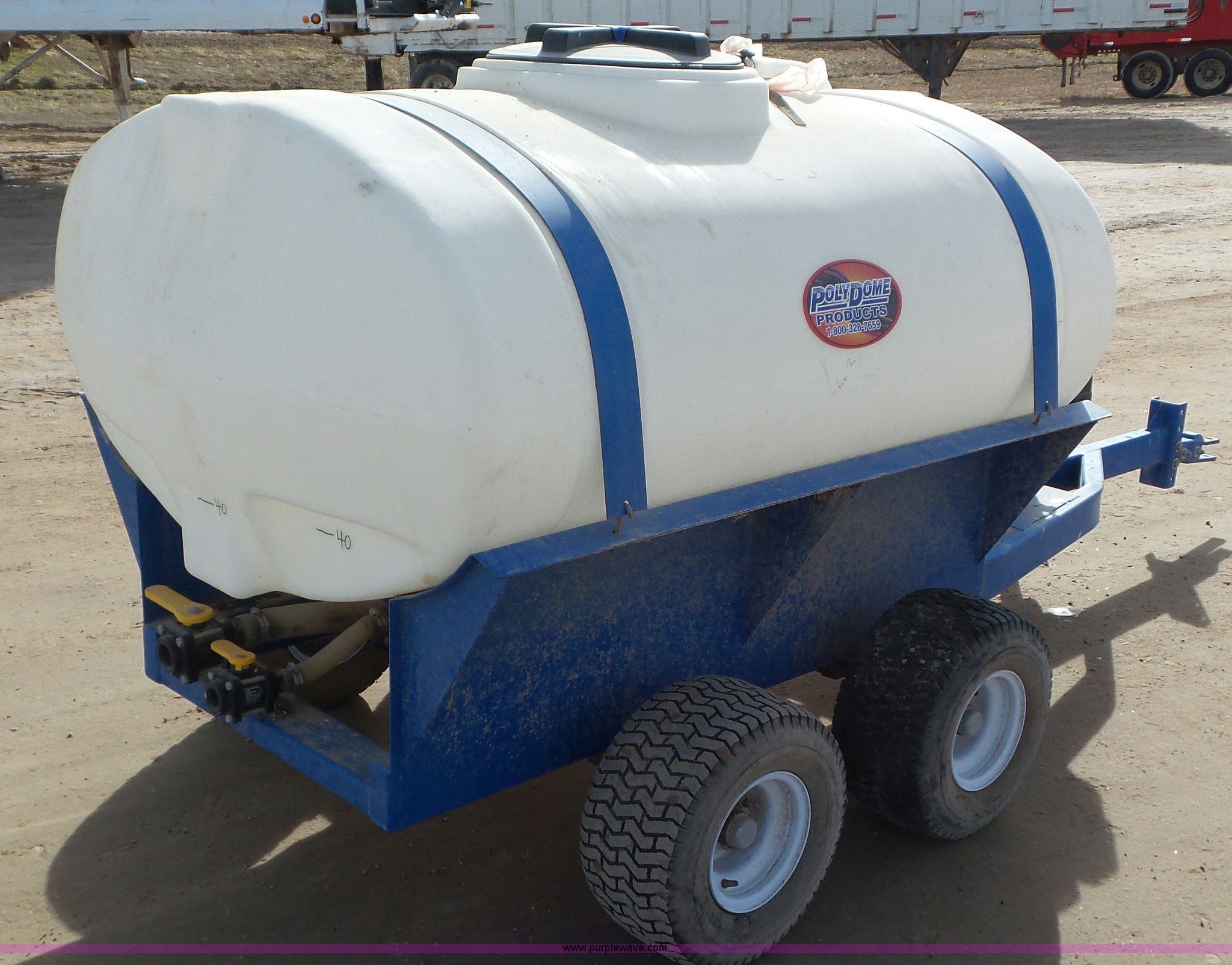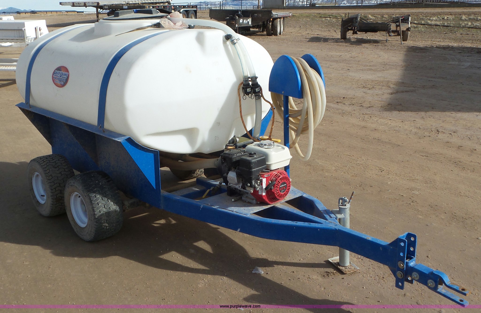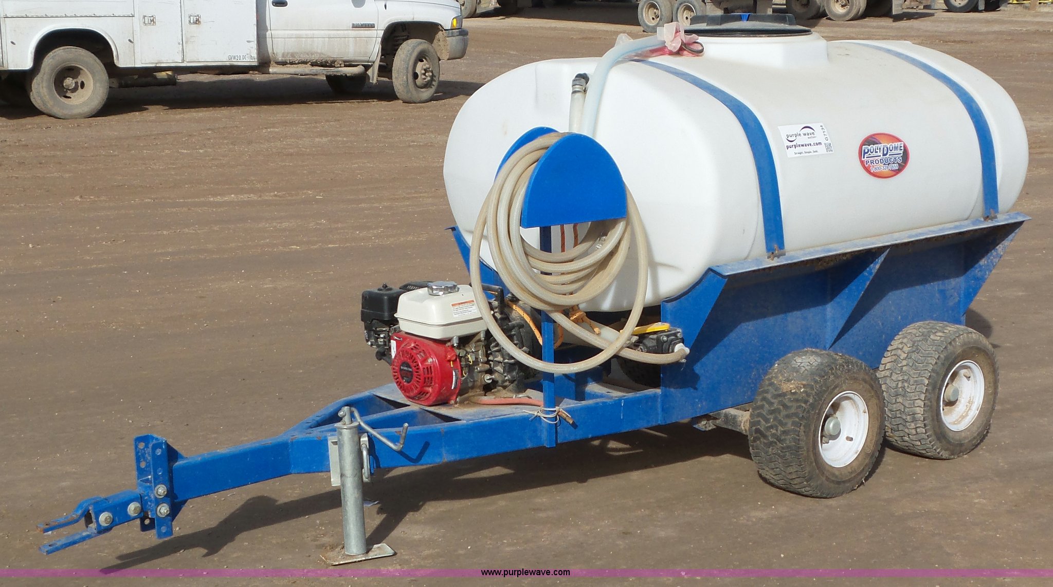 Purple Wave is selling a used Tank Trailer in Utah. This item is a Pump trailer with the following: Honda single cylinder gas engine, Poly tank, 300 gallon capacity, Pump, Hose, Pin hitch, 18x9.50-8 tires