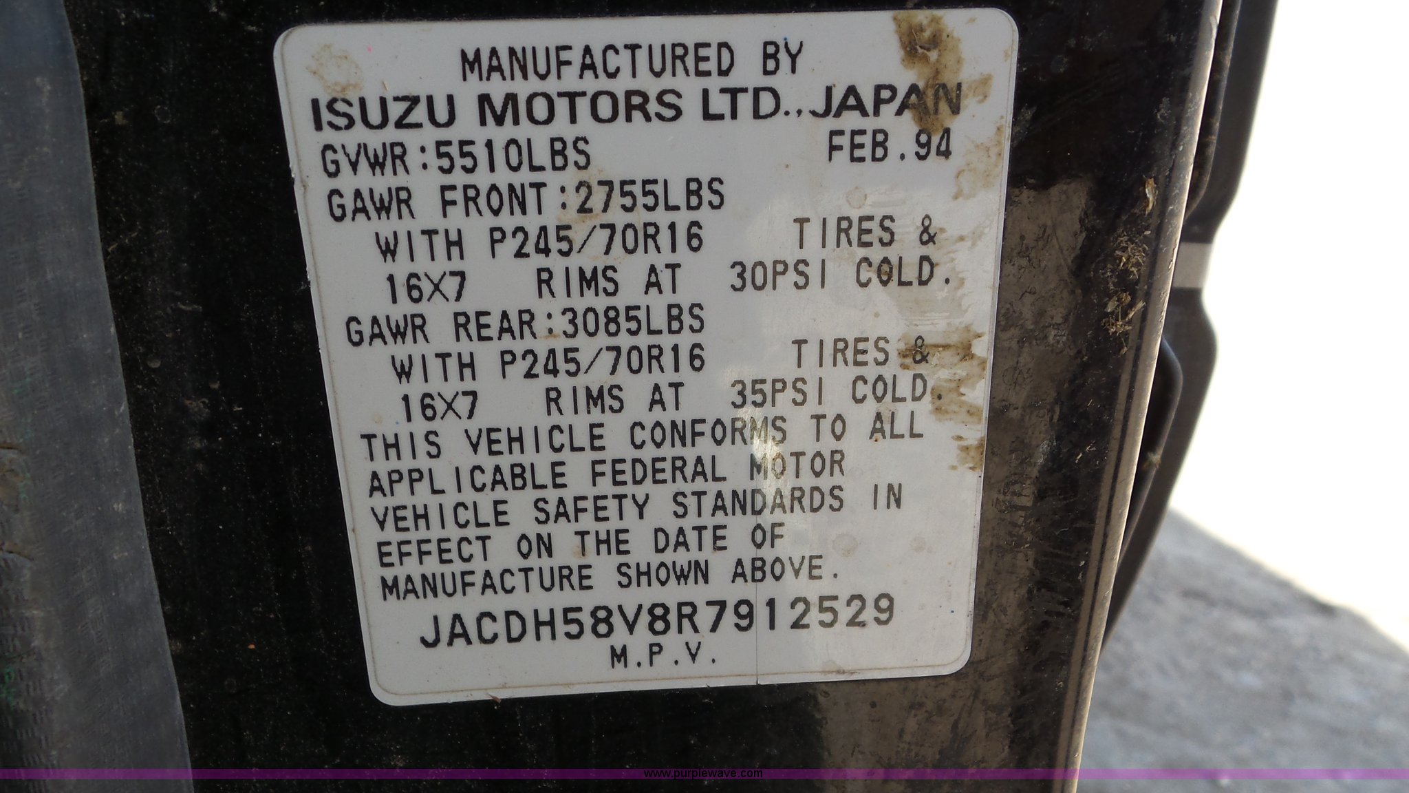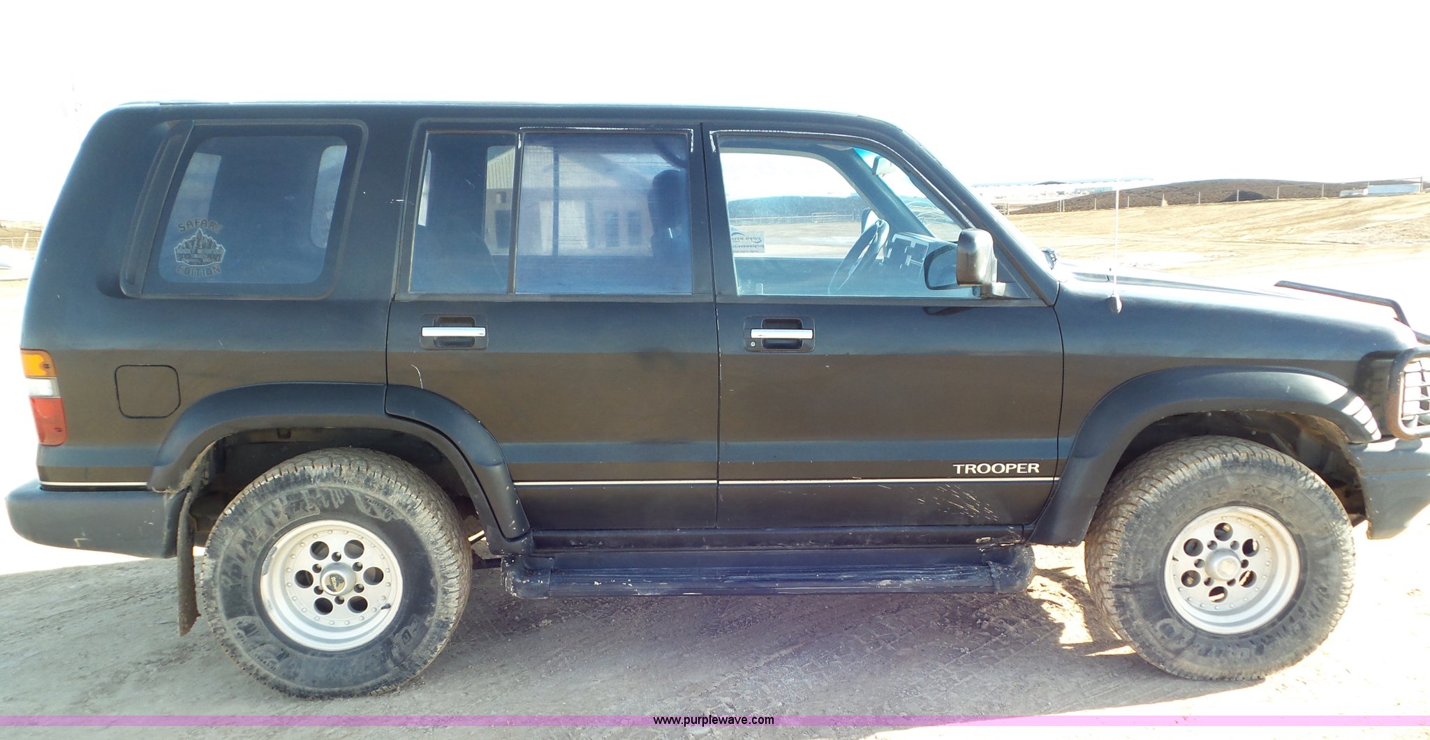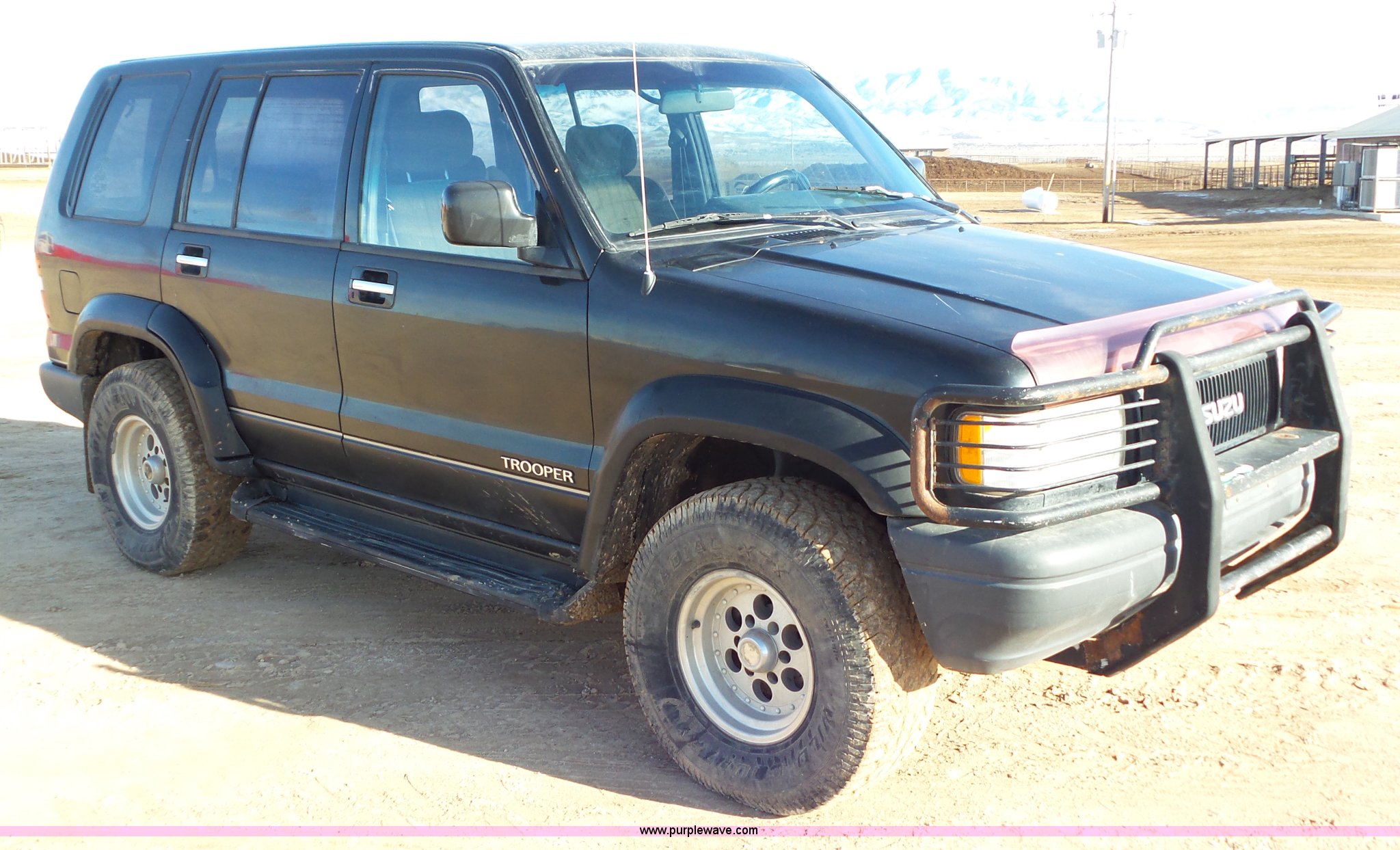 Purple Wave is selling a used Passenger Vehicle in Utah. This item is a 1994 Isuzu Trooper SUV with the following: 148,565 miles on odometer, 3.2L V6 SOHC 24V gas engine, Manual transmission, Four wheel drive, AC and heat, Cruise, AM/FM/CD, Power windows, locks, and mirrors, Cloth interior, Running boards, Receiver hitch, 32 x 11.50R15 tires, Interior/exterior cosmetic damage