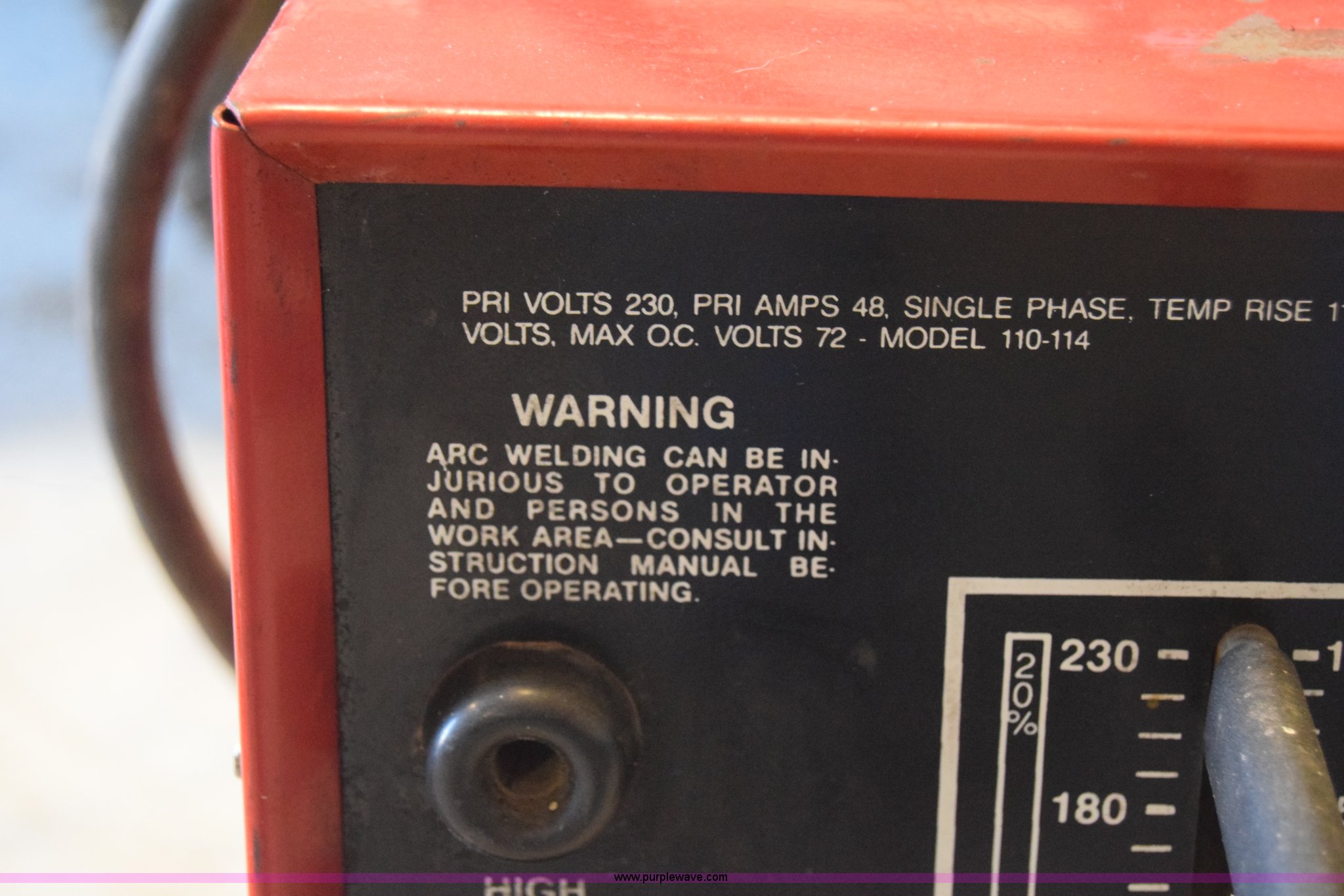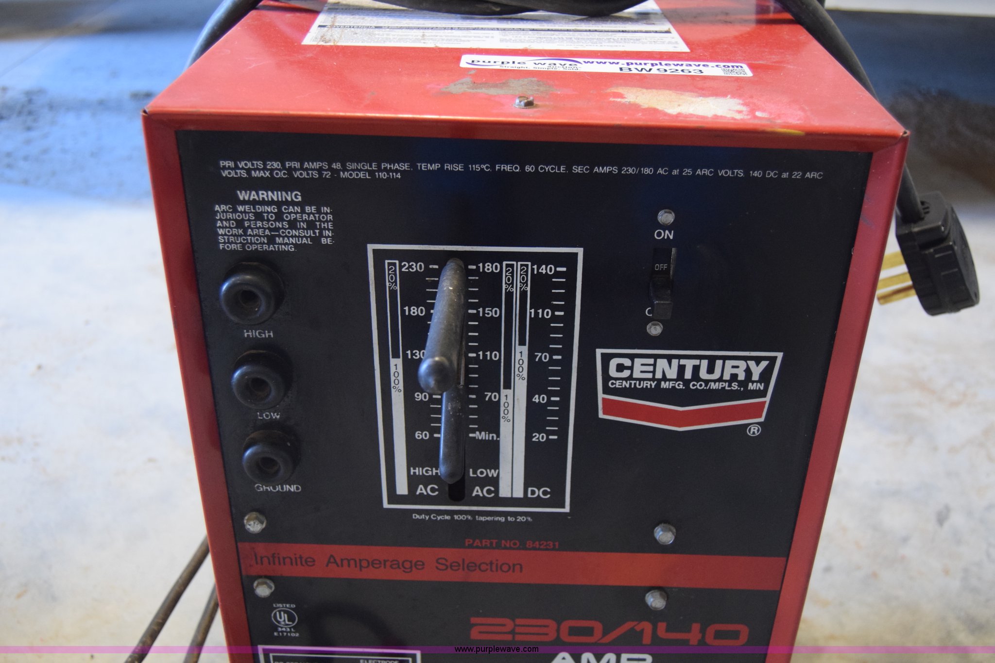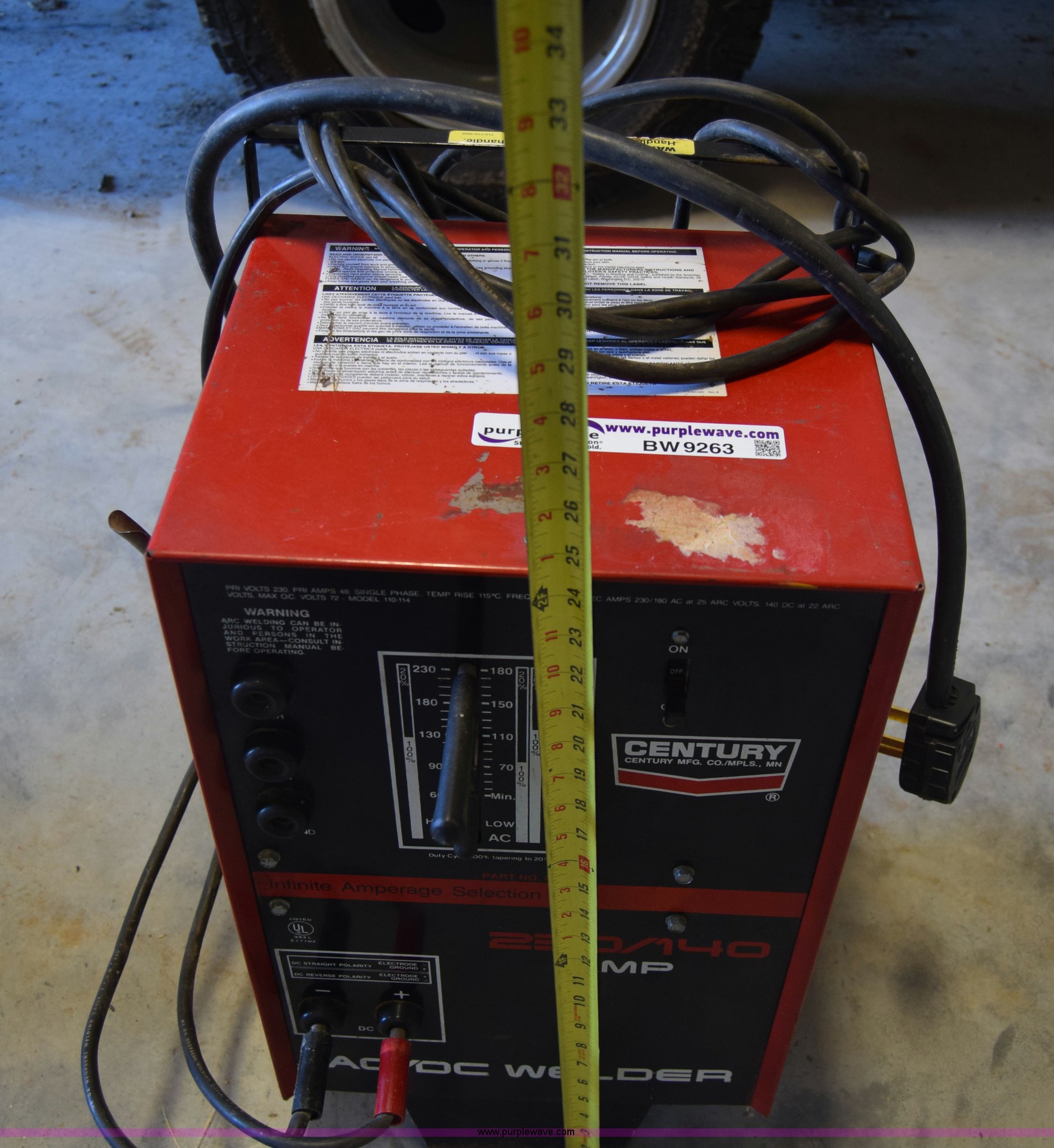 Purple Wave is selling a used Welder (Manual) in Kansas. This item is a Century 110-14 AC/DC welder with the following: 14" x 12" x 24"H, 220V AC, Single phase, Leads