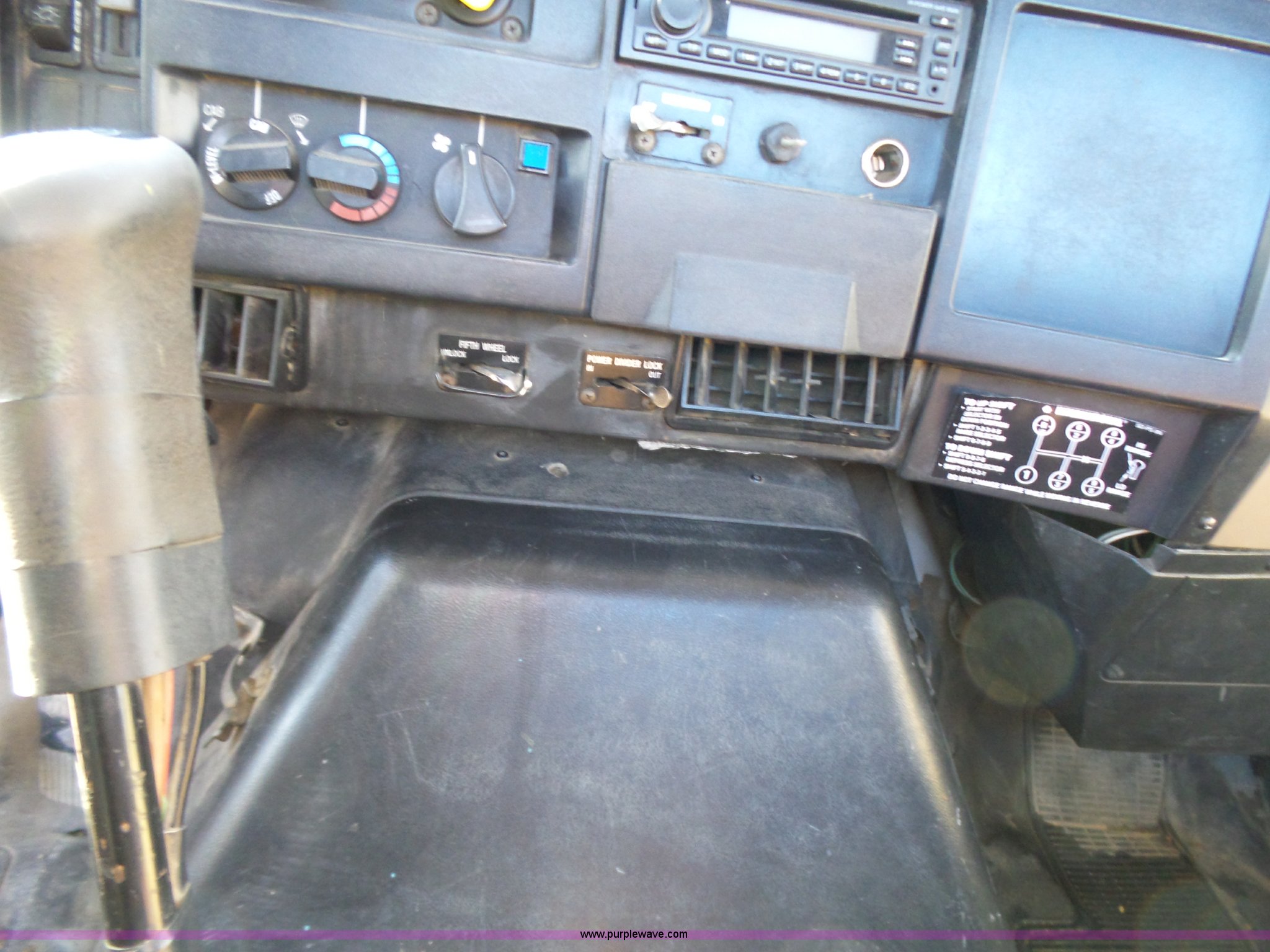 Purple Wave is selling a used Truck Tractor in Kansas. This item is a 1994 International 8300 semi truck with the following: 164,424 miles on odometer, Cummins L10 10.0L L6 turbo diesel engine, Serial 34704541, International nine speed manual transmission, Tandem axle, AC and heat, Non-operational heat, AM/FM/CD, Air suspension seat, Single exhaust stack, Aluminum deck plate, Air operated fifth wheel plate, Half fenders, Air suspension, Air brakes, 154" wheelbase, 11R22.5 front tires, 295/75R22.5 rear tires, GVWR 52,000 lbs, FAWR 12,000 lbs, IAWR 20,000 lbs, RAWR 20,000 lbs, Fuel gauge inoperable