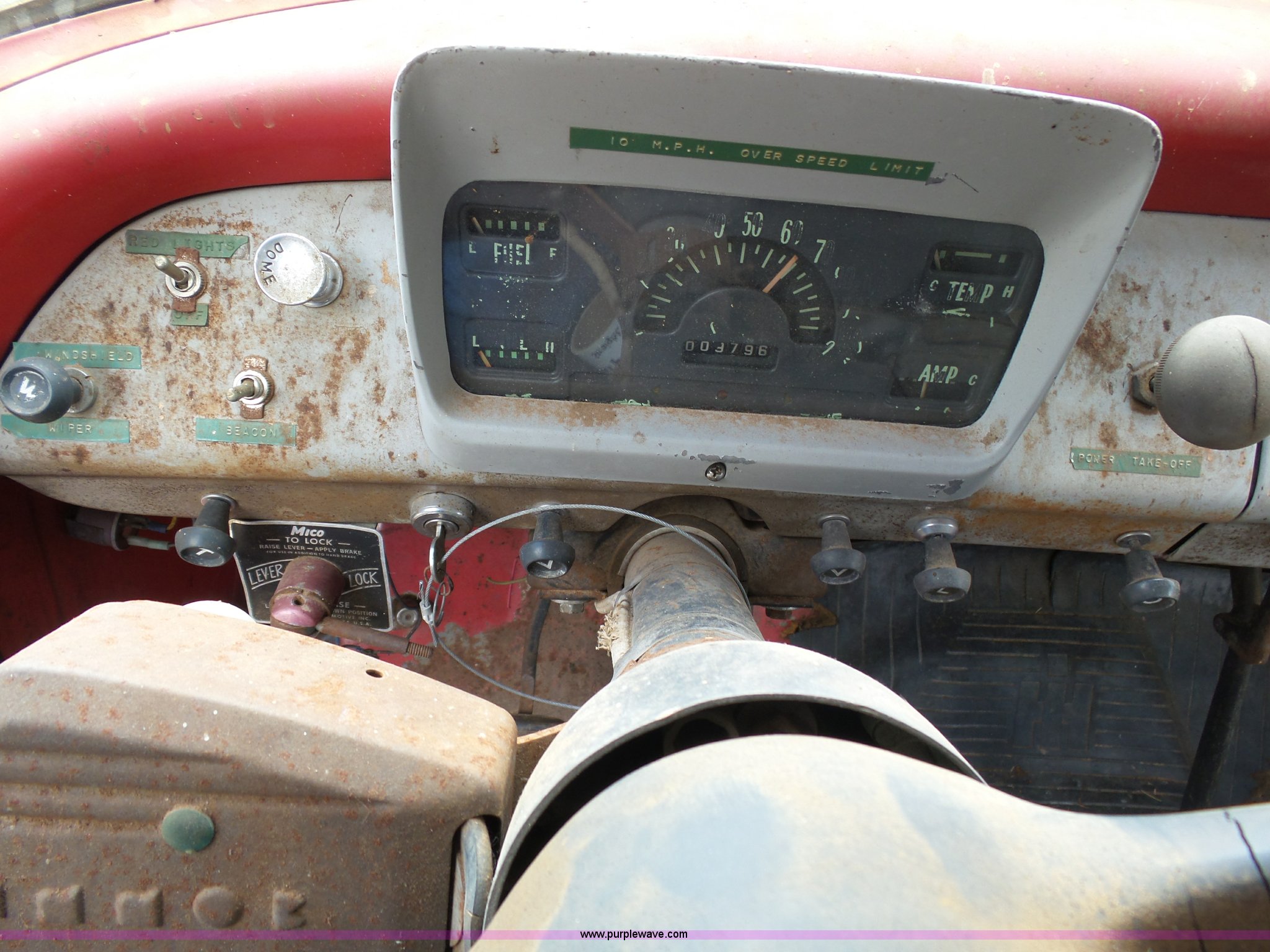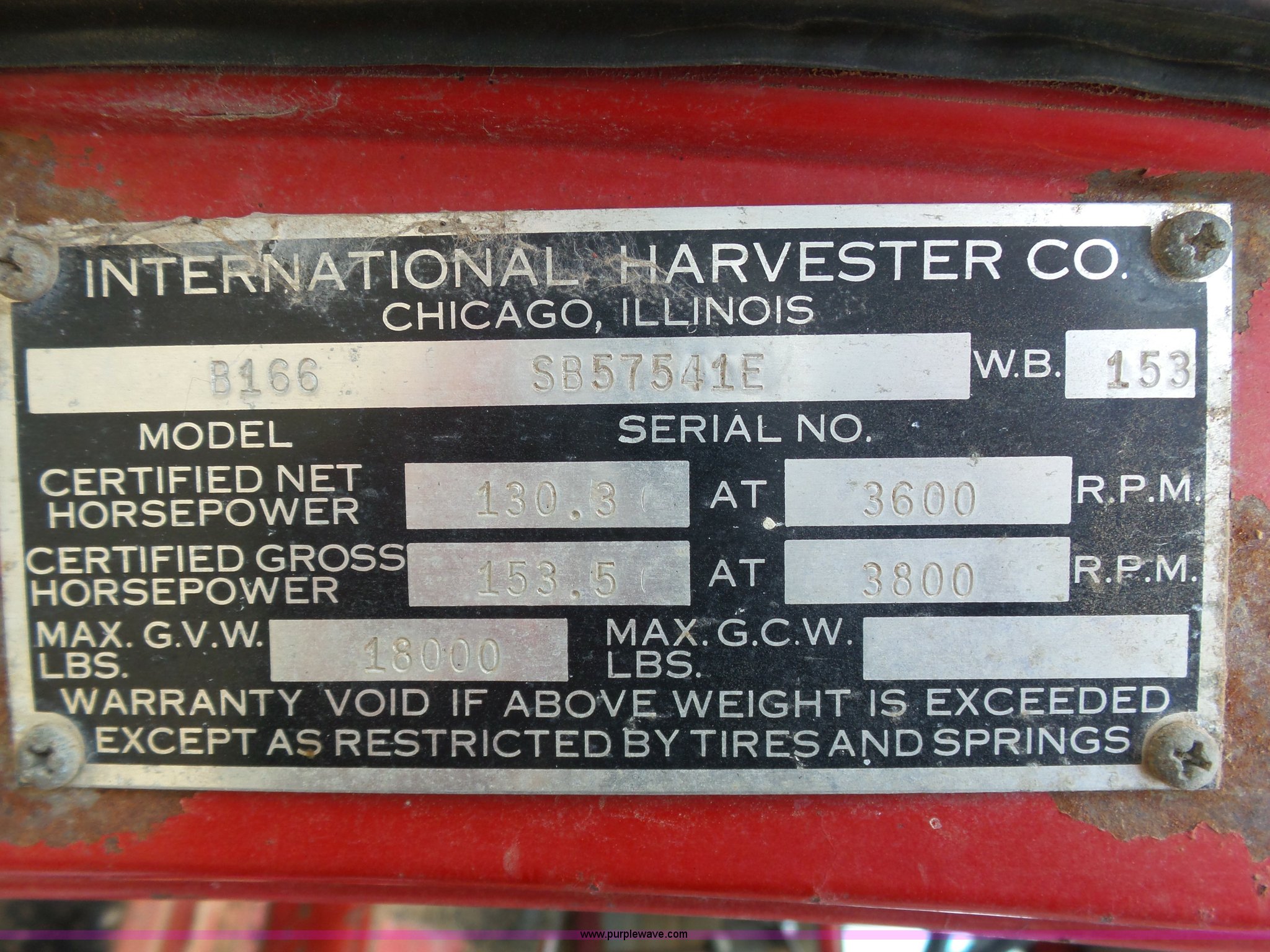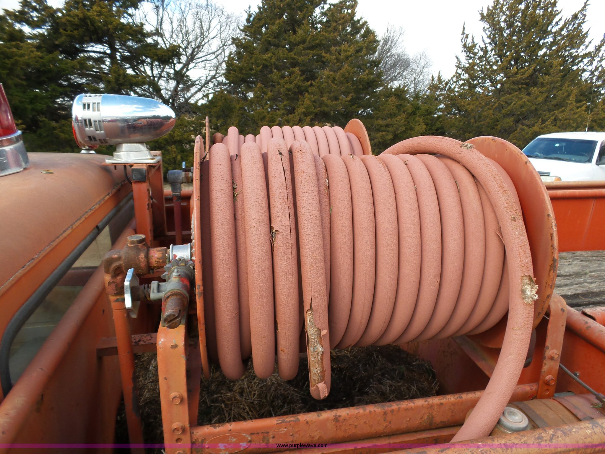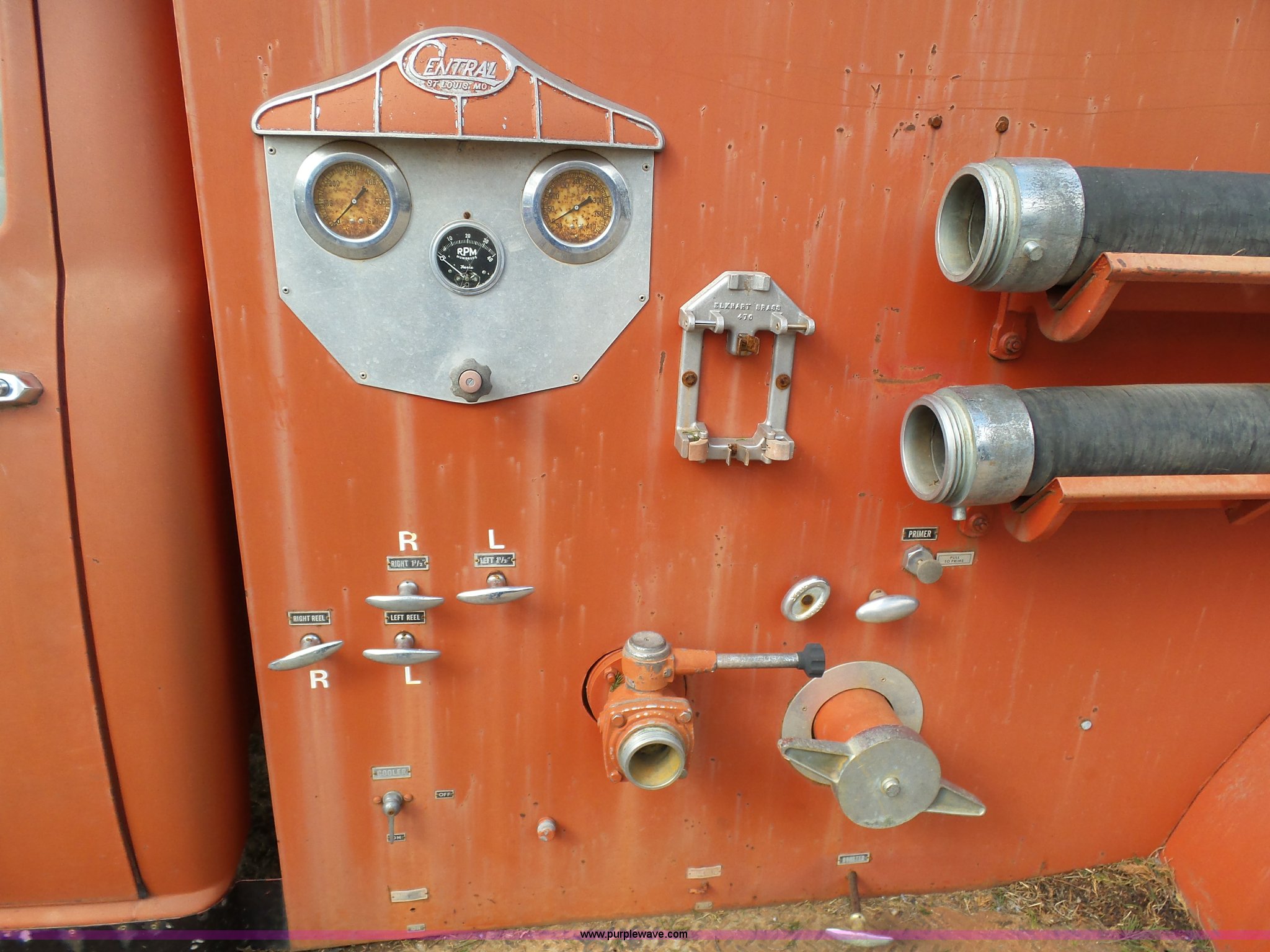 1960 International B166 fire truck. 9,796 miles on odometer, Six cylinder gas engine, Four speed manual transmission, Suspension seat, Rear work lights, Federal Sign and Signal Corp. siren, Power Light 184 light, Small pancake lights Model LL4, Model 77-GA, PTO, Central platform, Dual hose reels, Dual spotlights, Side storage racks, Right and left side discharge, Rear storage compartments, Elkhart spinner wrench brackets, Mud flaps, 153" wheelbase, 750-20 front tires, 8.25-20 rear tires, GVWR 18,000 lbs, Interior/exterior cosmetic damage, Rust, Pain chipped, Paint faded. B166SB57541E. Safe-T-Pro. 212 500 CR 61. Vici, OK 73859