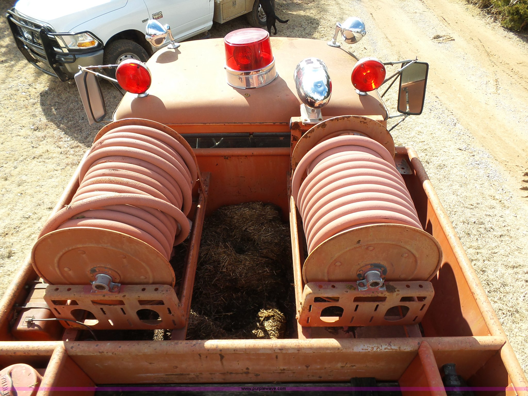 Purple Wave is selling a used Fire Truck or Emergency Vehicle in Oklahoma. This item is a 1960 International B166 fire truck with the following: 9,796 miles on odometer, Six cylinder gas engine, Four speed manual transmission, Suspension seat, Rear work lights, Federal Sign and Signal Corp. siren, Power Light 184 light, Small pancake lights, Model LL4, Model 77-GA, PTO, Central platform, Dual hose reels, Dual spotlights, Side storage racks, Right and left side discharge, Rear storage compartments, Elkhart spinner wrench brackets, Mud flaps, 153" wheelbase, 750-20 front tires, 8.25-20 rear tires, GVWR 18,000 lbs, Interior/exterior cosmetic damage, Rust, Pain chipped, Paint faded