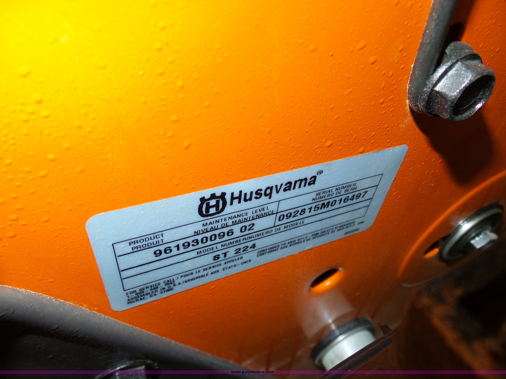 Purple Wave is selling a used Lawn and Garden in Missouri. This item is a Husqvarna ST224 snow blower with the following: 24"W, Single cylinder gas engine, Unused, Owners manual, Serial 092815M016497