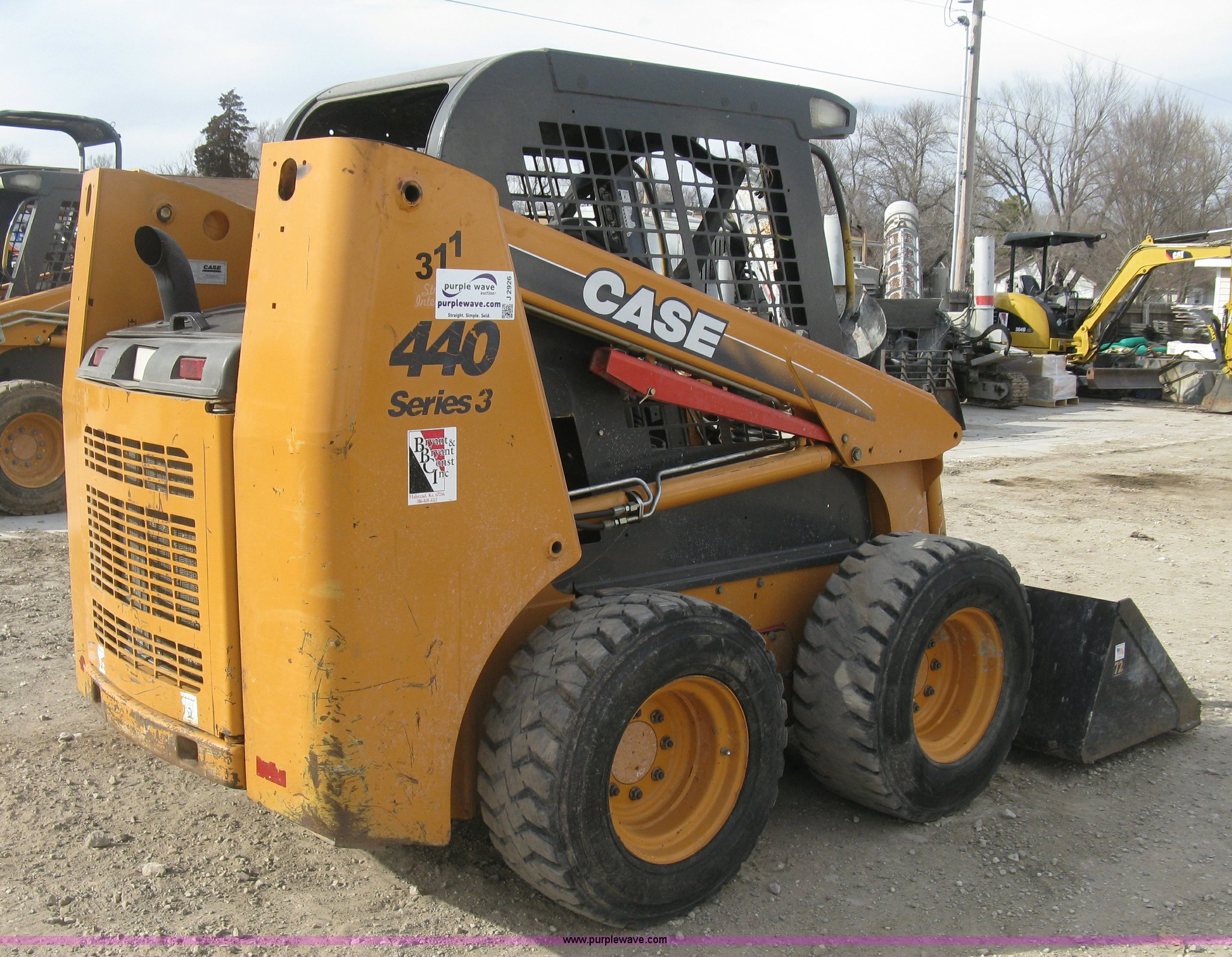 Purple Wave is selling a used Skid Steer Loader in Kansas. This item is a 2008 Case 440 Series 3 skid steer with the following: 2,903 hours on meter, Case four cylinder turbo diesel engine, Hydrostatic transmission, Open station/canopy, Joystick controls, EMS panel, Spring suspension seat, Front work lights, Block heater, Tomahawk 72"W low profile bucket, Bolt-on cutting edge, Manual quick coupler, High Flow auxiliary hydraulics, 12-16.5 NHS tires, Serial N8M492704, Unit# 311
